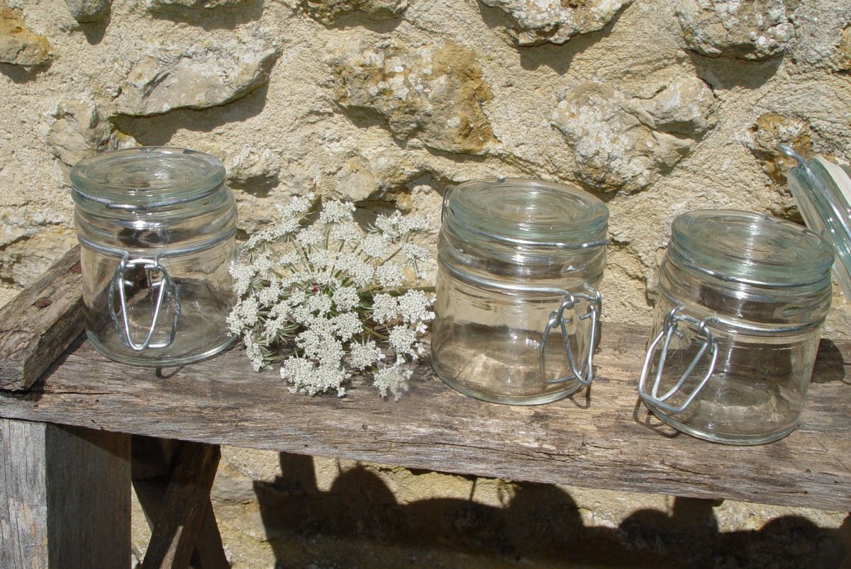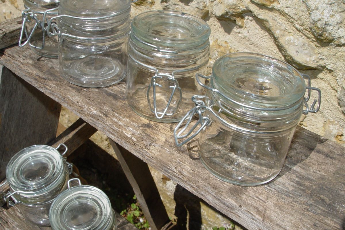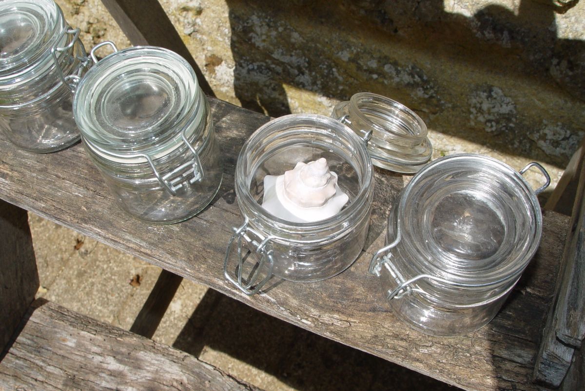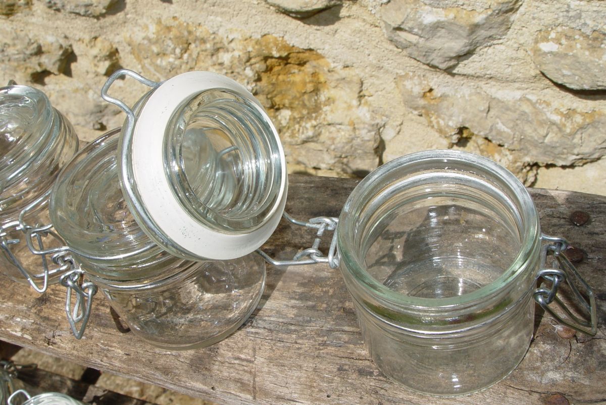 Voici 8 petits bocaux à épices en verre blanc. Ils mesurent 7 cm de haut et 6 cm de diamètre (extérieur). Ils ferment tous bien et sont en très bon état.