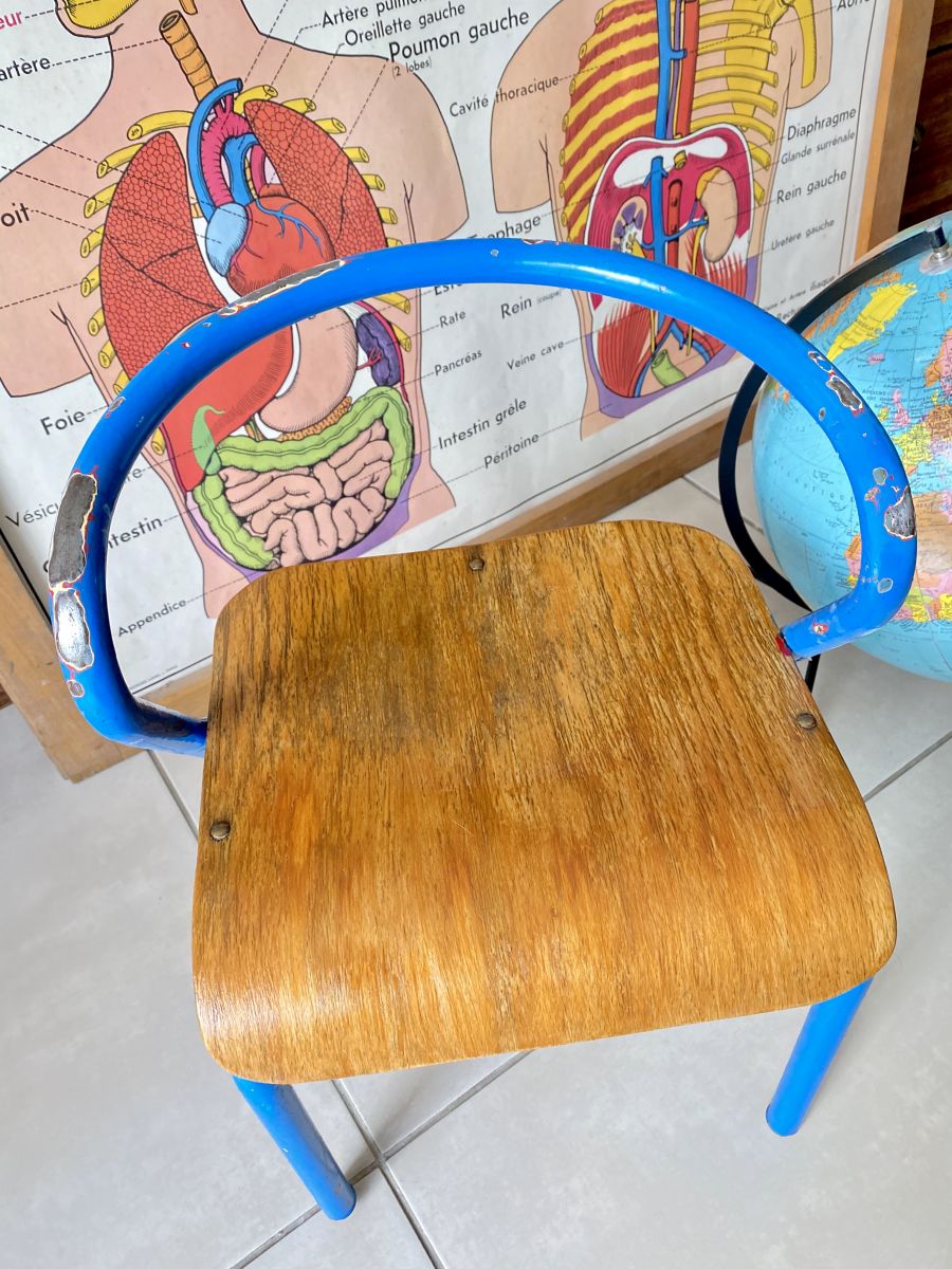 Petite chaise de maternelle des années 50-60 avec accoudoirs courbés. Tubulure métal bleue et assise bois. L’assise a été poncée et vernis. La peinture présente quelques éclats sur les parties métal. Stable, robuste et à la fois légère, elle trouvera parfaitement sa place dans la chambre d’un enfant. Assise: prof 30cm - larg 30cm - haut assise 29cm hauteur totale: 46cm.