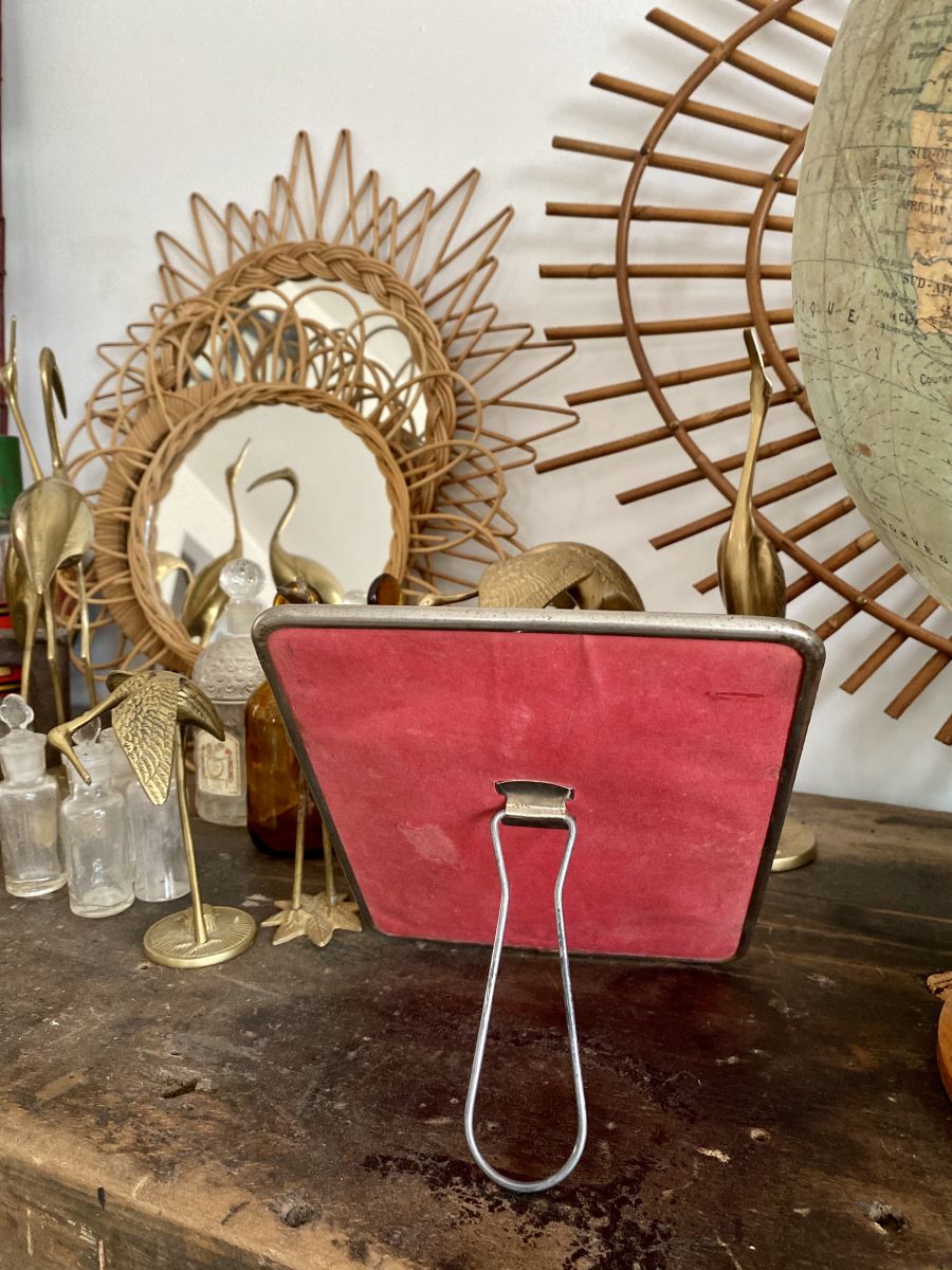 Très joli miroir de barbier vintage des années 50/ 60. C'est une adorable pièce vintage idéale pour apporter une touche rétro dans un intérieur. Les bords du miroir présentent des traces d'oxydation. Le dos du miroir en carton rouge est dans son jus. Miroir d'origine avec des petites traces d'usure.
