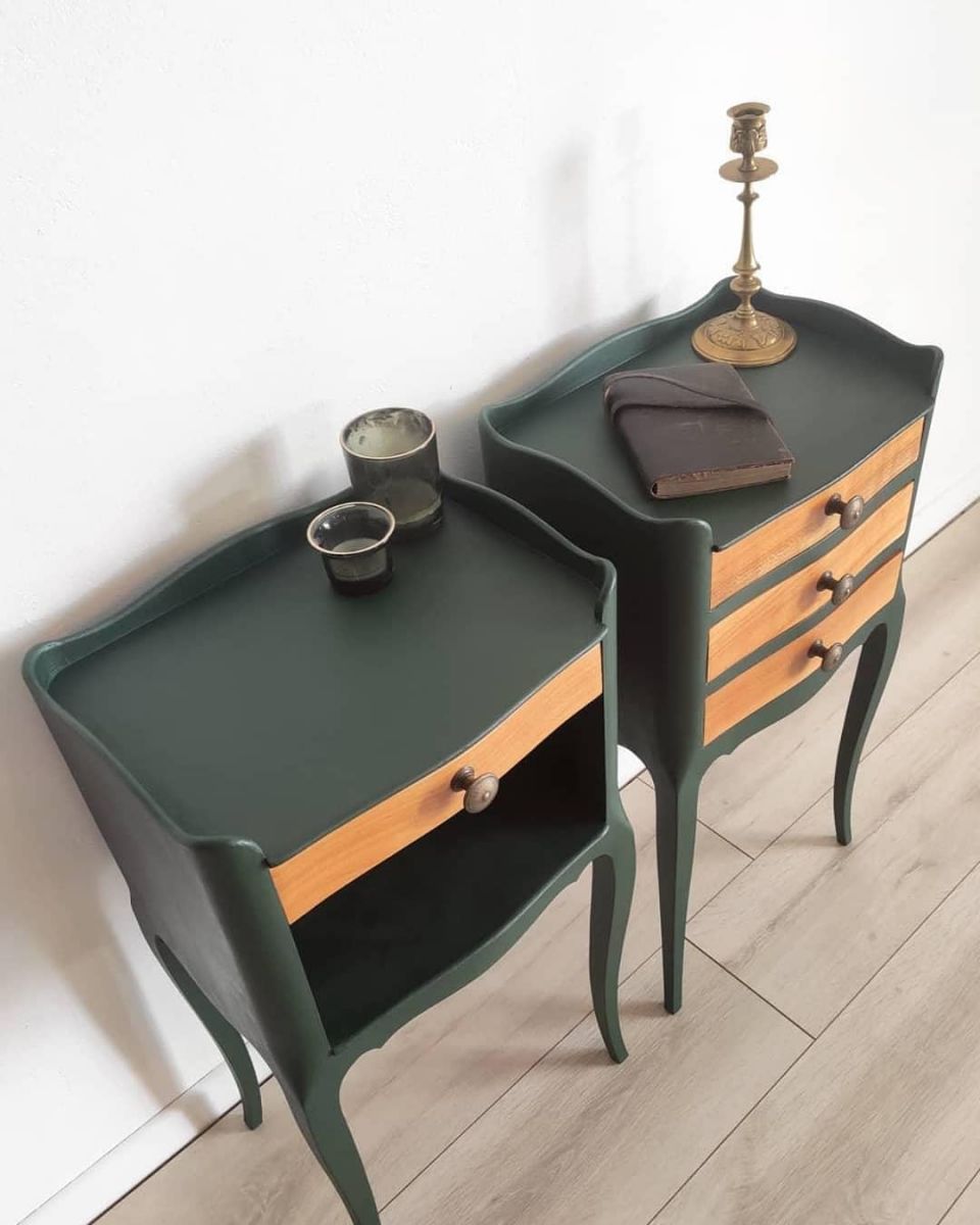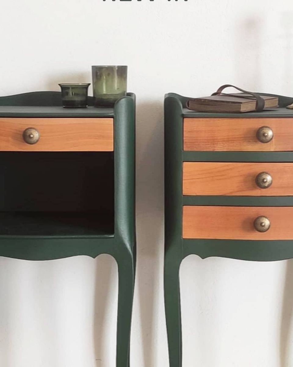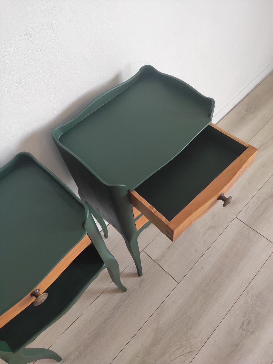 Paire de table de chevet en bois style louis XV. Un chevet avec un tiroir et l'autre chevet avec trois tiroirs qui fonctionnent parfaitement. Rénovées avec peinture a la craie et finition vernis mat.