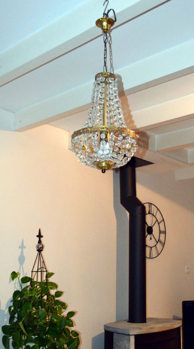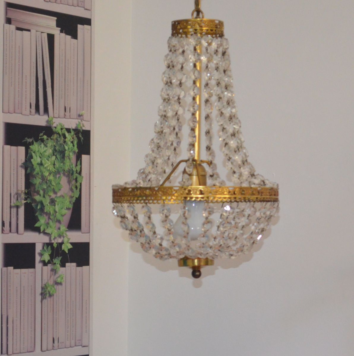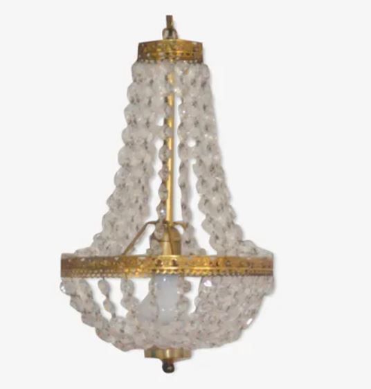 Lustre mongolfière en laiton et cristal, d'origine. Aucune pampille manquante. Quelques traces d'usure liée à son âge.