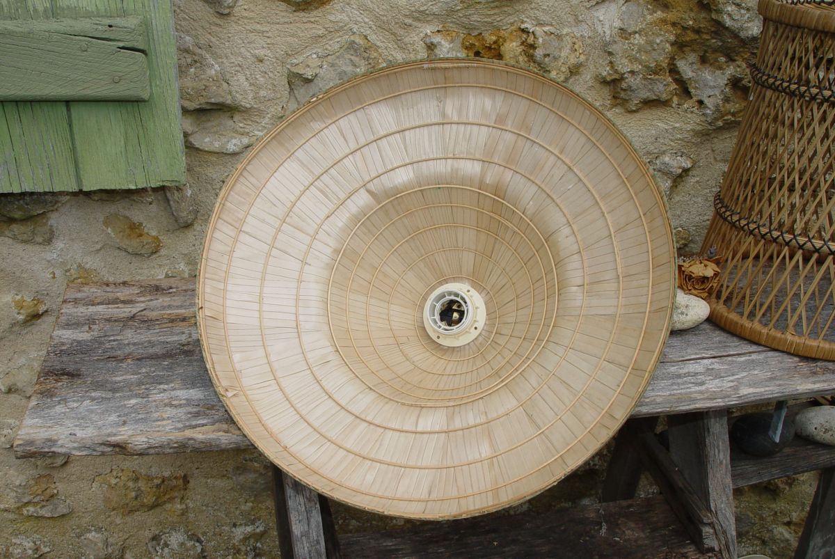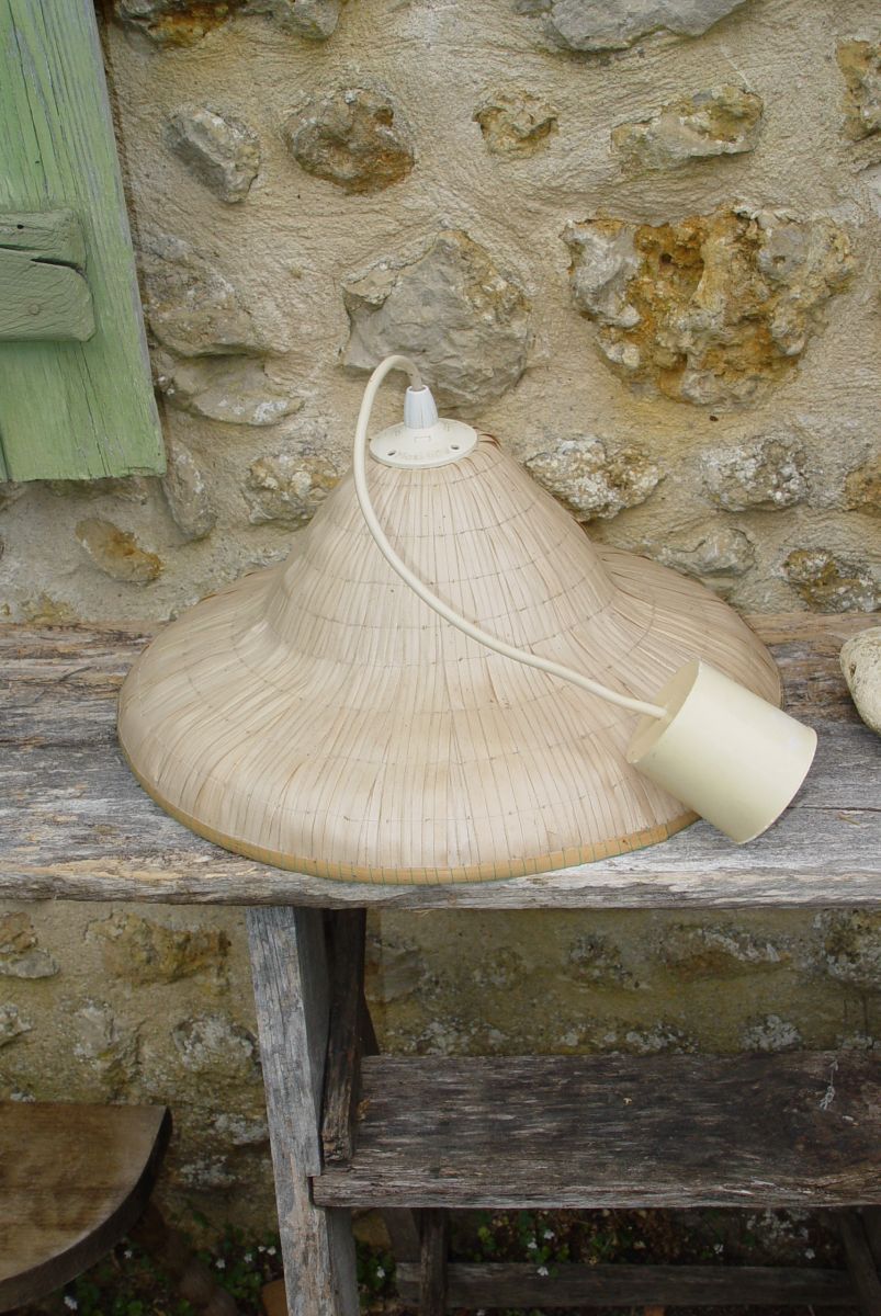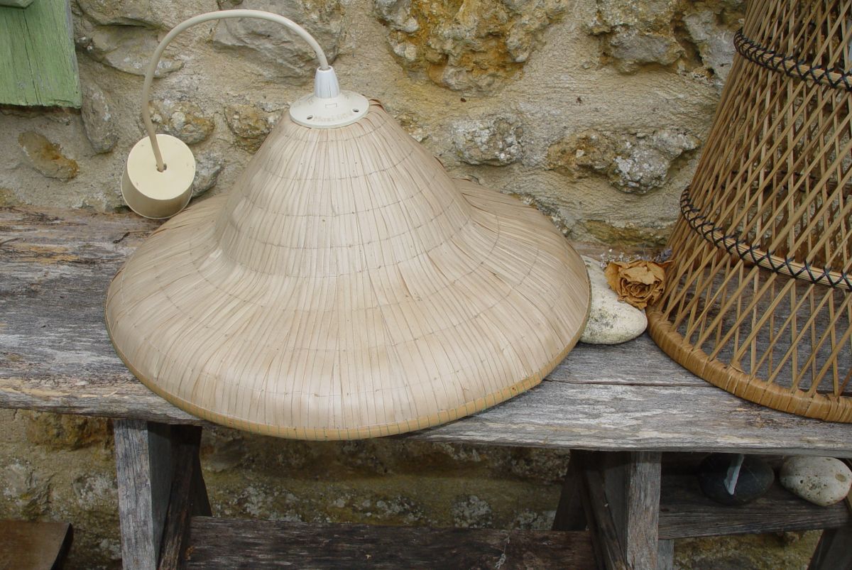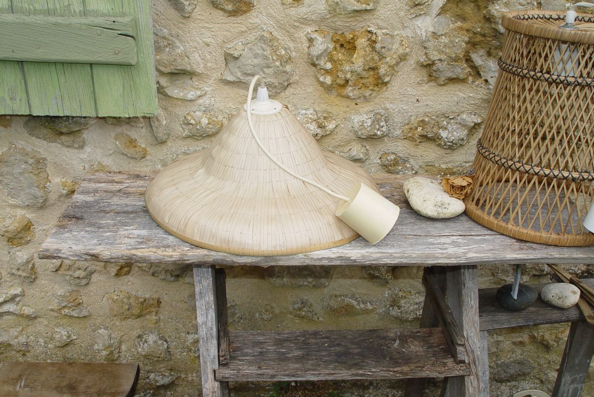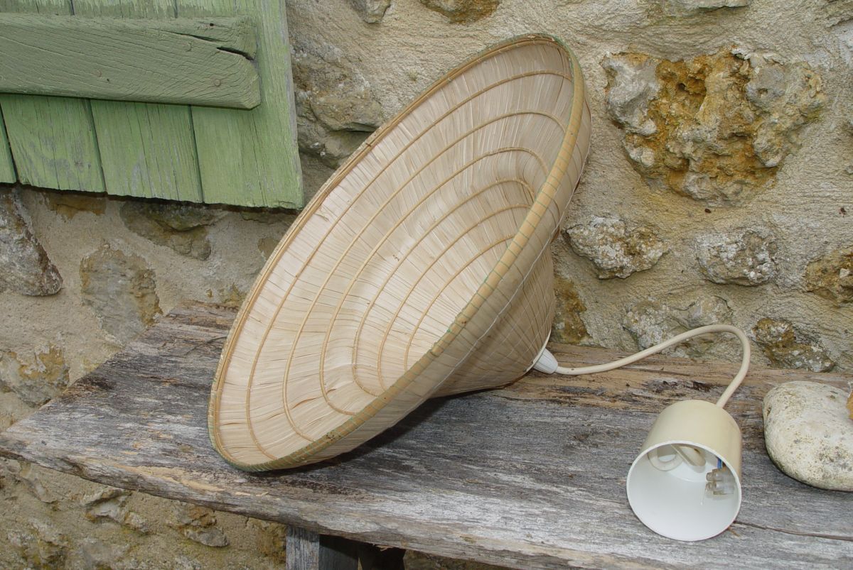 Voici une suspension soigneusement réalisée à partir d'un chapeau en paille de riz rapporté d'un voyage au Vietnam.