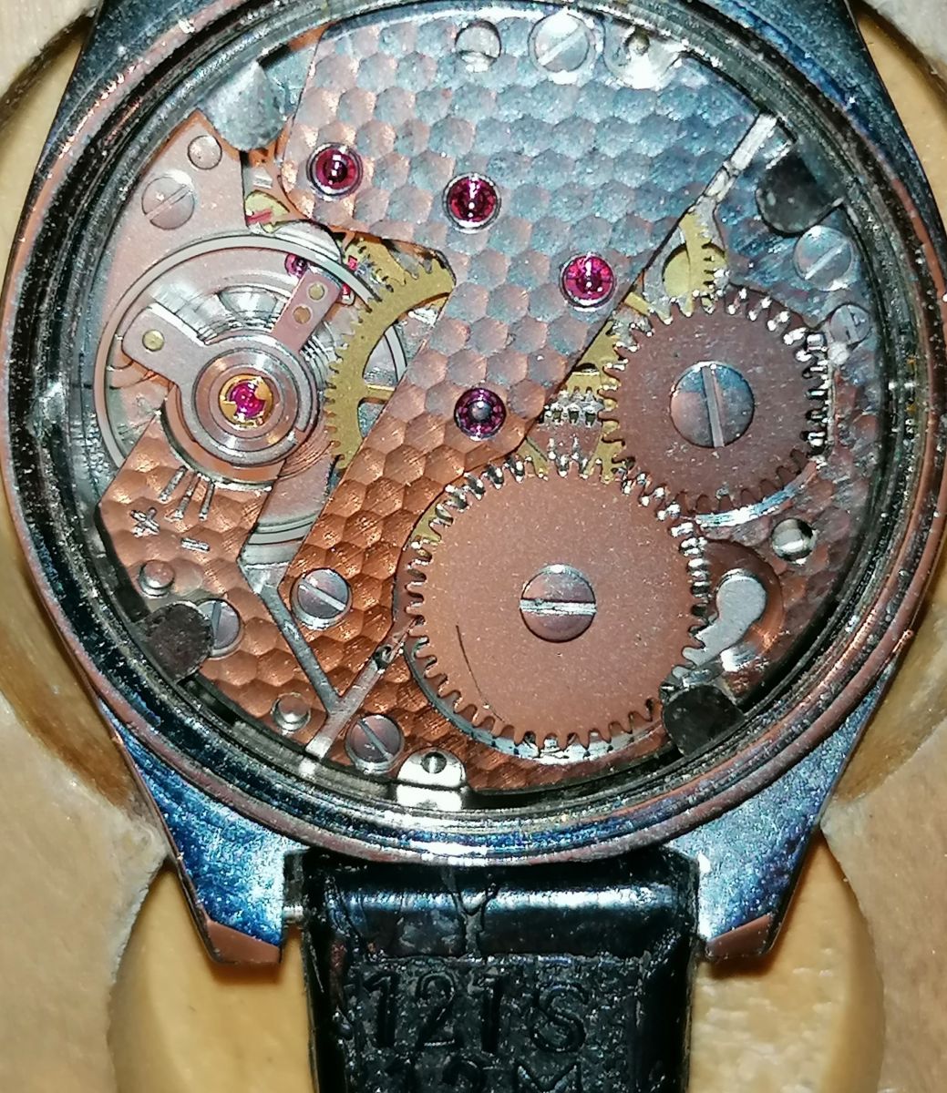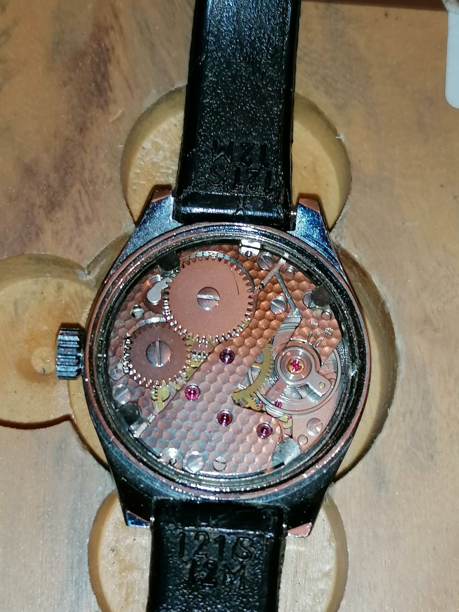 Une montre avec bracelet noir, elle est mécanique et à 17 jewels , fonctionne mais mérite un petit nettoyage. Elle date un peu.
