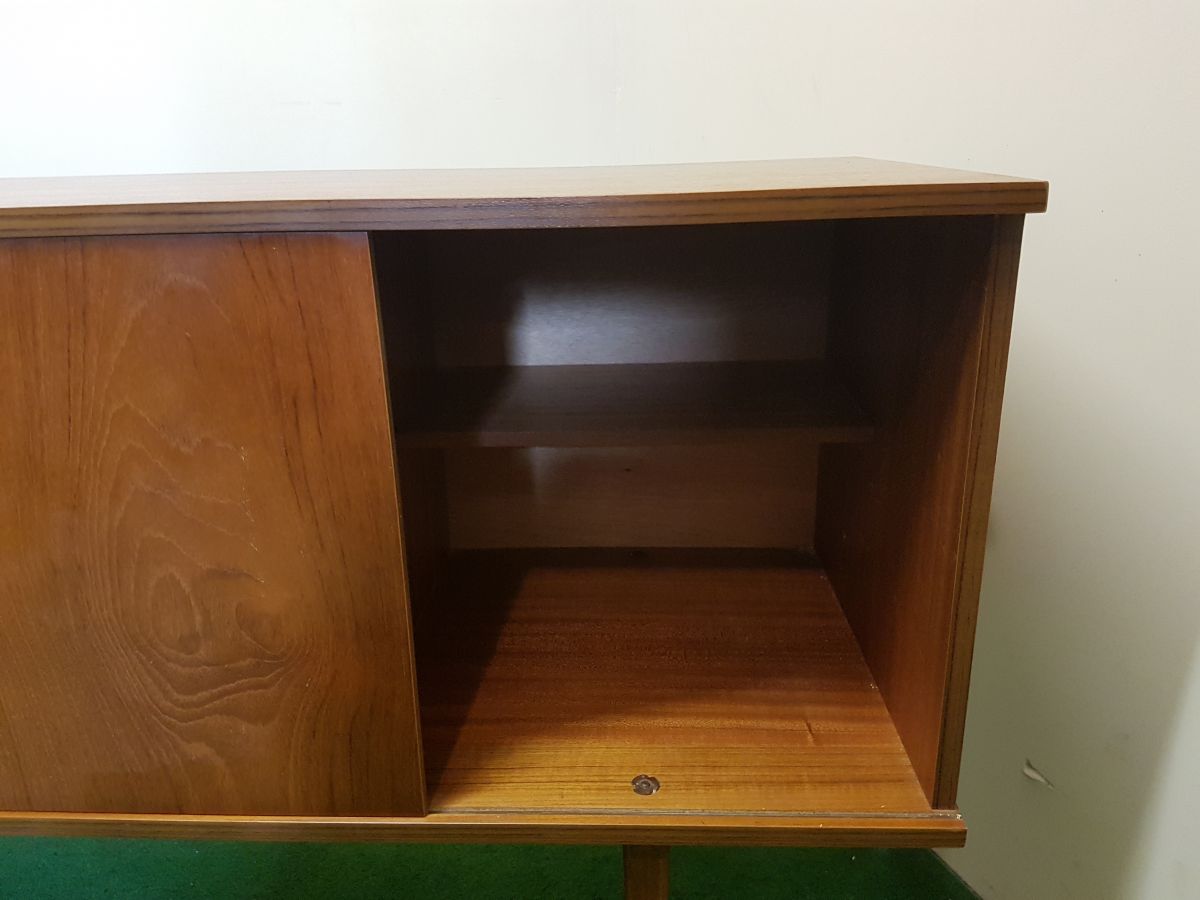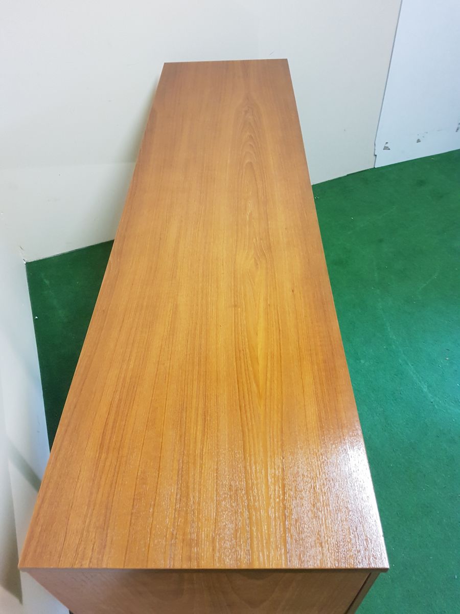 Jolie enfilade en teck vintage de chez Avalon des années 60,elle se compose de 2 portes coulissantes qui encadrent 3 tiroirs. Meuble de ligne très sobre qui saura s'intégrer dans tous les interieurs.