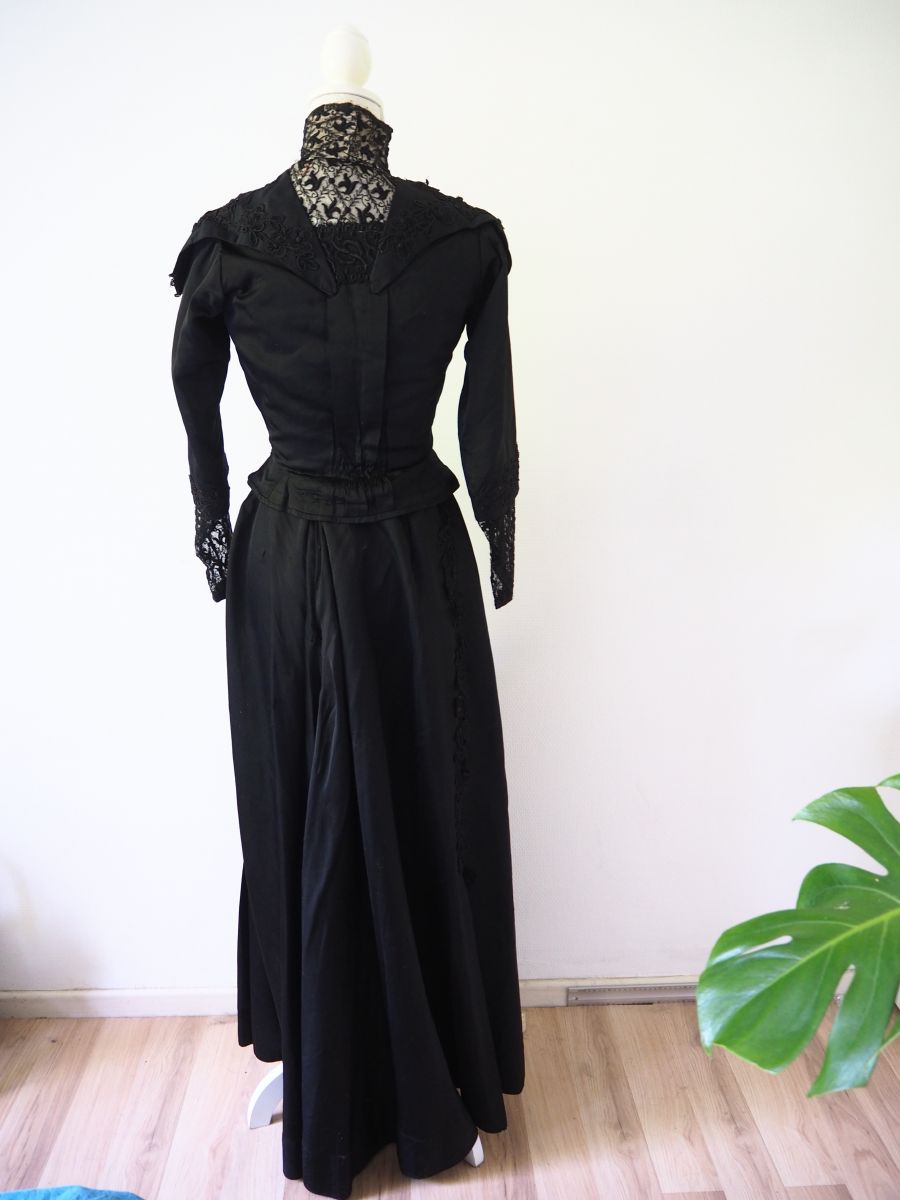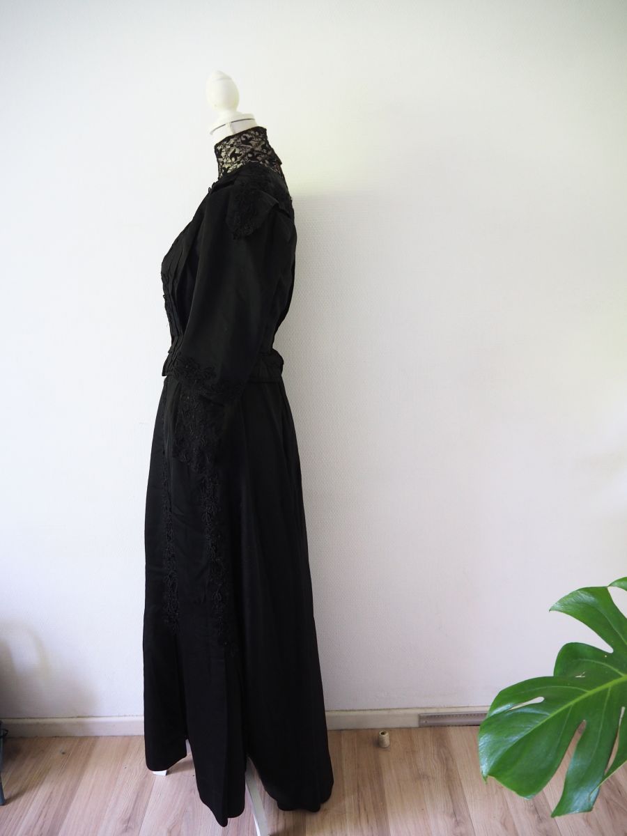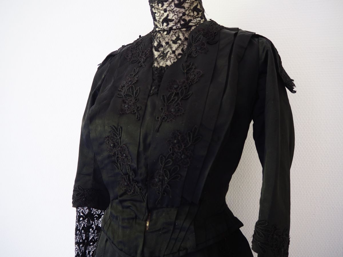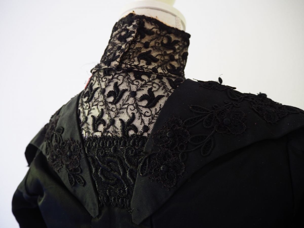 Les manches et le col haut sont tout en transparence, une dentelle noire finement brodée et en parfait état de conservation.