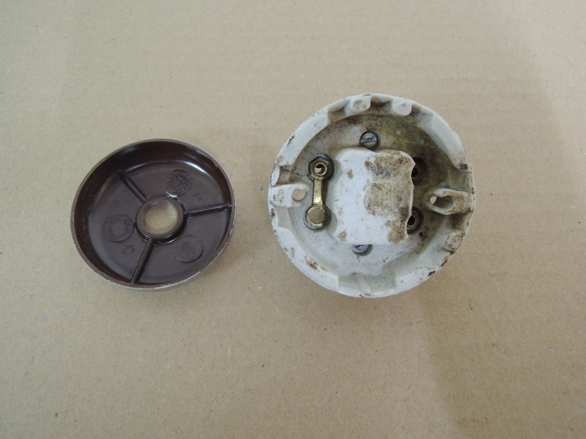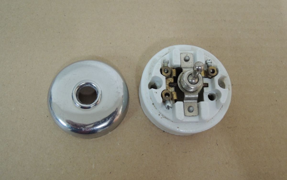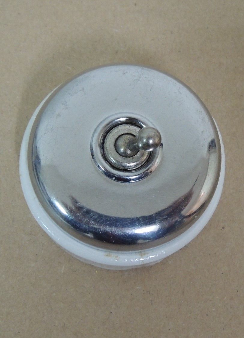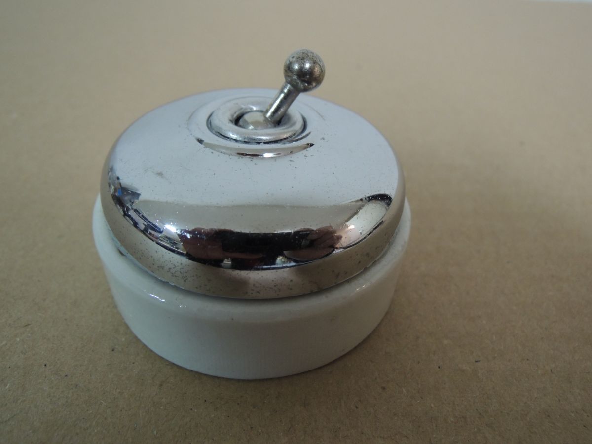 Interrupteur à bascule, avec possibilité de le faire fonctionner en va et vient . Base céramique et coupelle en métal chromé avec revêtement intérieur plastifiée en rôle d'isolant. Traces d'usure normale sur le chrome et un petit éclat sur la céramique