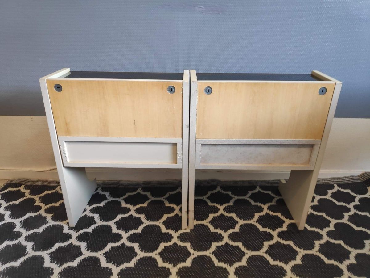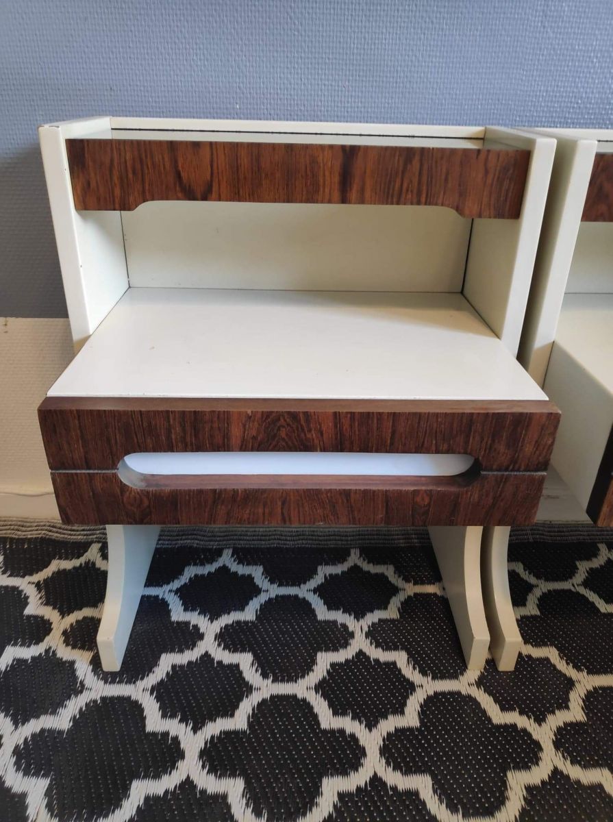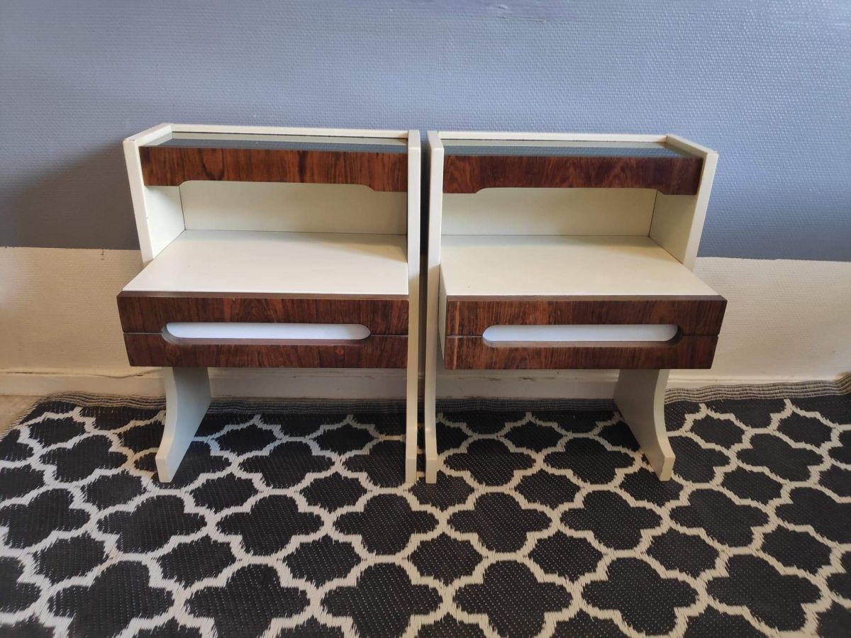 chevets vintage en tek et laminé blanc avec tablette verre