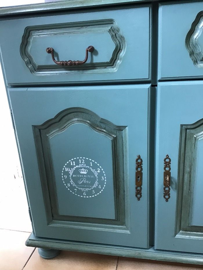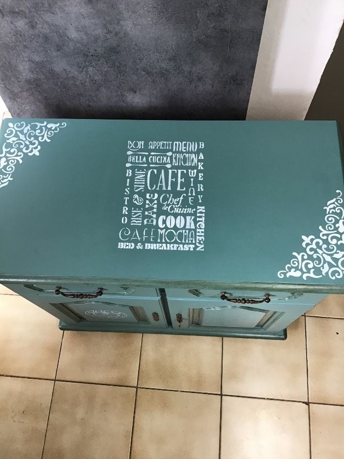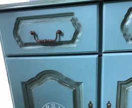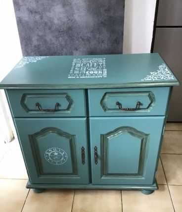 Meuble de cuisine ancien peint en vert/bleu avec patine a la cire black