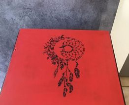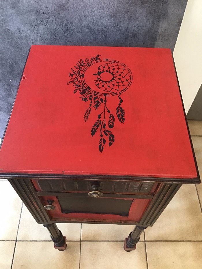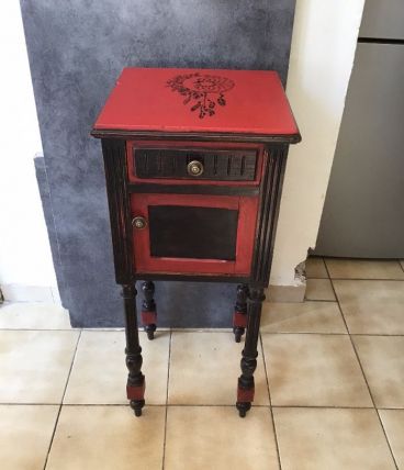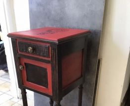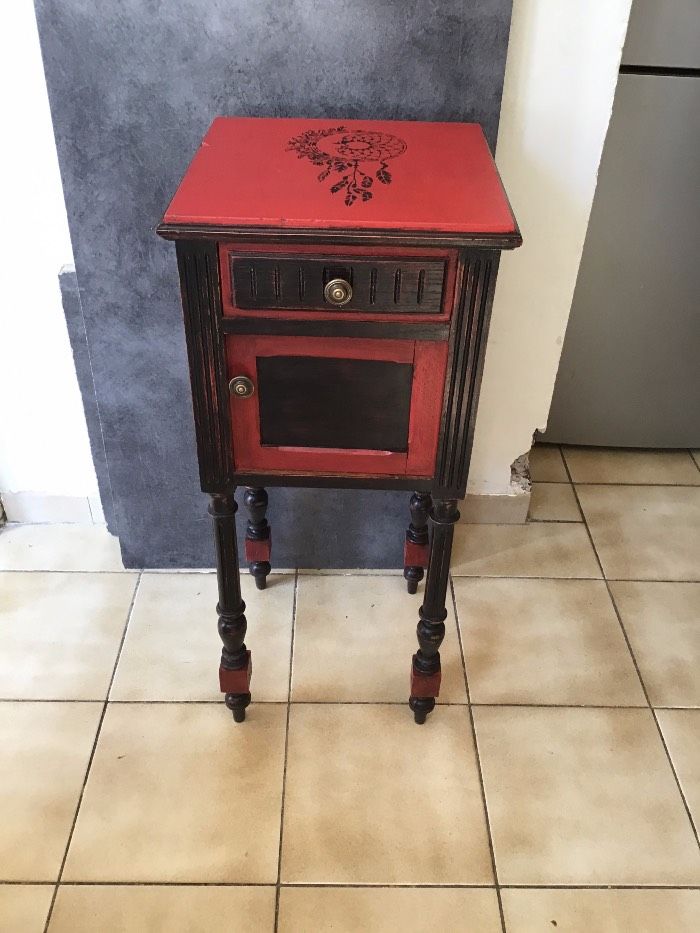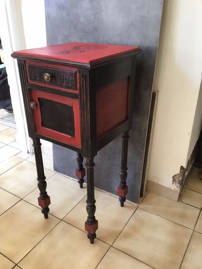 ancienne table de chevet peint en rouge et noir avec décoration au pochoir