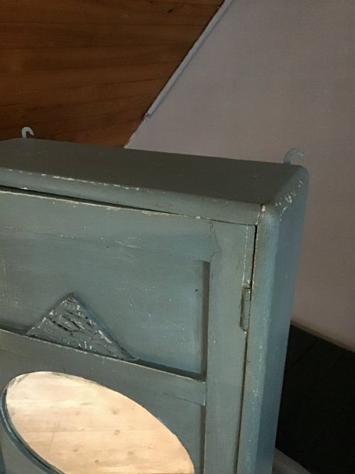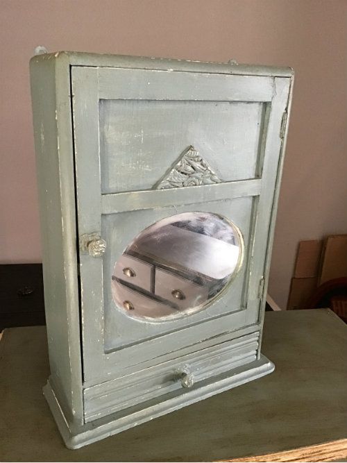 ancienne armoire de toilette peint en vert/gris patiné a la cire brown
