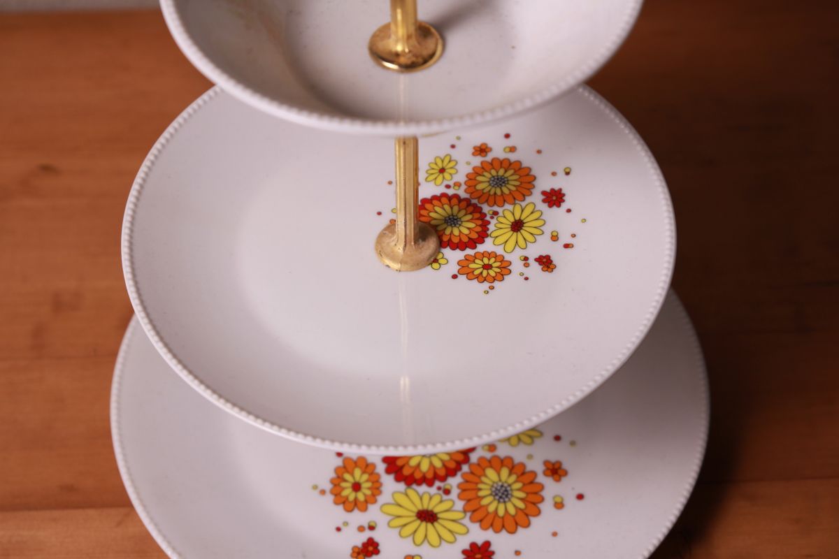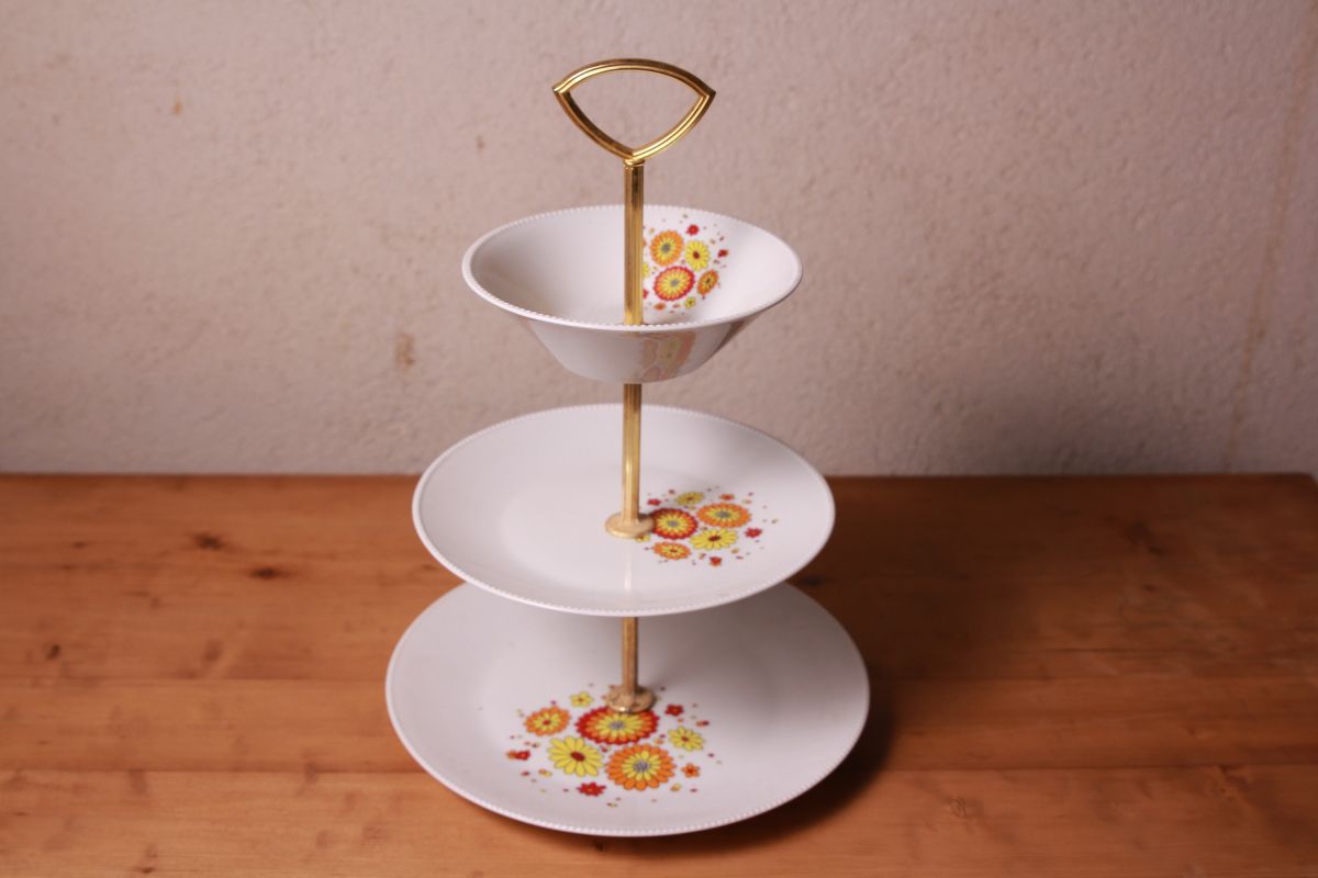 Plat en céramique 3 assiettes avec fleurs jaunes,oranges, rouges. Assiettes en excellent état, trace d'usure sur le manche doré. dimensions a reconfirmer.