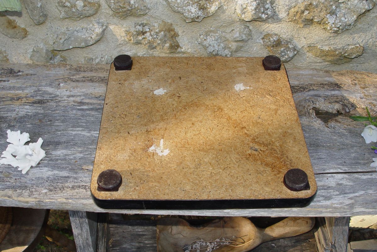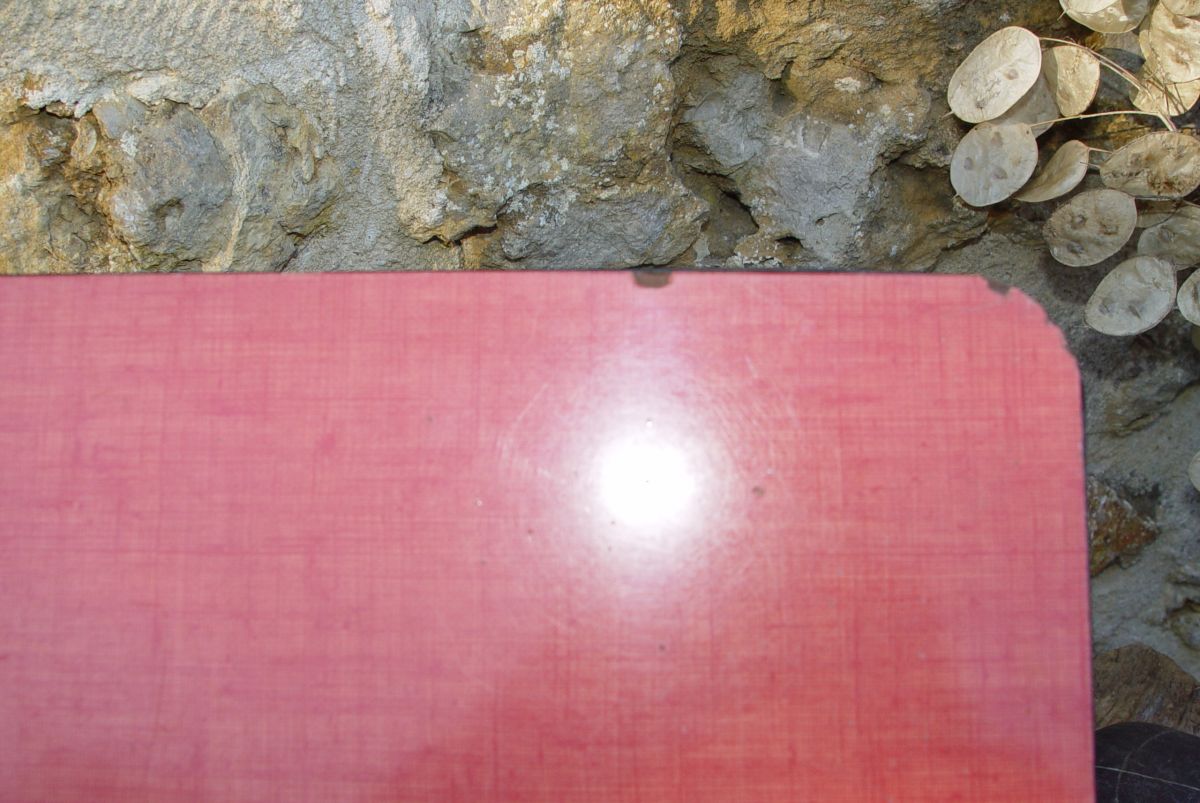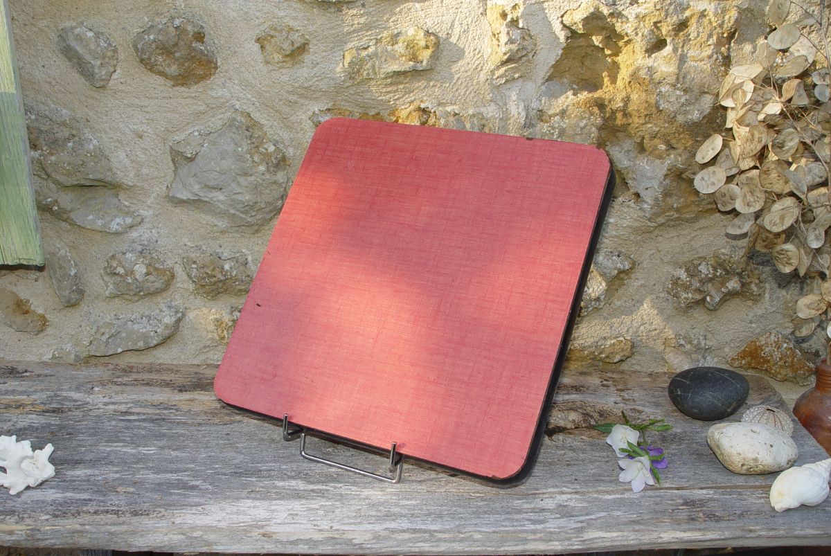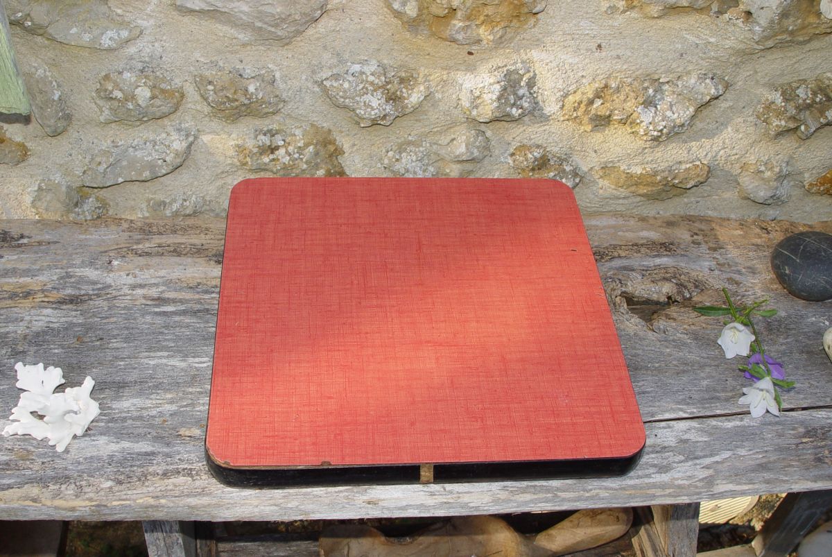 Voici un grand dessous de plat vintage en formica rouge à contour noir. Il est en bon état, quelques petits éclats dans le formica seulement (voir photos).