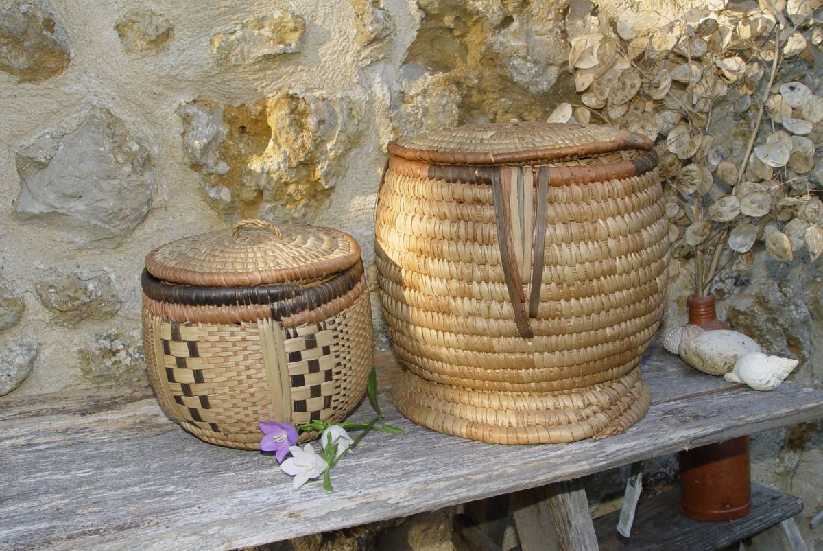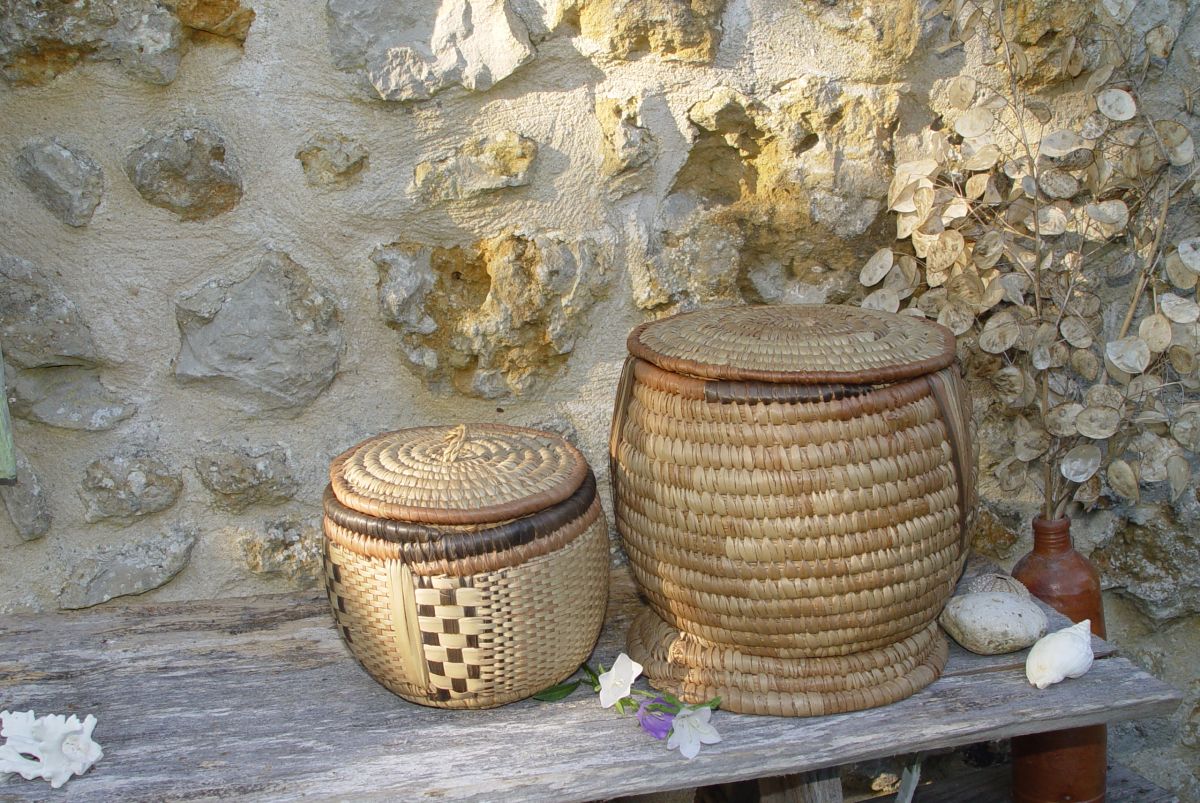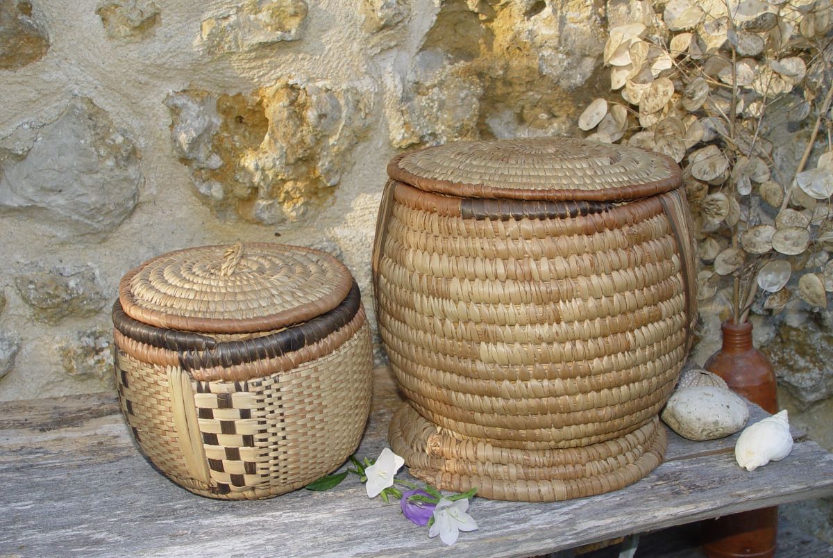 Voici 2 très jolis paniers en paille torsadée à motifs géométriques.