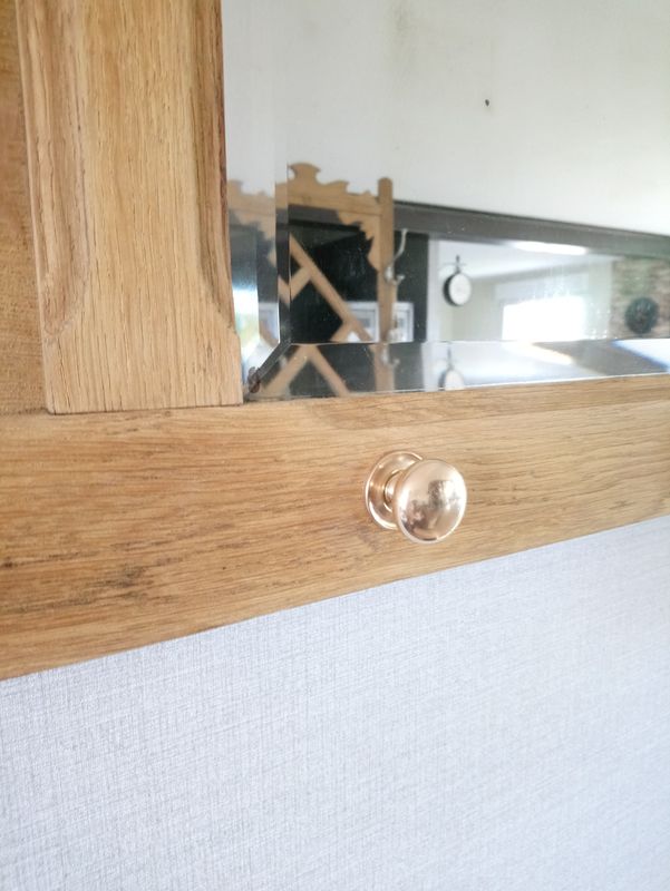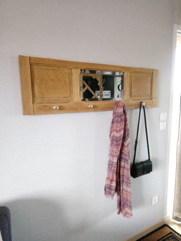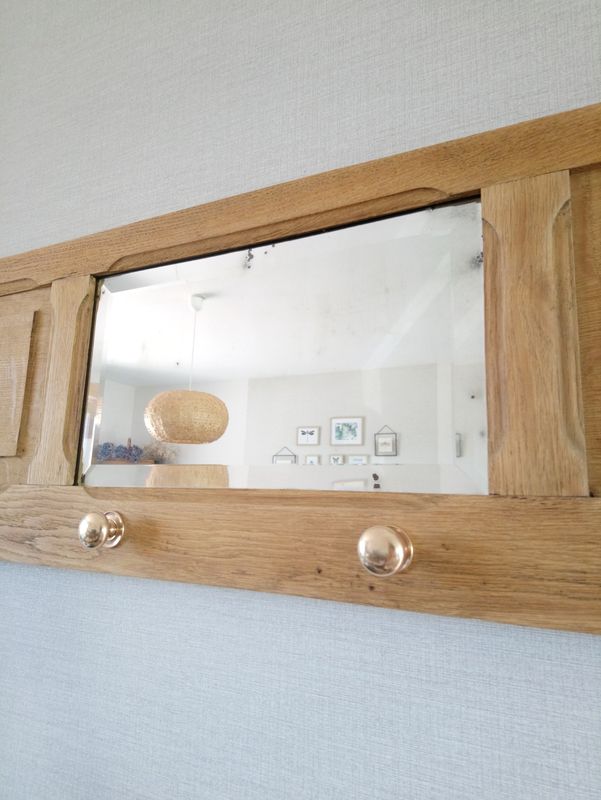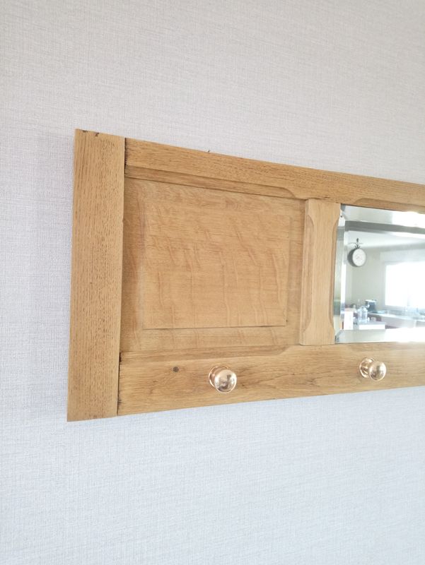 Porte manteaux en chêne massif, vitrifié incolore mat, anciennes patères en laiton nettoyées pour leurs redonner toutes leur brillance! Miroir biseauté légèrement piqueté qui lui fait tout son charme.Idéal déco campagne chic, champêtre.