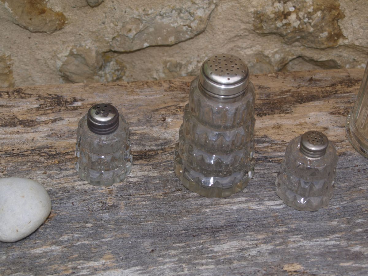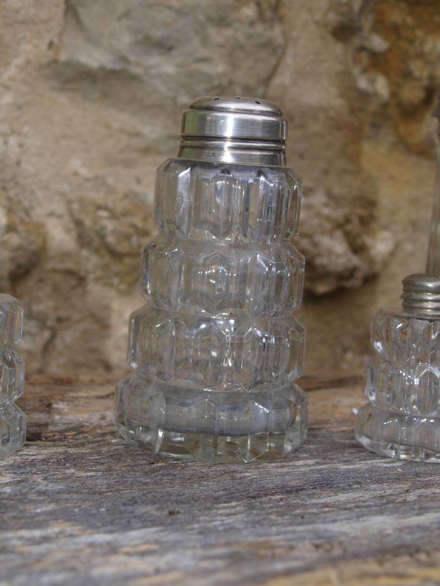3 saupoudreuses sel-poivre-sucre anciennes en verre taillé