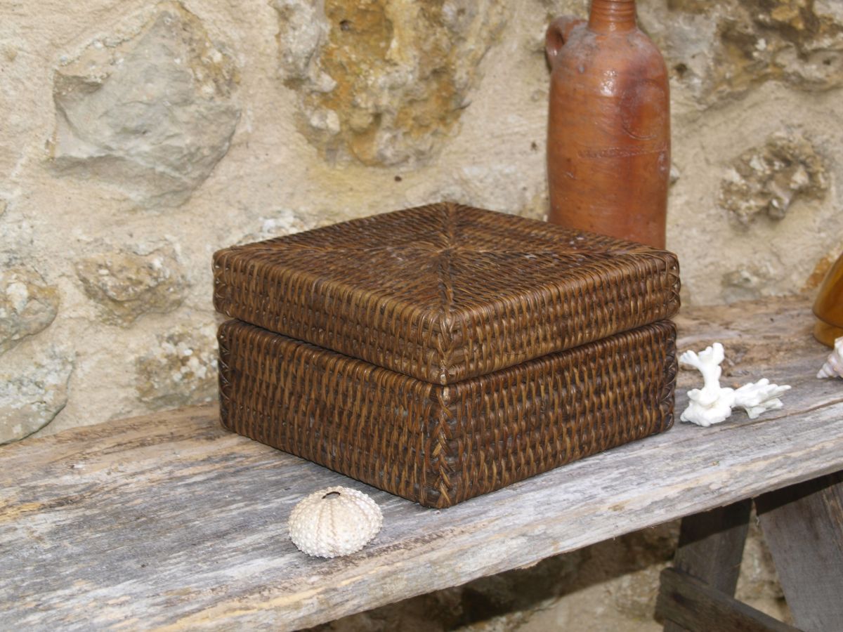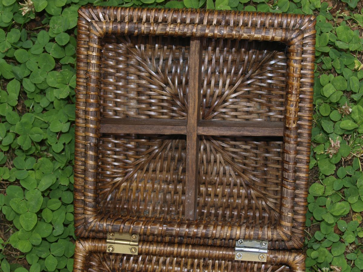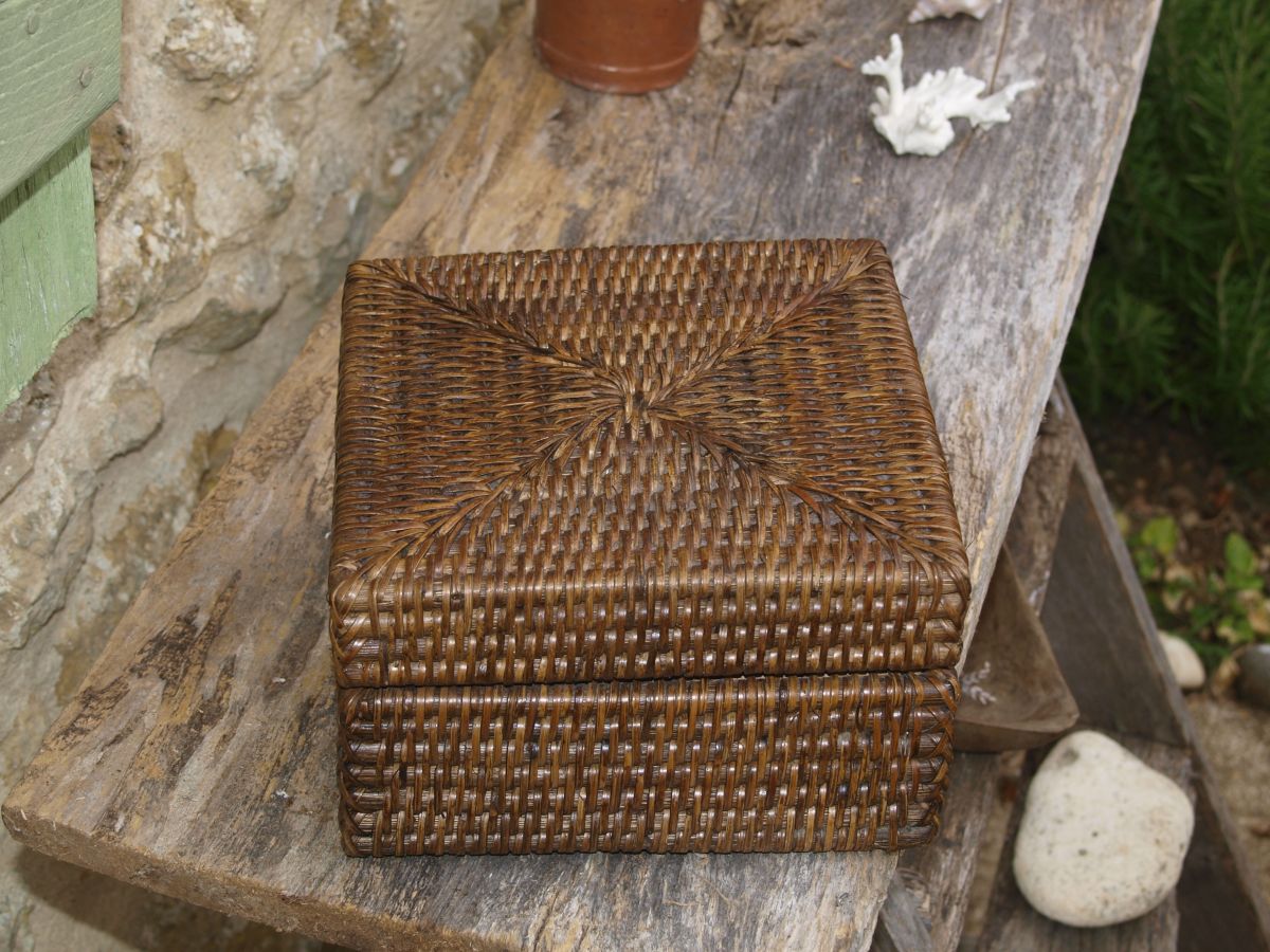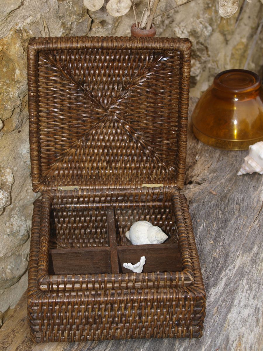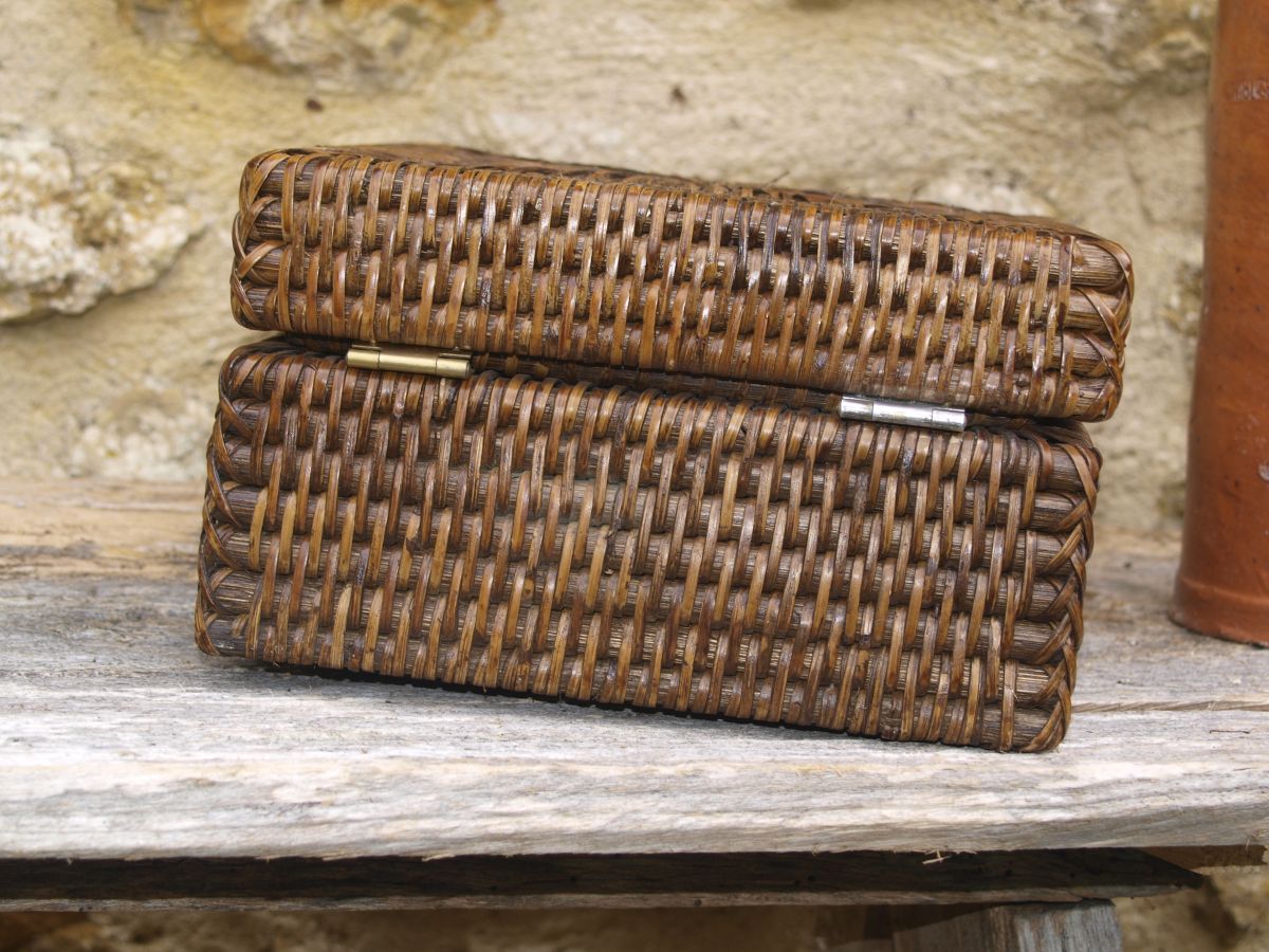 Voici une boîte vintage à 4 compartiments. Elle est réalisée en rotin brun. C'est de la très jolie vannerie, bien serrée et bien solide. Elle est en très bon état. (A noter une différence de couleur de métal entre les 2 charnières mais toutes deux en très bon état).