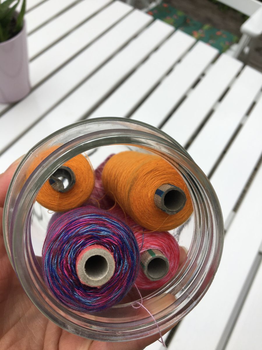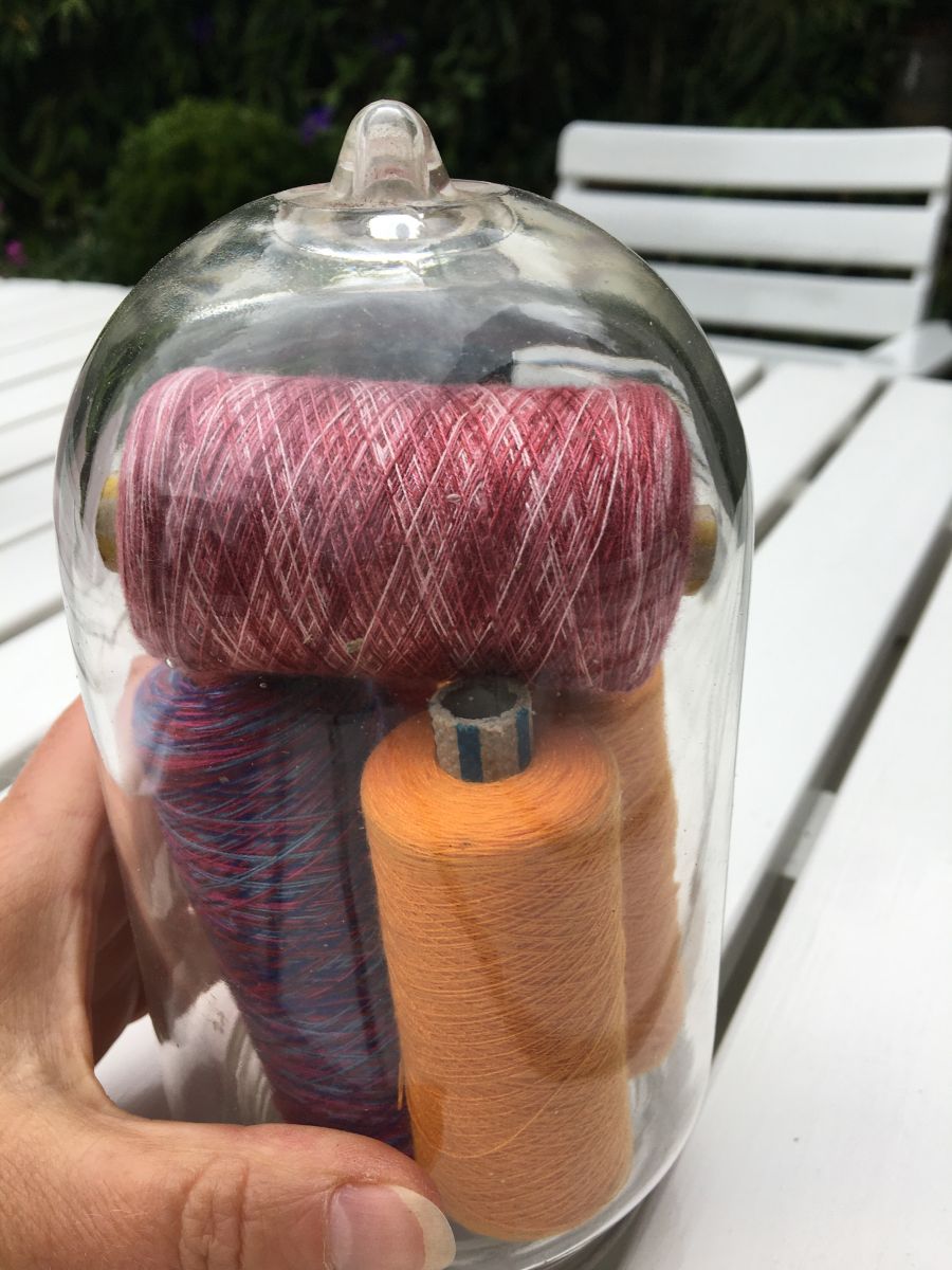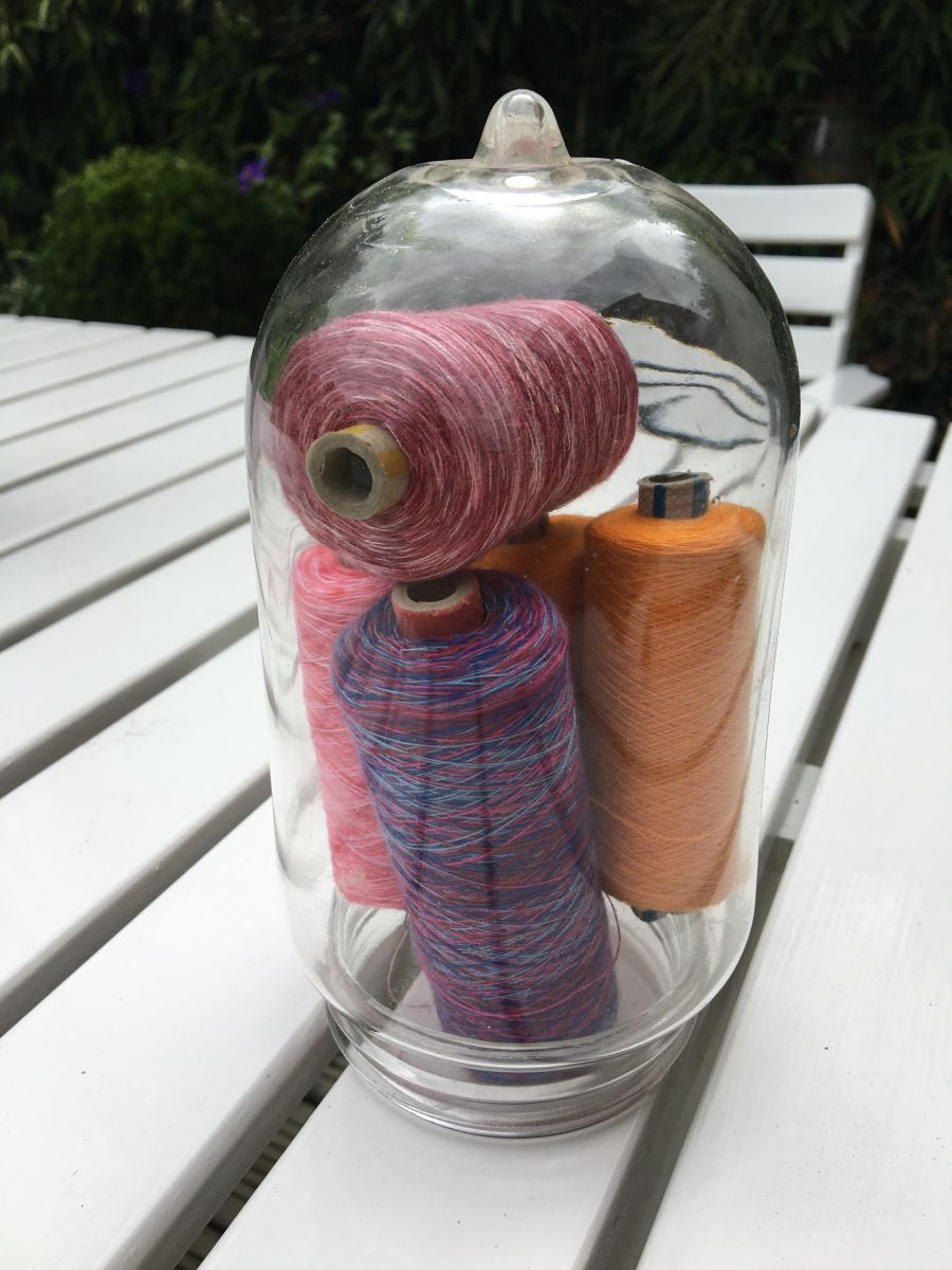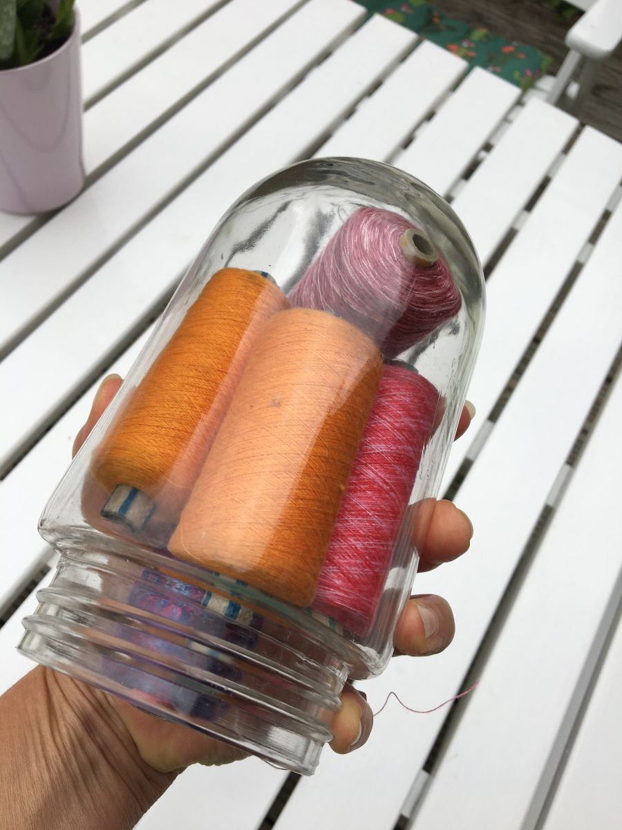 Joli globe verre avec 5 anciennes bobines de fil carton