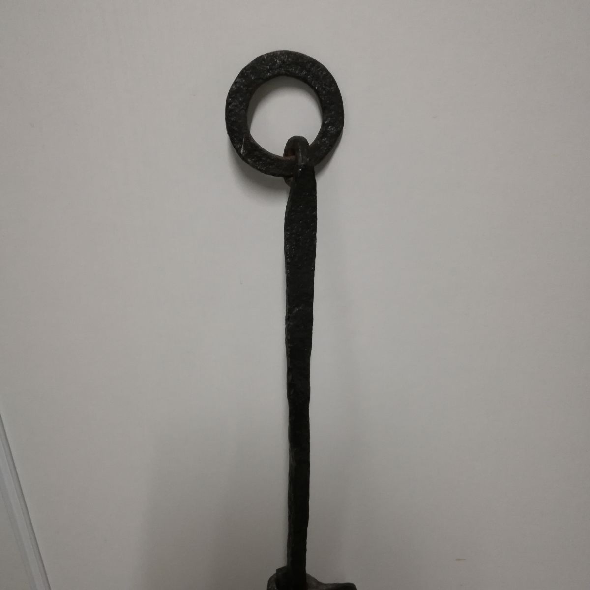Anneau rond pour la fixer dans la cheminée et crochet en partie basse pour passer l'anse de la marmite.