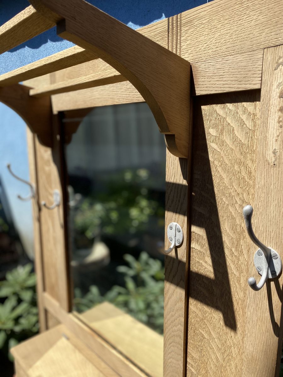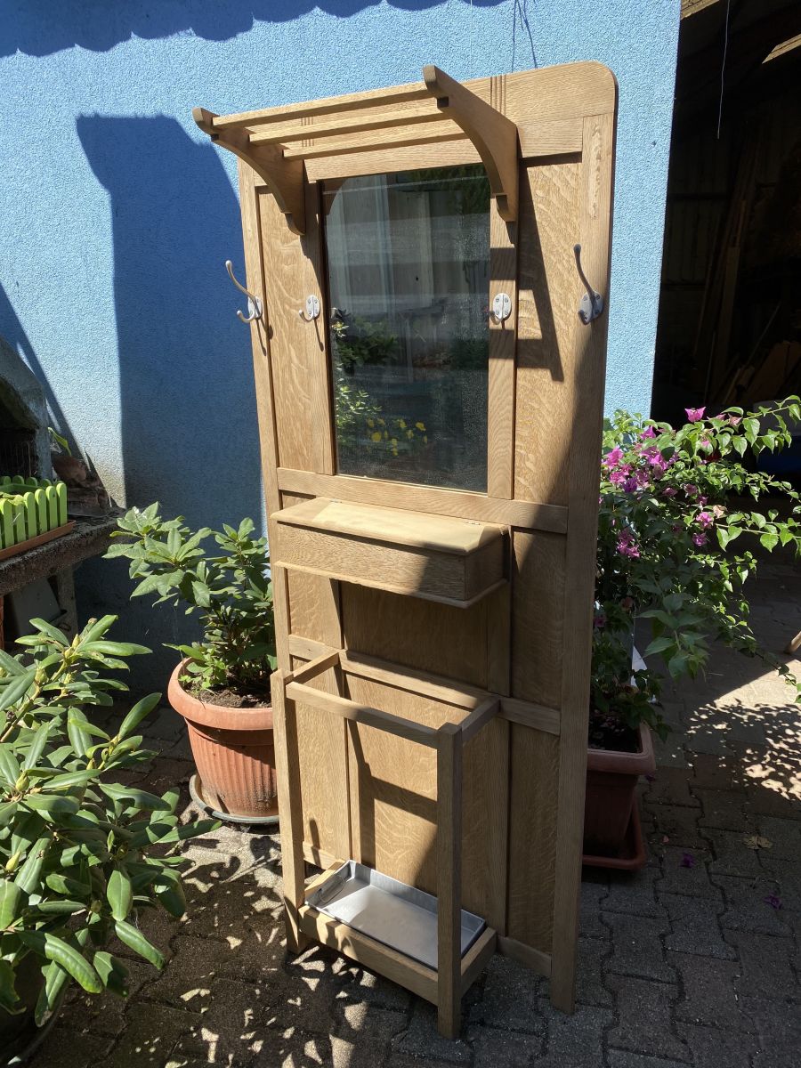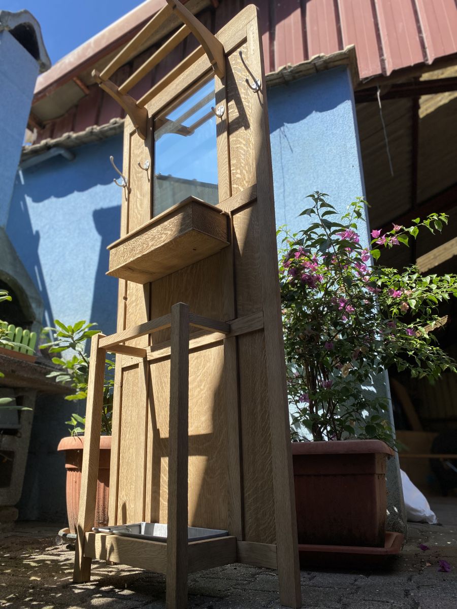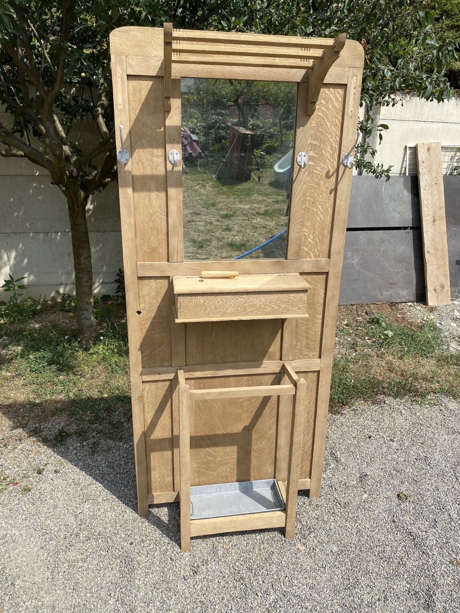 Un range clé. Un porte parapluie associé à un bac de récupération en métal amovible et très pratique. 4 crochets pour manteaux. A séjourné pendant de longues années au fond d'un grenier, a donc bien été conservé, le miroir présente quelques petites tâches noires, preuve de son belle âge.