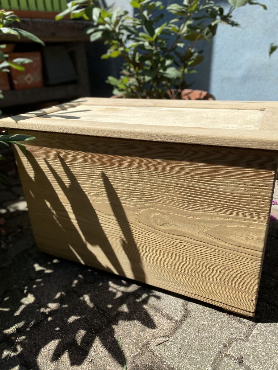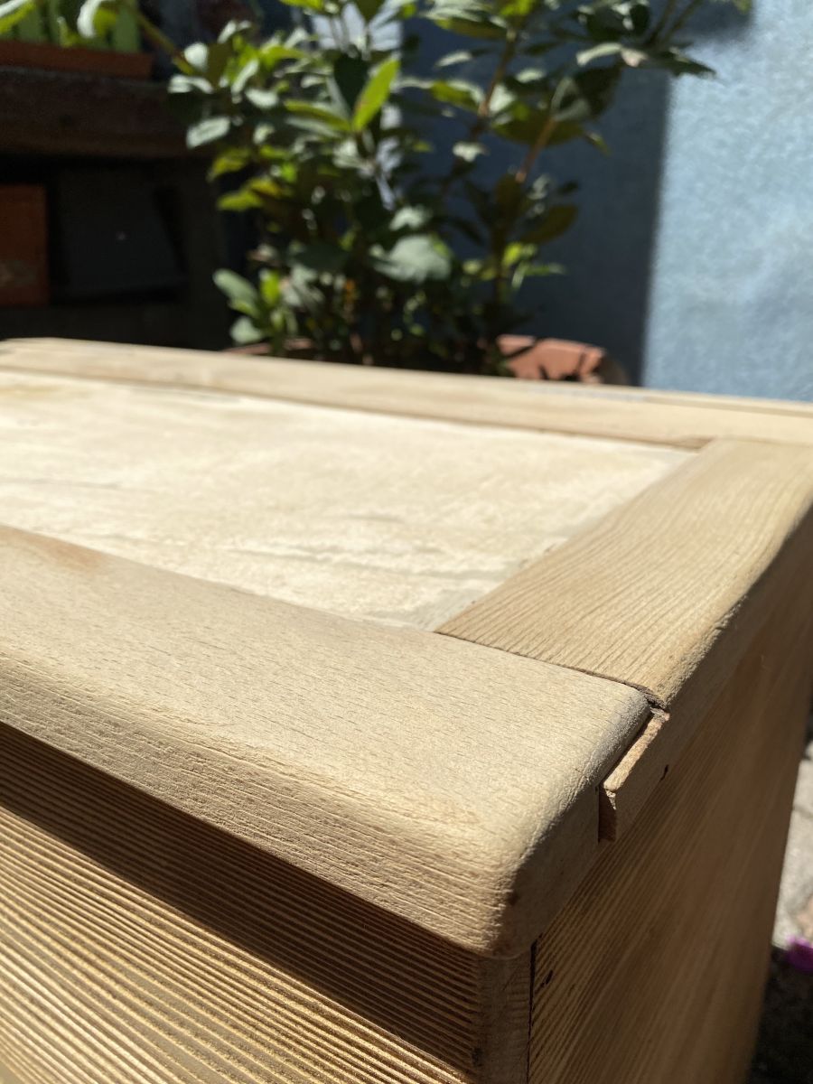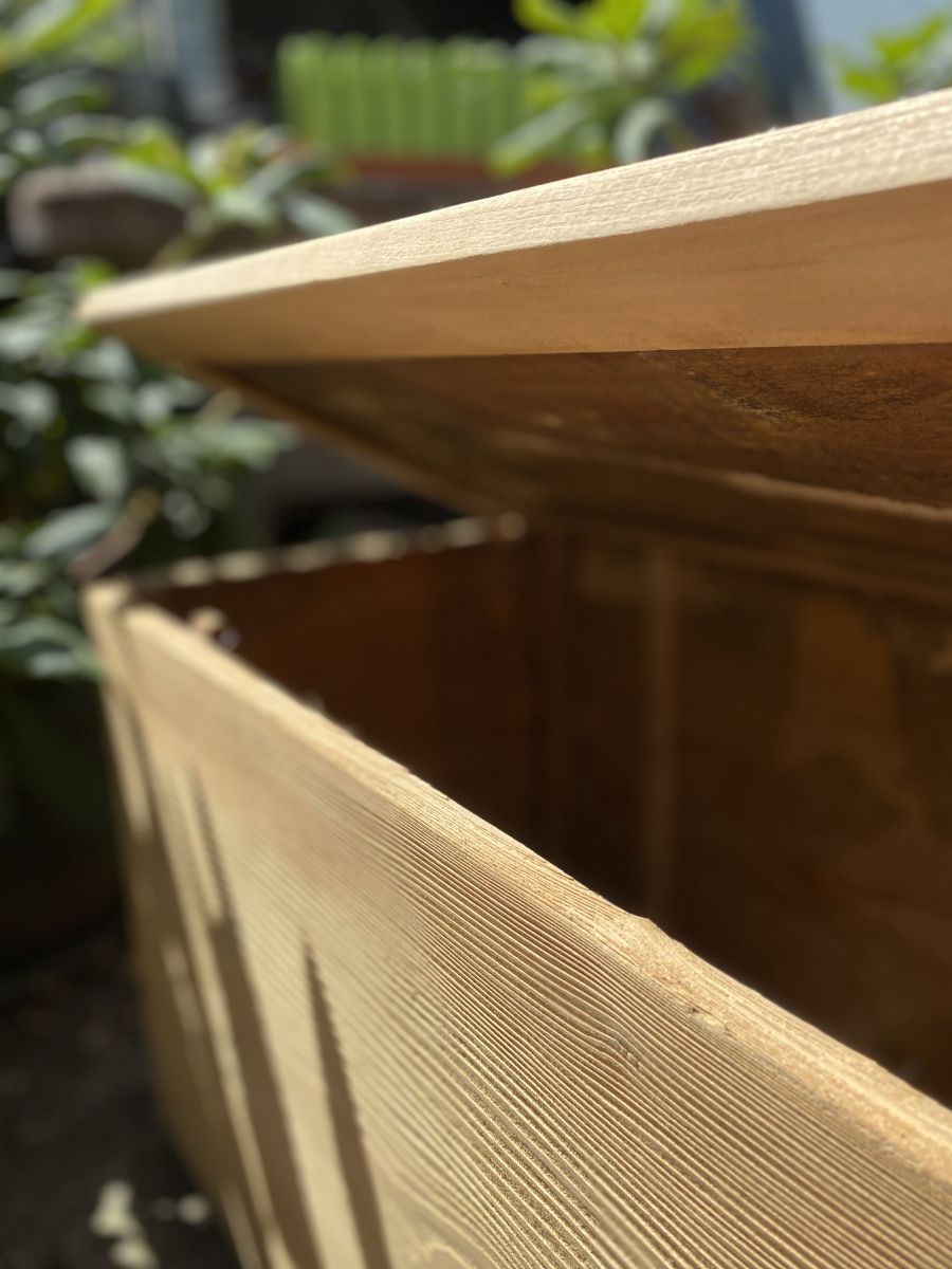 Coffre de rangement en sapin brut et plaqué sur le dessus. Quelques traces foncés sur le dessous, témoignant de son âge. Intérieur du coffre à travailler à votre guise, trace légère de colle, d'anciens propriétaires y avaient collés du papier peint.
