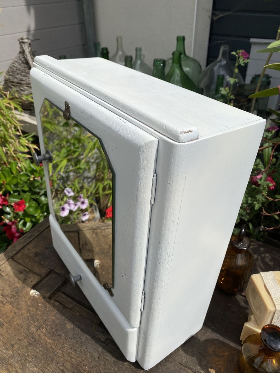 Armoire à pharmacie ou armoire de toilette en bois avec un miroir central ( 24 * 21 cm ) et un tiroir. Poignée ronde en métal. Couleur blanche. Bon état général, miroir piqué par endroit.