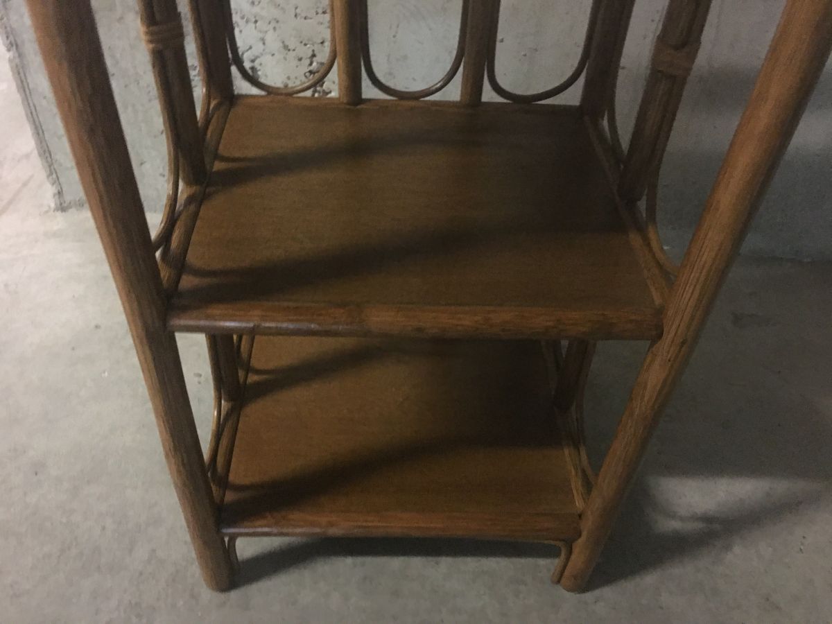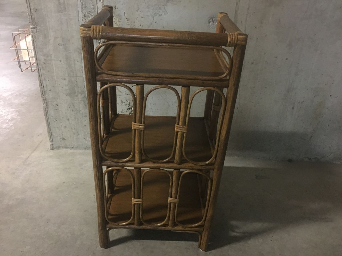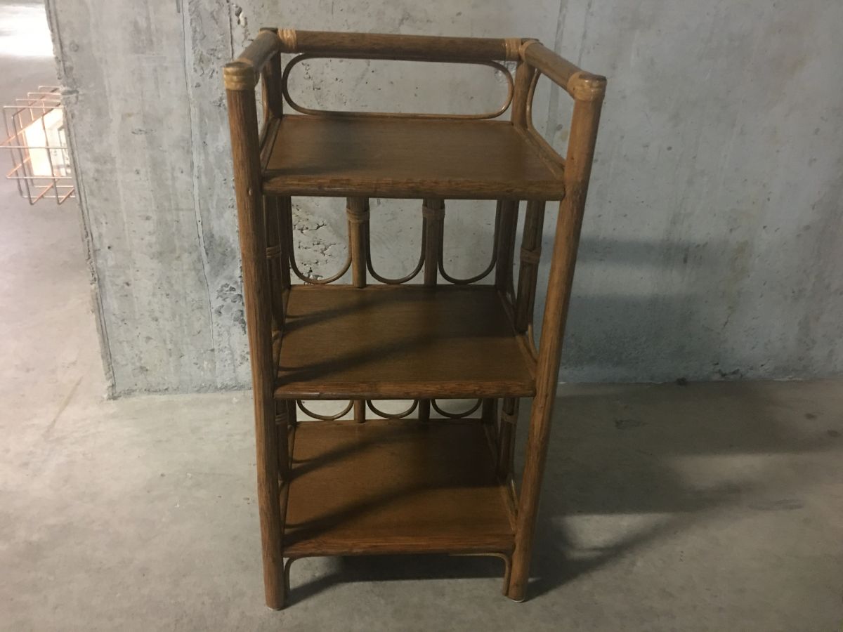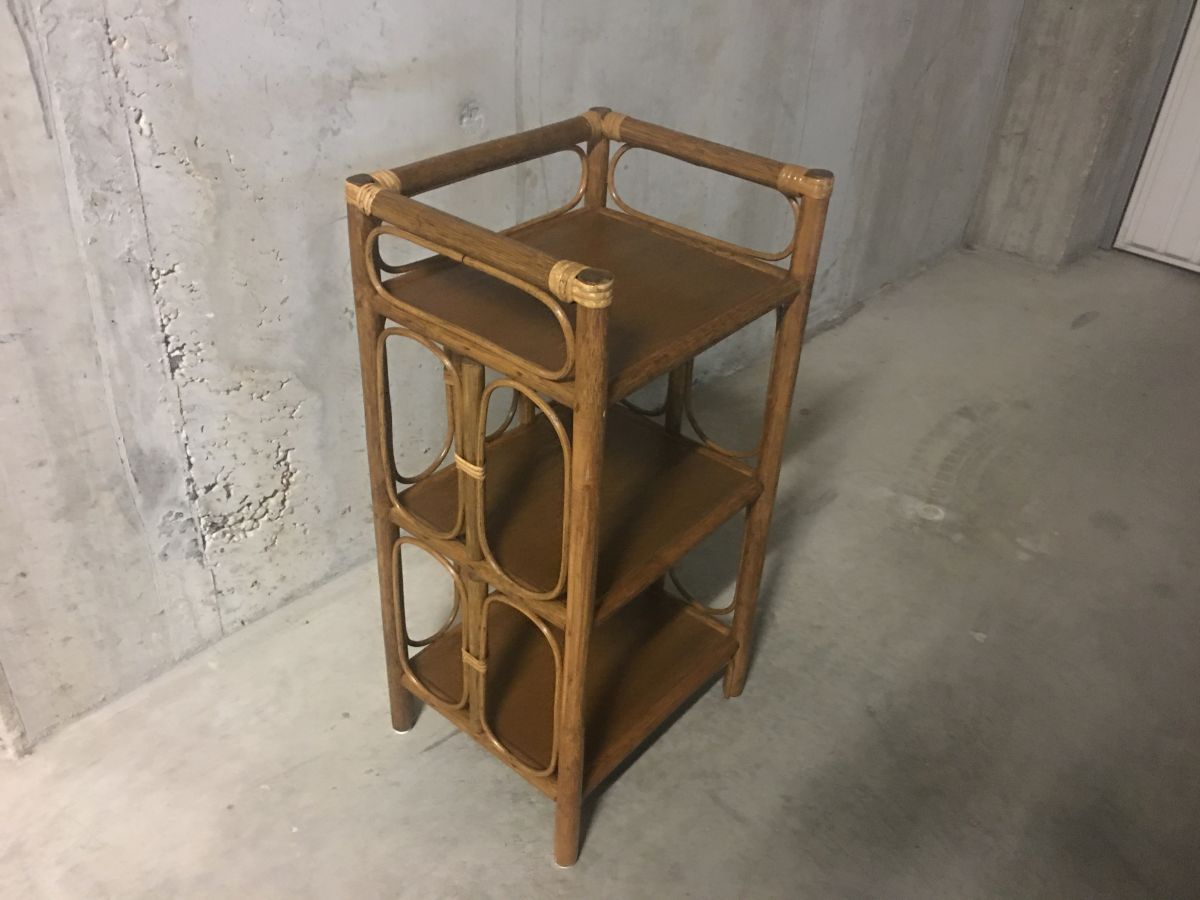 Petite étagère en rotin des années 60, 3 plateaux, superbe patine, dimensions (cm) : L.35xH.69xP.29, bon état.