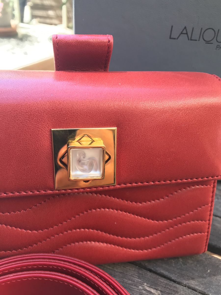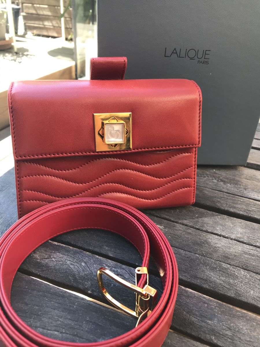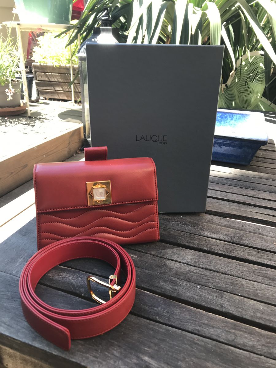 Pochette ceinture en agneau rouge. Bouton de la pochette en verre Lalique représentant un corps de femme.