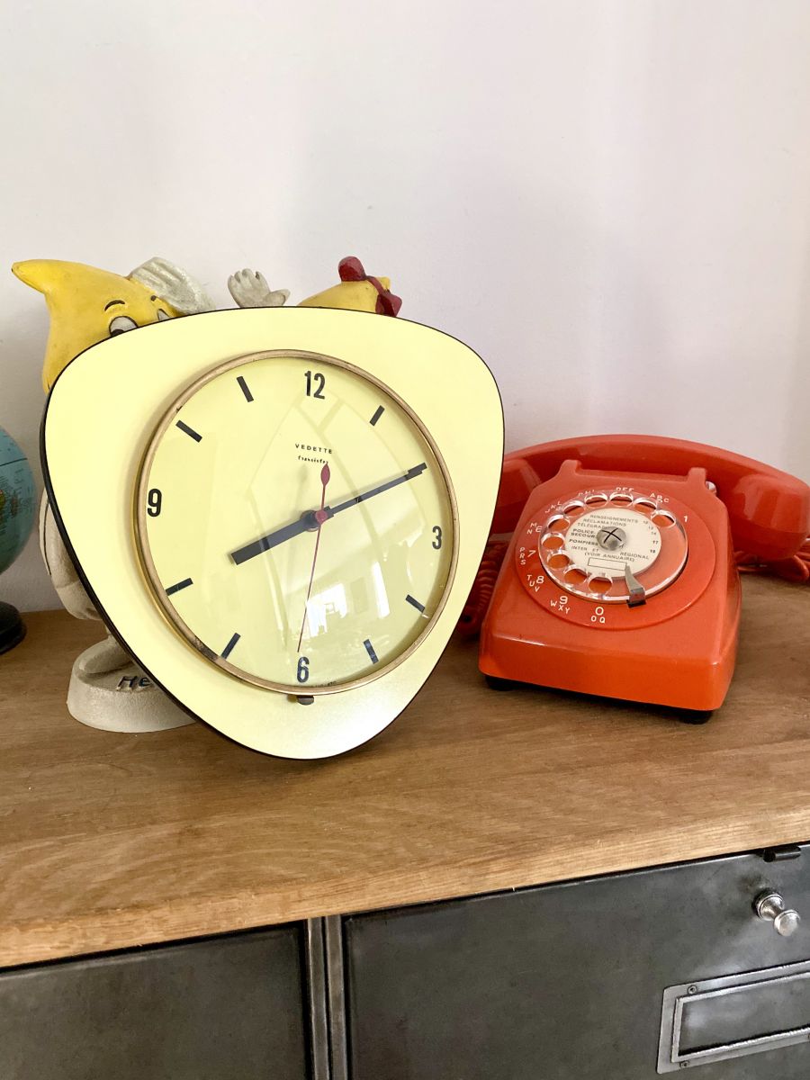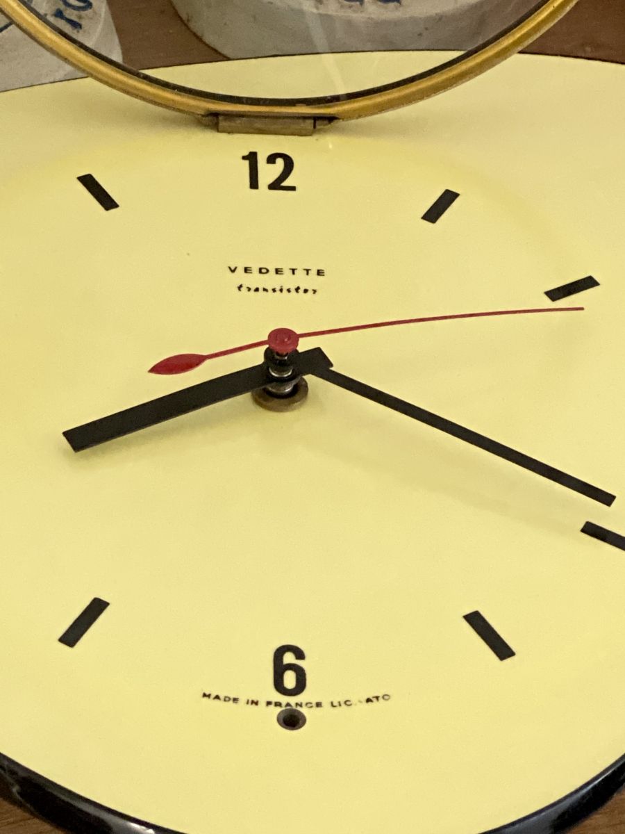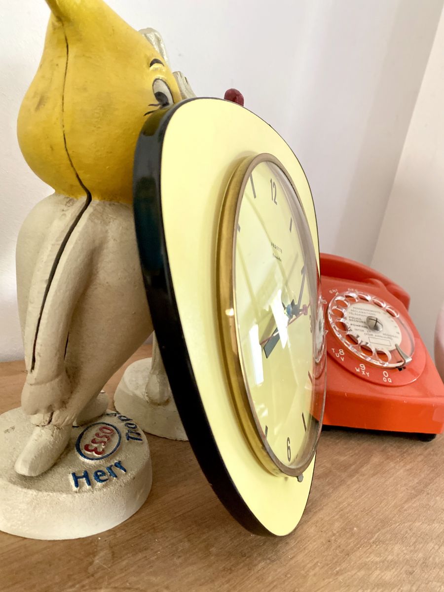 Très belle horloge murale de la marque française vedette. Vintage années 50/60. Cadre en formica jaune avec un verre entouré de laiton doré. Entourage en formica noir. Elle fonctionne très bien avec une pile LR20. Parfaite pour une déco vintage, rétro … Très bon état, quelques rayures sur le verre. Dimensions: Largeur 23 cm. Profondeur 5 cm. Hauteur 25 cm.