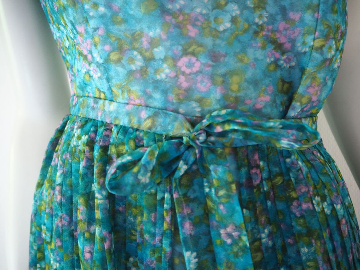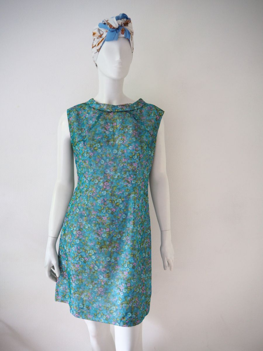 De couleur turquoise avec des fleurs roses/vertes et blanches, dessinées comme une aquarelle. Tissu en voile, doublé à l'intérieur.