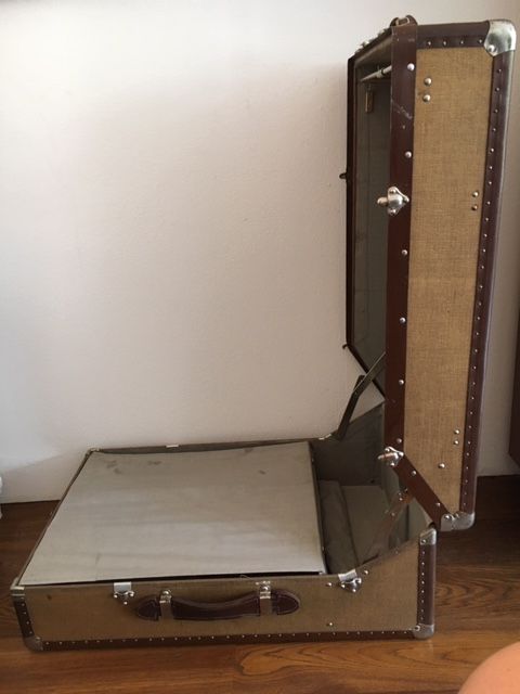 Malle de voyage avec une penderie et 3 porte-manteaux en bois côté vertical et d’un espace de rangement coté horizontal. Le revêtement intérieur est entiérement toilé, en excellent état. Quelques traces d’usure mais aucun défaut de tissus.