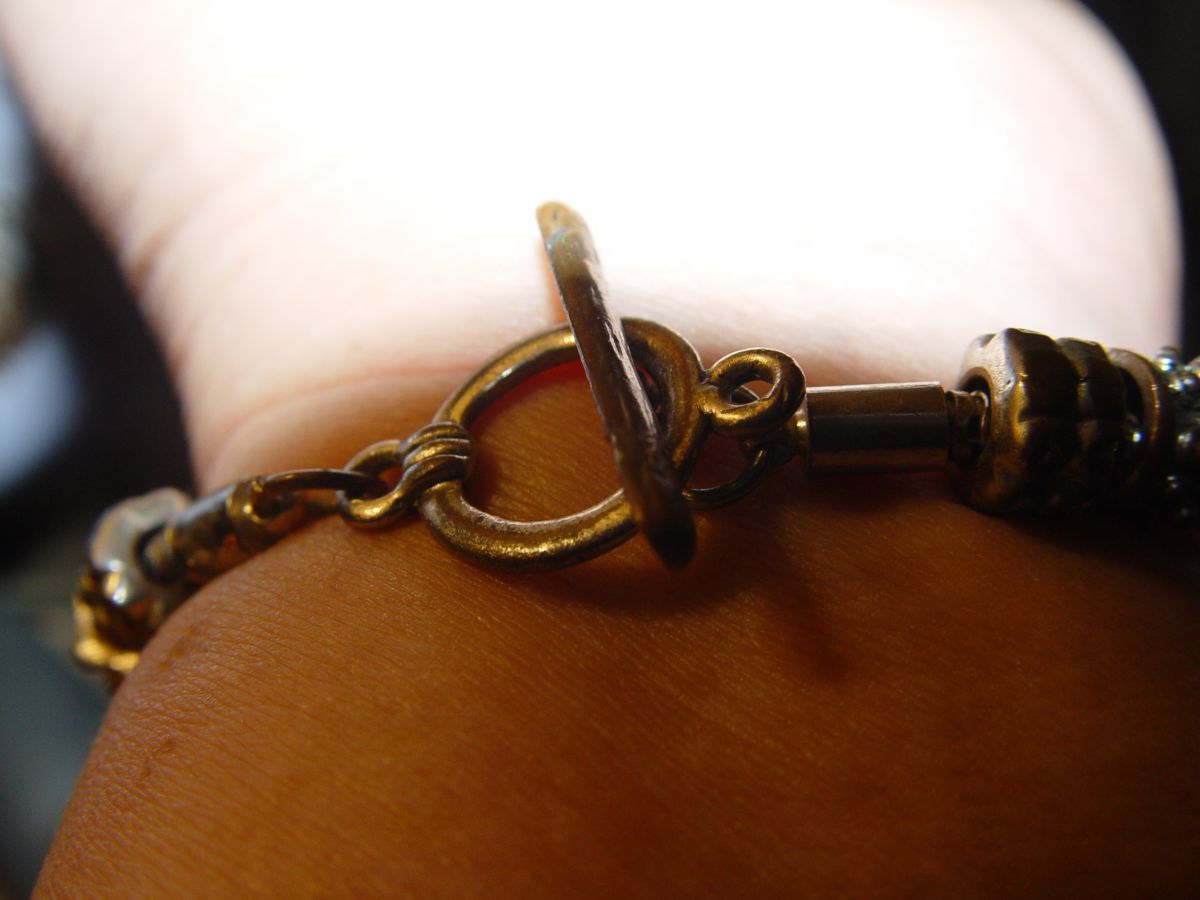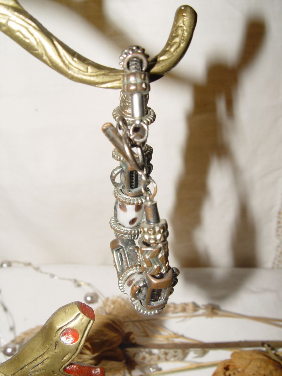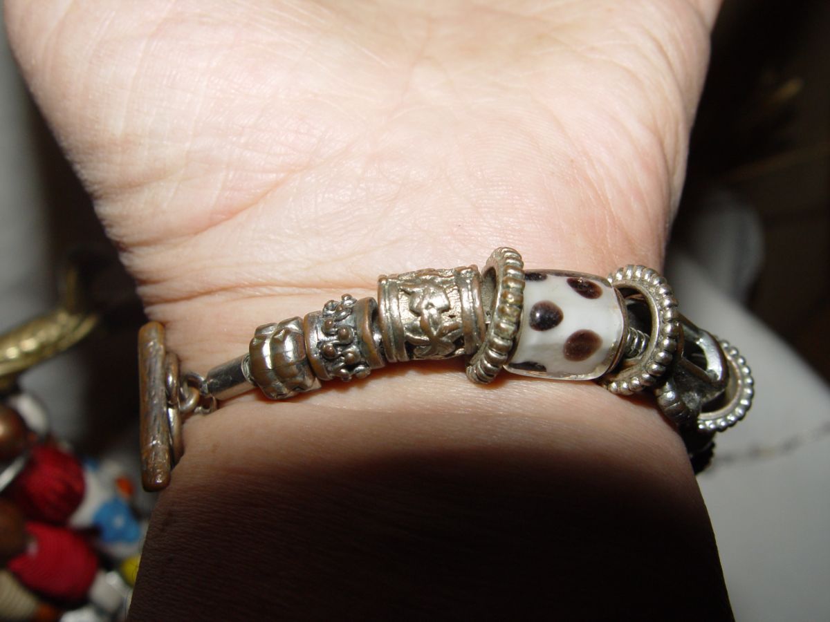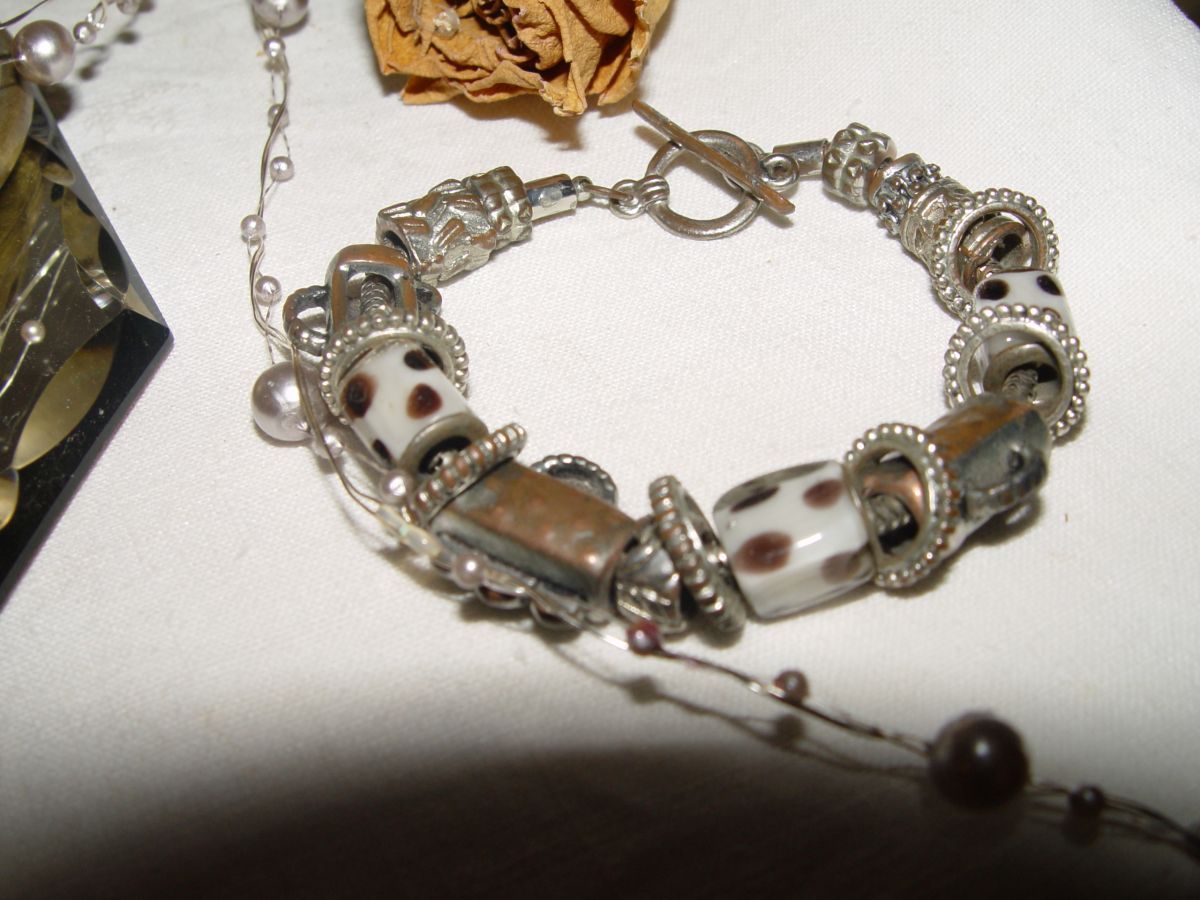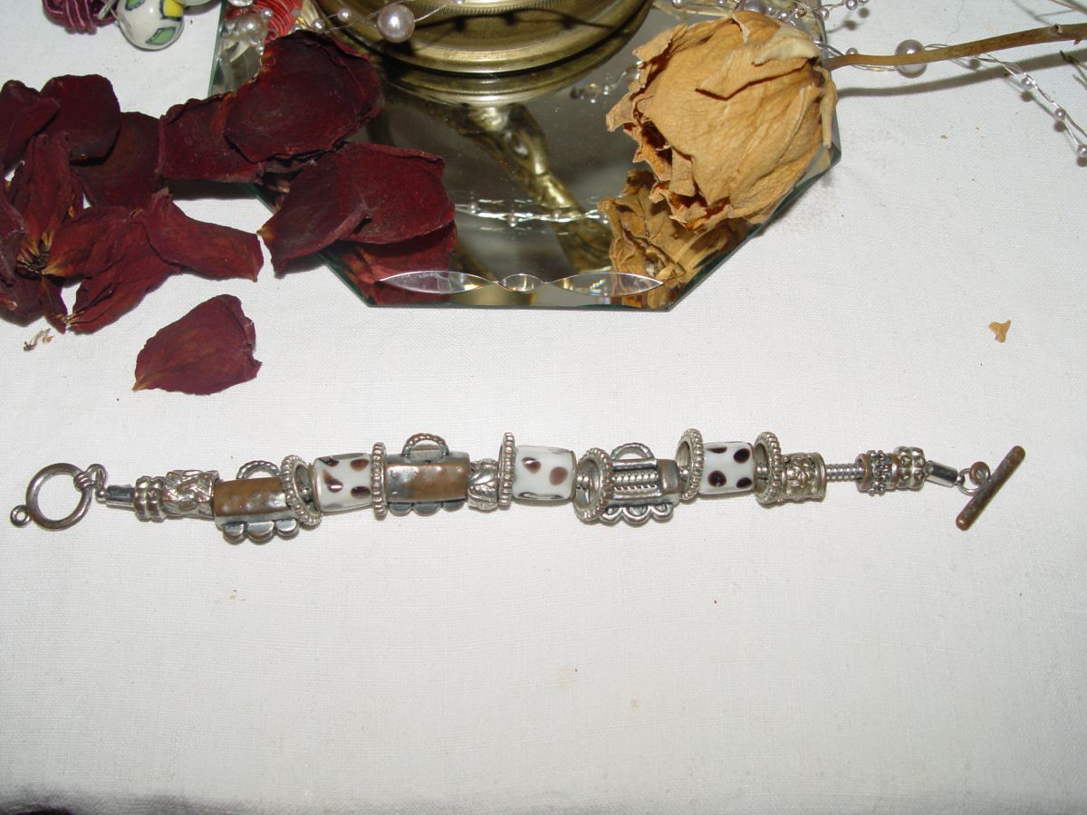 Bracelet ethnique constitué de perles de métal argenté massif et mat et de pierres naturelles enfilées sur un filin métallique .