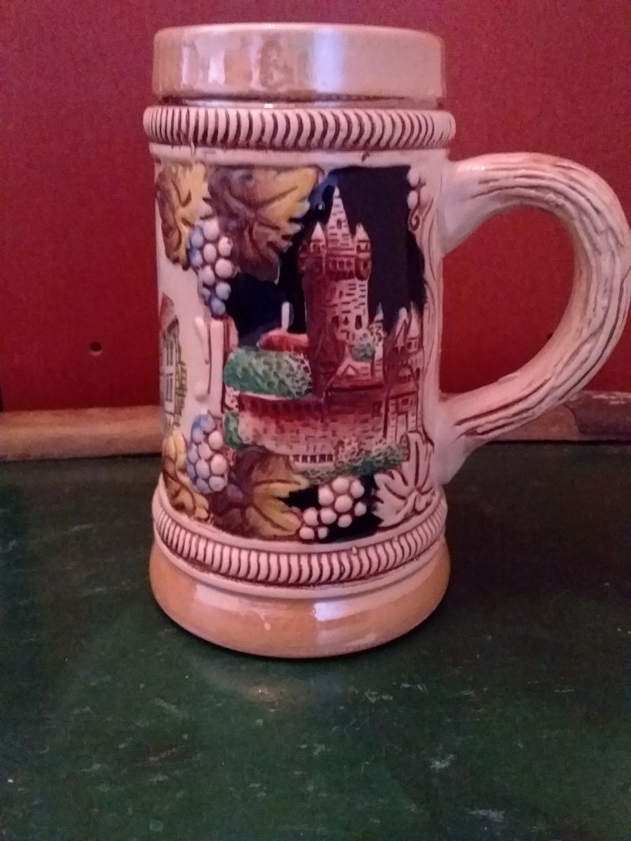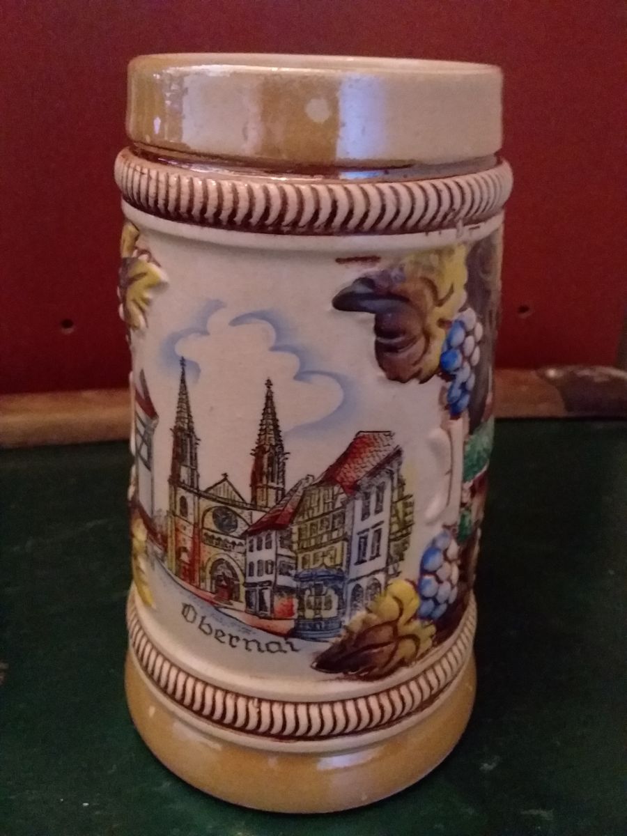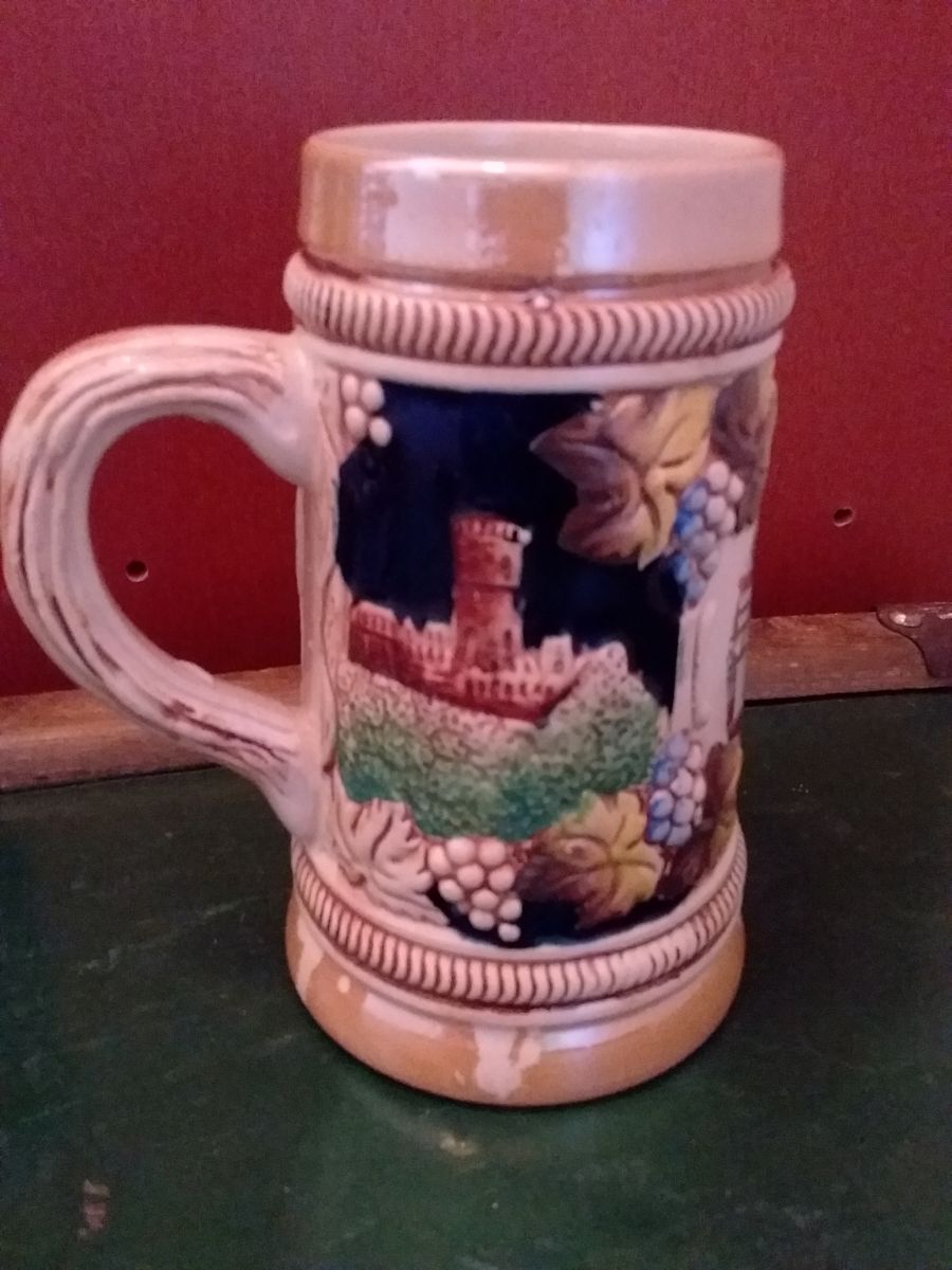 Chope à bière peinte à la main. Jolie faïence décor barboti