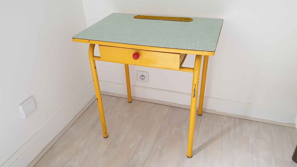 Superbe bureau d'écolier, structure en métal jaune, et plateau en formica pastel.