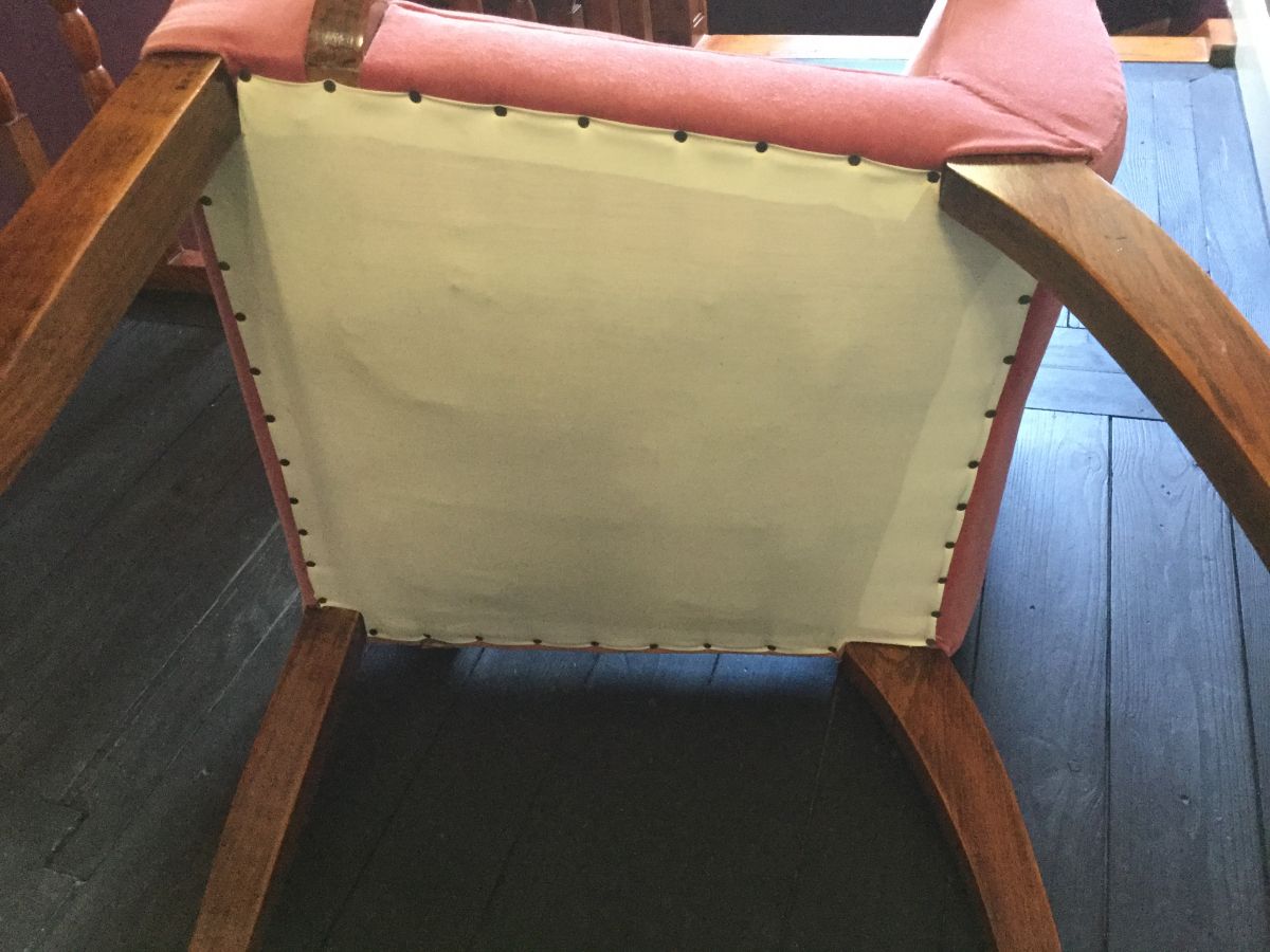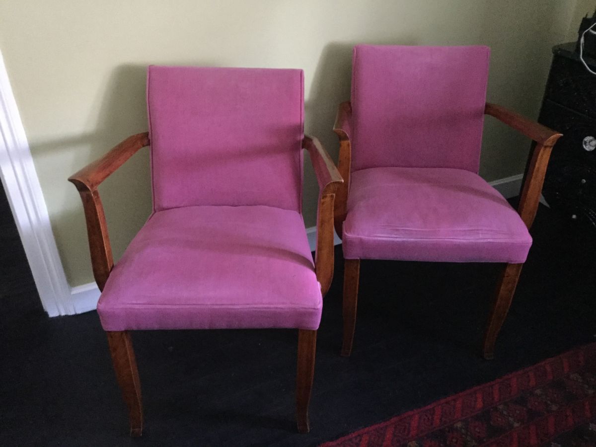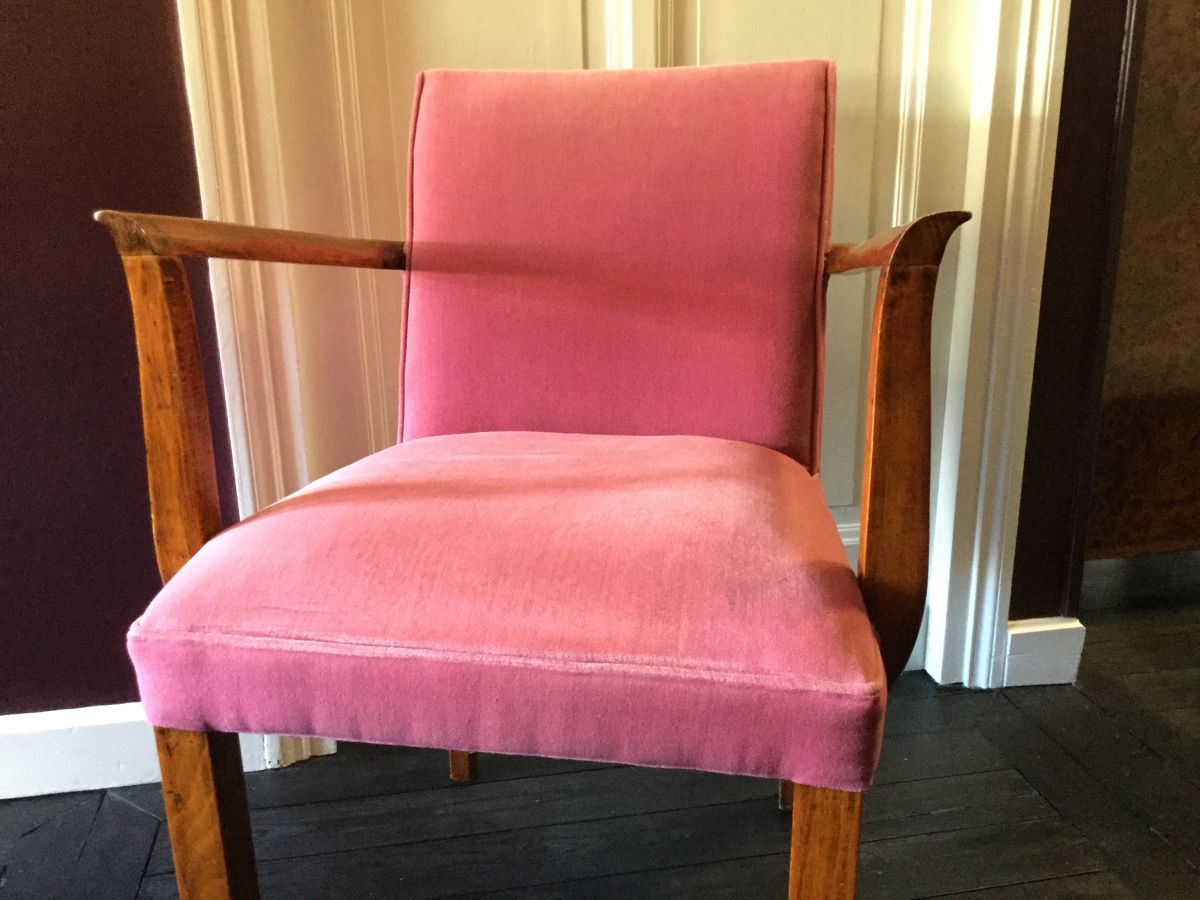 Fauteuil bridge Art Deco, en velours rose avec passe poil. Vernis et couverture en bon état. Hauteur des assises 43 cm