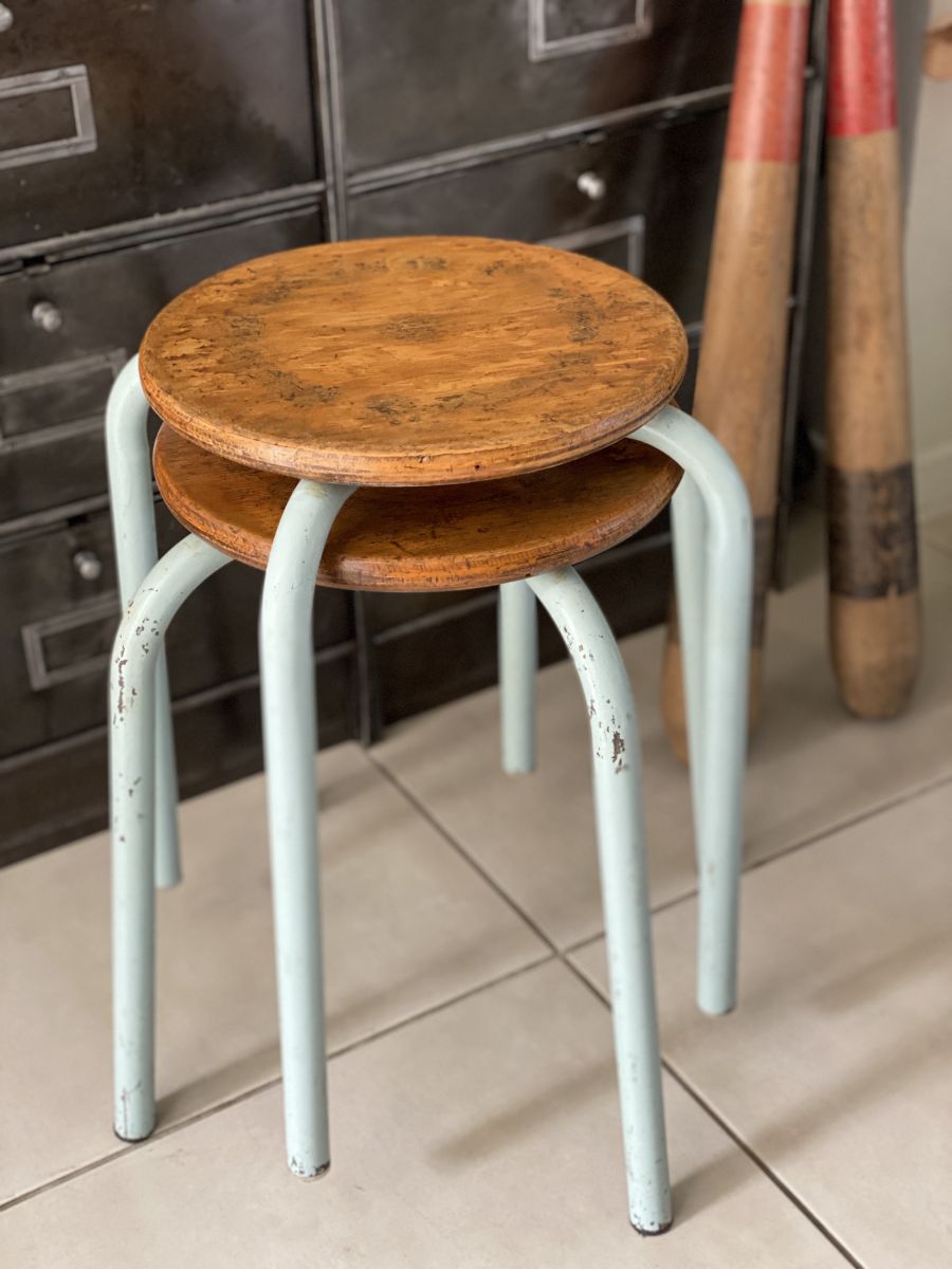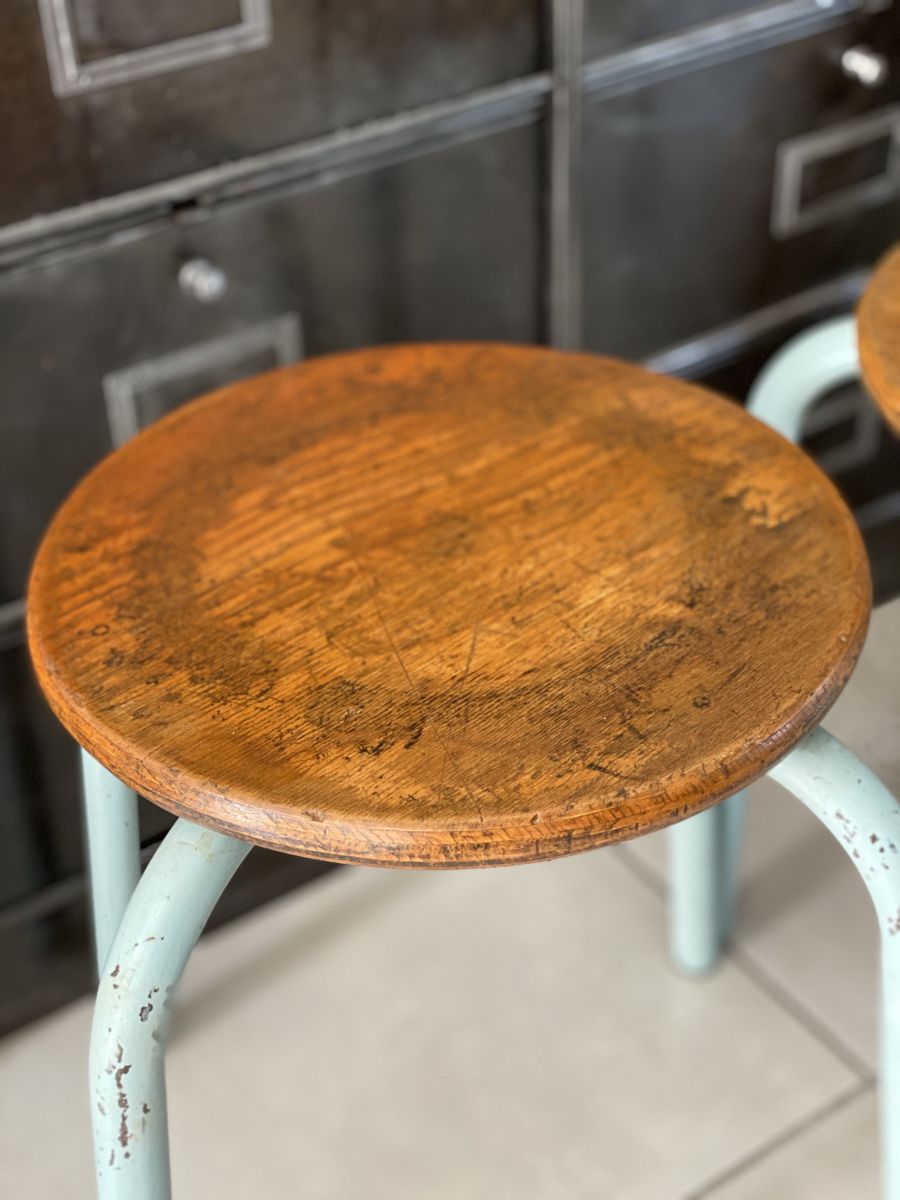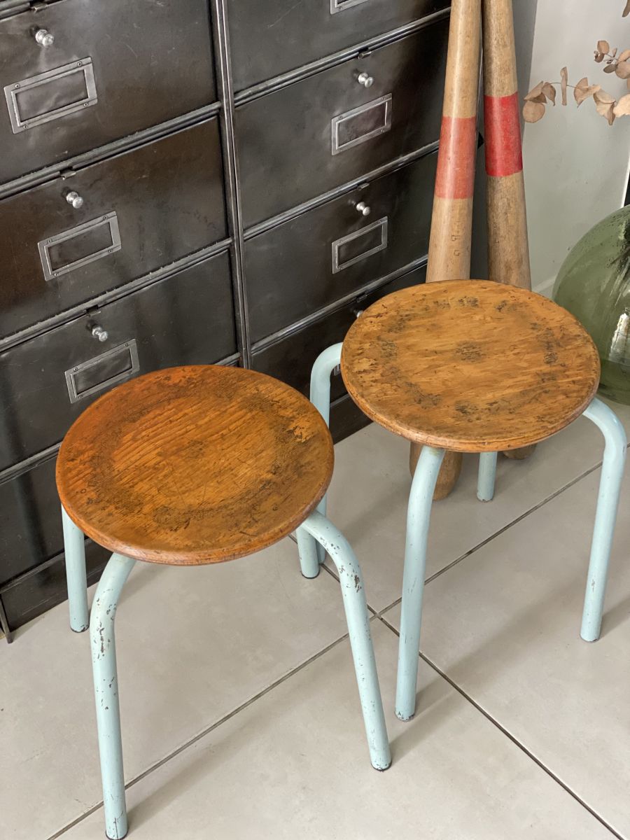 Paire de tabourets d'atelier ou d'école des années 60. Piètement en métal peinture bleue claire et assise bois. Stable et solide avec une jolie patine. Bon état vintage. Hauteur d’assise 44cm.