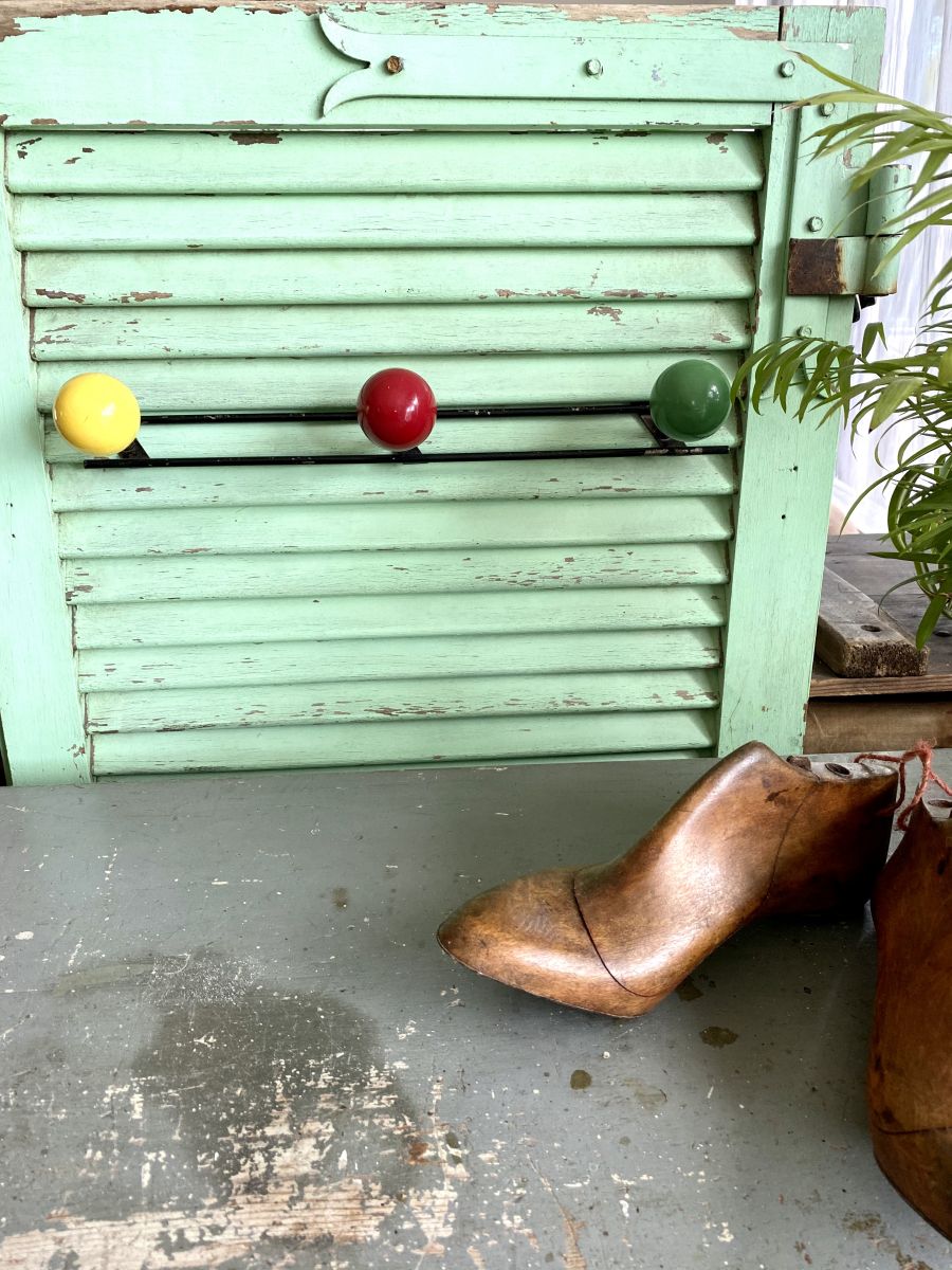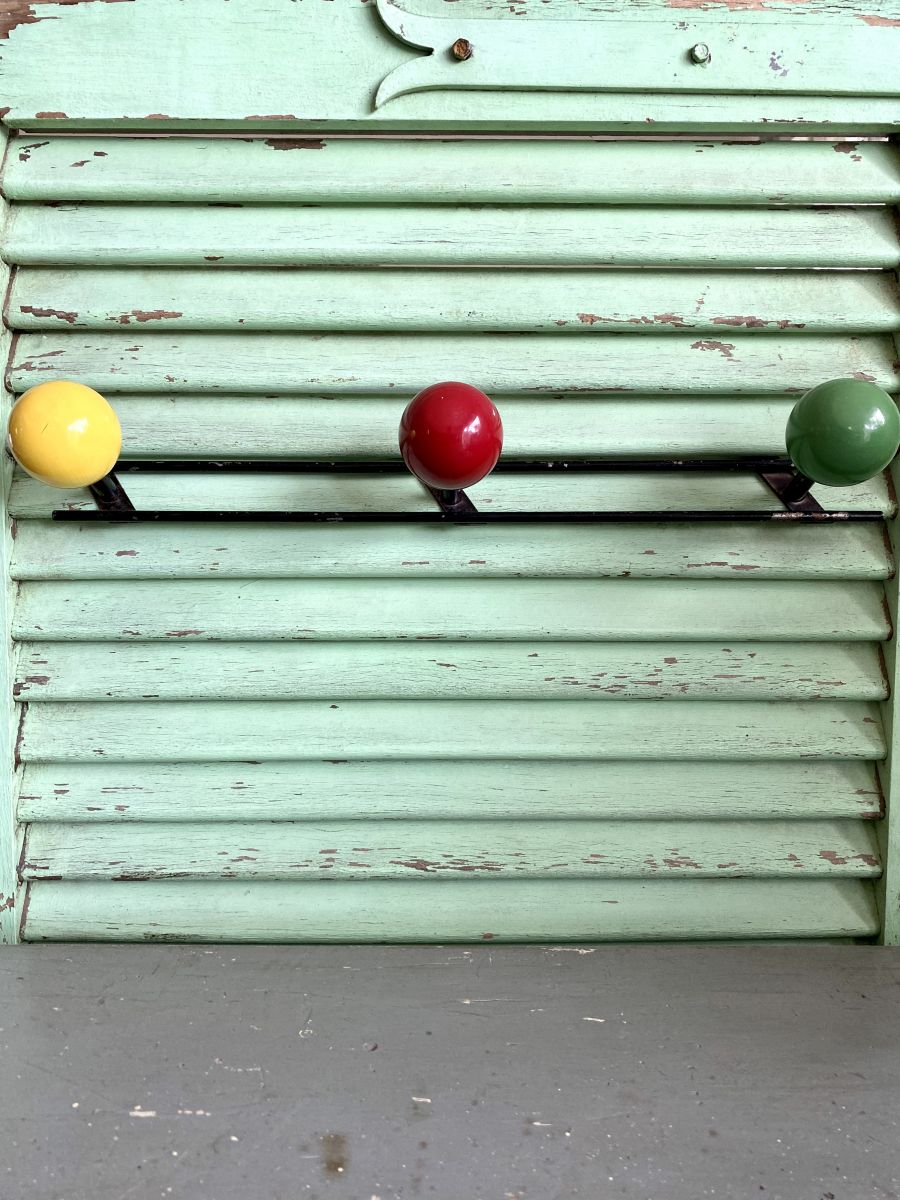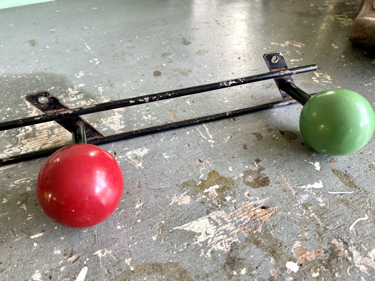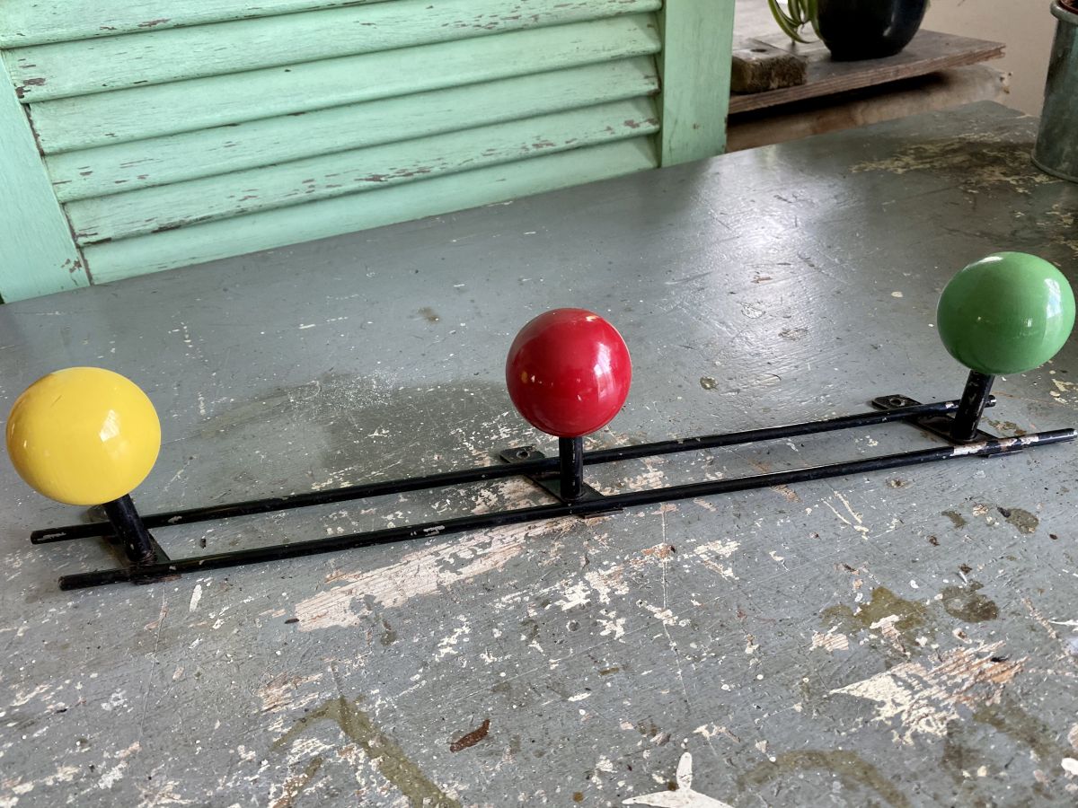 Jolie patère 3 boules vintage. Support métal noir et 3 boules colorées (rouge, jaune, vert). Bon état général. Dimensions: l45 X h6 X p10 cm.