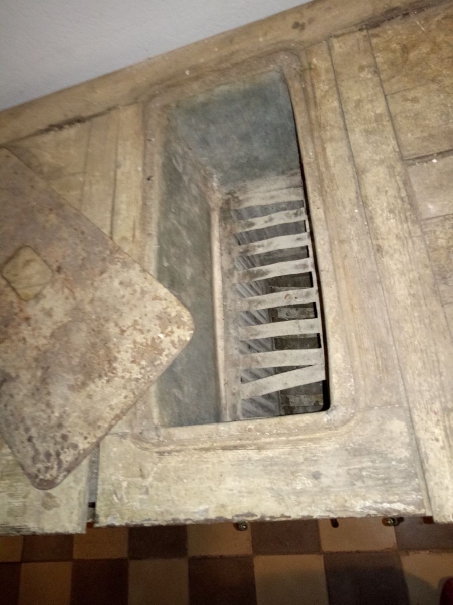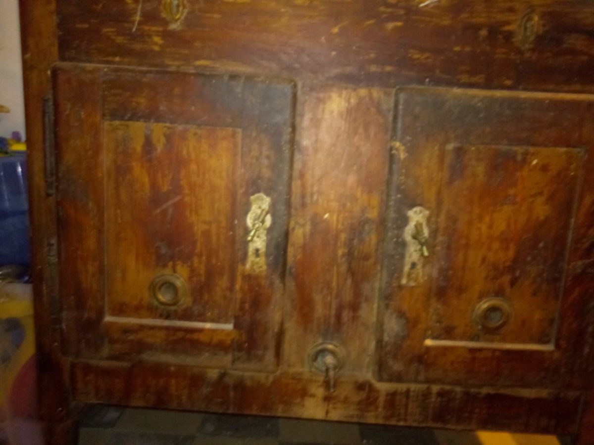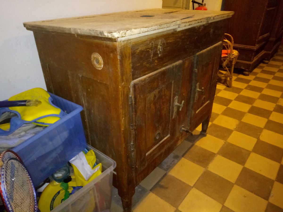 Buffet glacière 1900. necessite rénovation (bac supérieur droite) et ponçage . Bac à glace central(photo) avec robinets d'écoulement. 2 bacs supérieurs et deux vastes compartiments inférieurs.