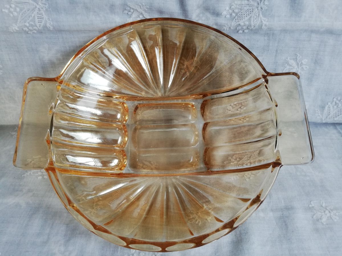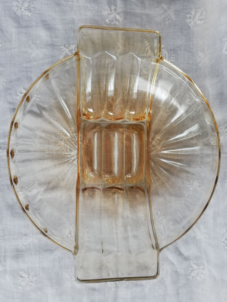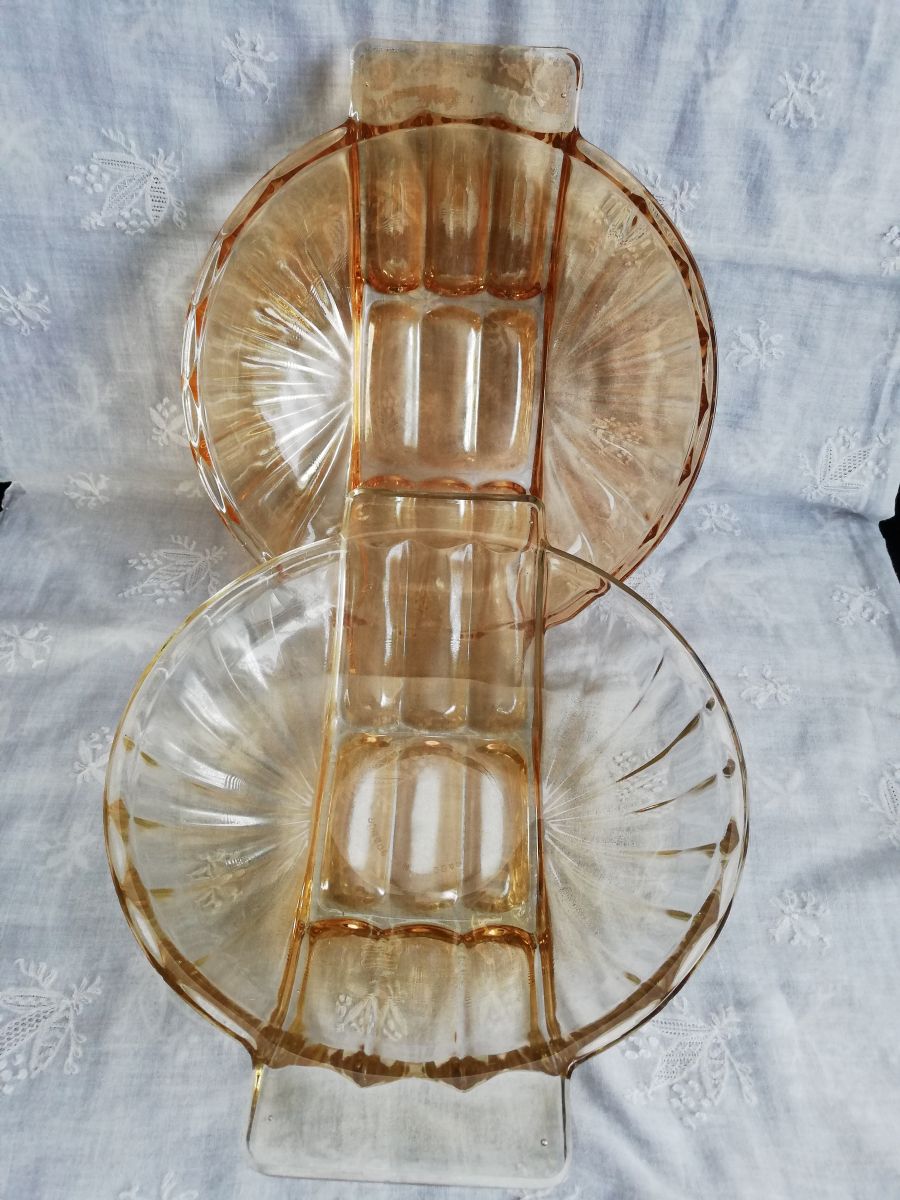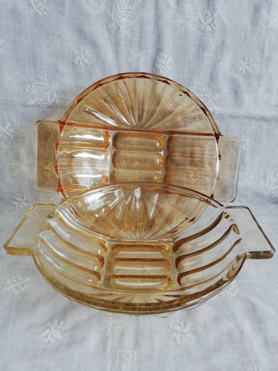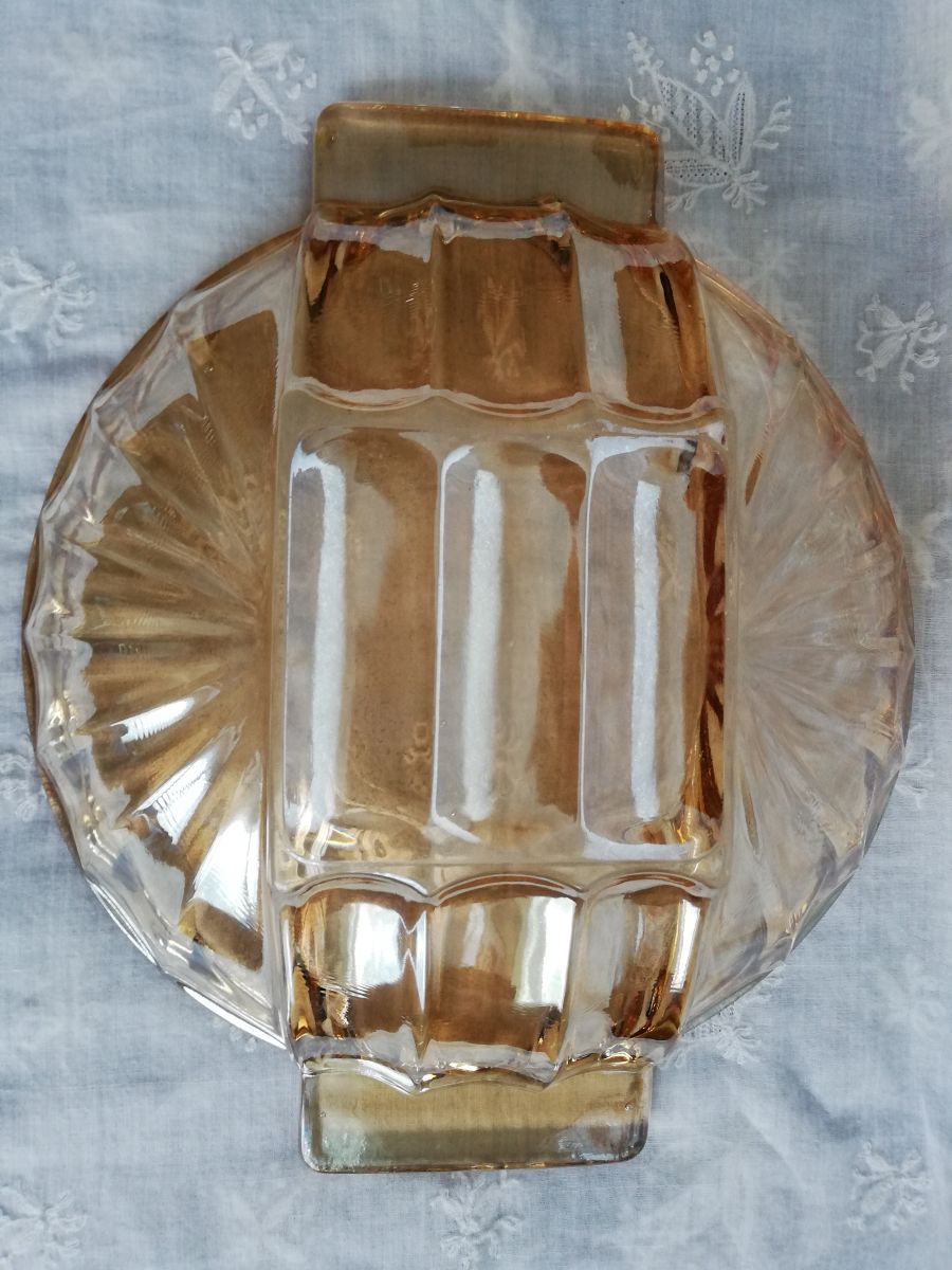 2 plats creux "à oreilles" en verre beige rosé irisé. Plats de matière et couleur en vogue dans les années 60