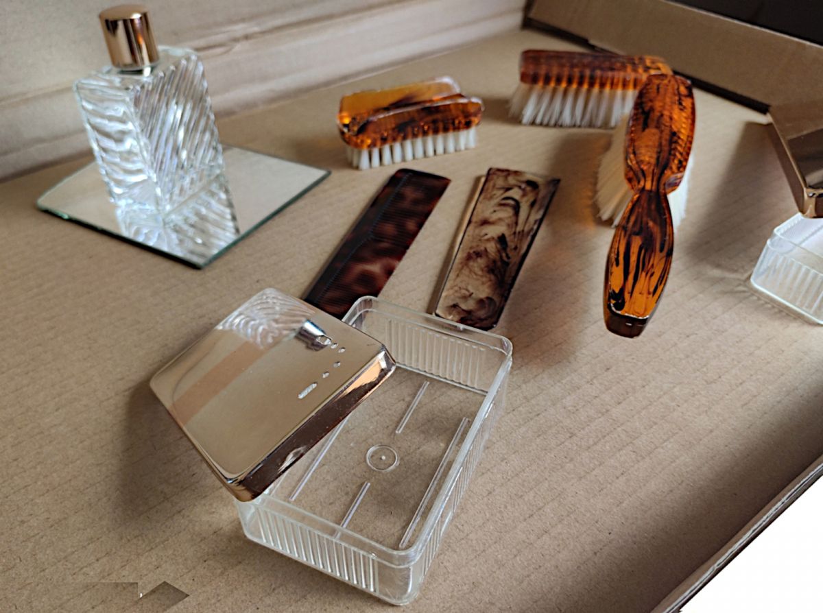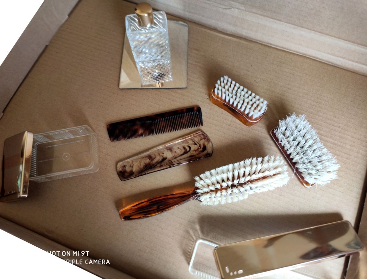 9 éléments avec le miroir (qui présente quelques tâches en haut ) la brosse à ongles présente des traces d'usure sur le contour.