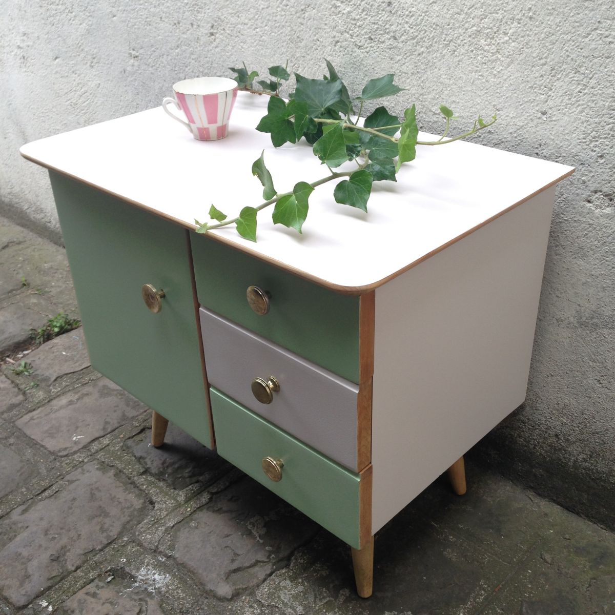 Chevet restauré par nos soins. Le chevet est peint en vert amande et rose très pale, certains détails ont été laissé en bois ciré.Le dessus est vernis pour plus de résistance.Il se compose d'un espace fermé d'une porte sur la droite et de 3 tiroirs sur la gauche.Jolies poignées anciennes en métal doré.