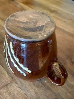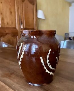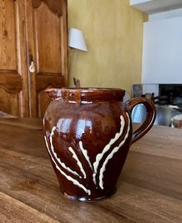 Pichet en terre cuite émaillée marron. Les dessins sont en relief. Harmonieux et bien ventru pour un joli bouquet sec, par exemple ou pour des cuillères en bois...