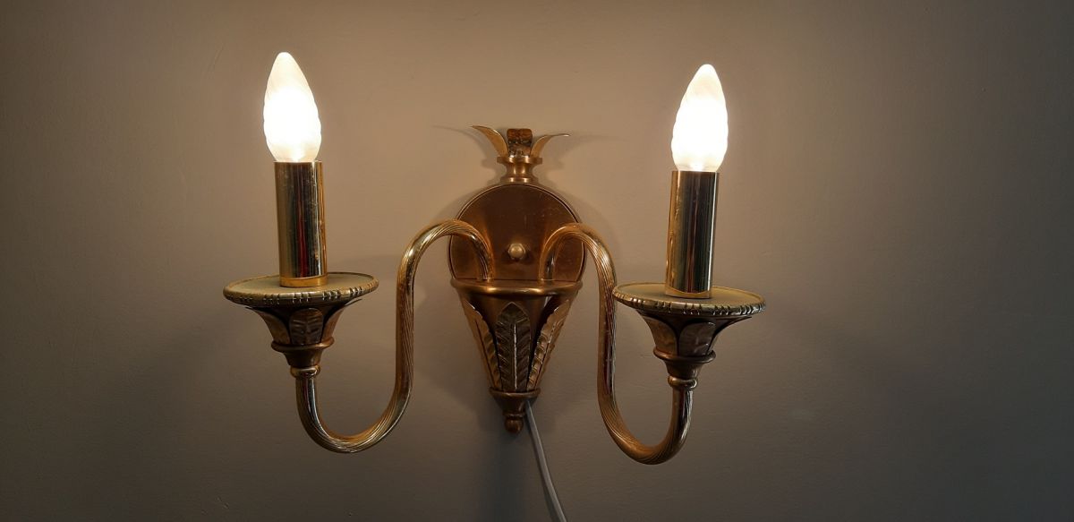 Paire d'appliques à deux bras de lumière en métal doré à décor de feuillages stylisés. Toutes électrifiées. Dimensions 28x30x20.