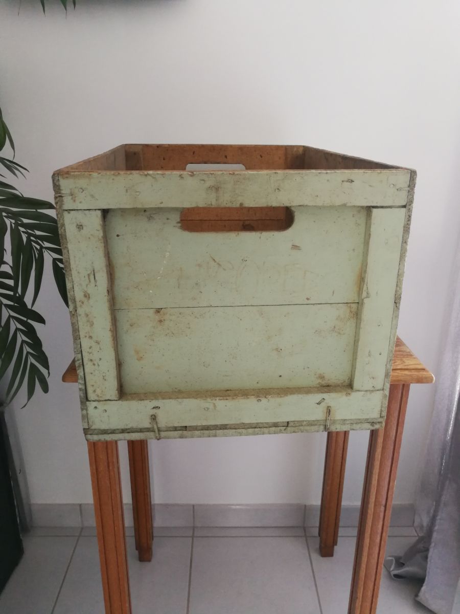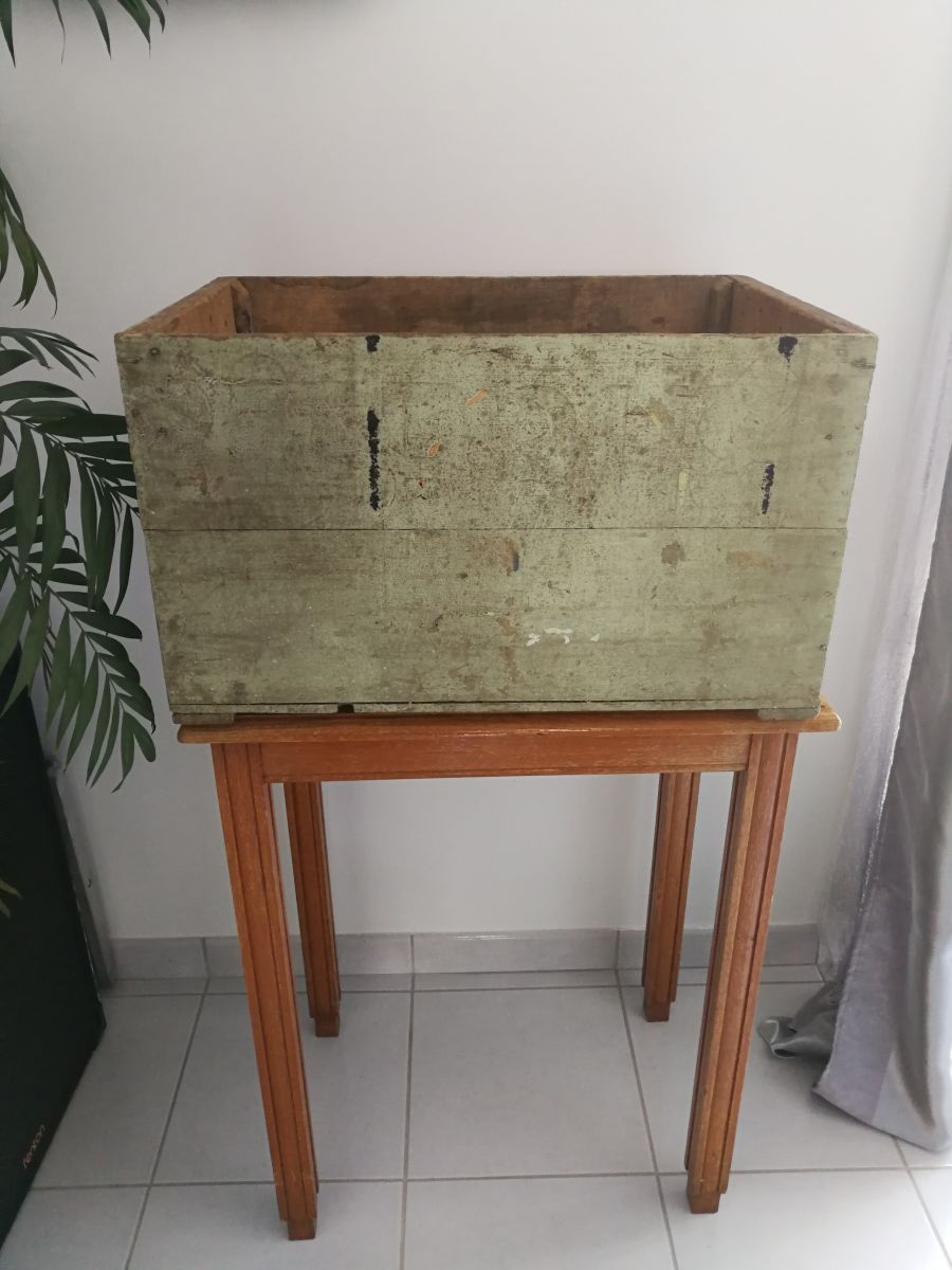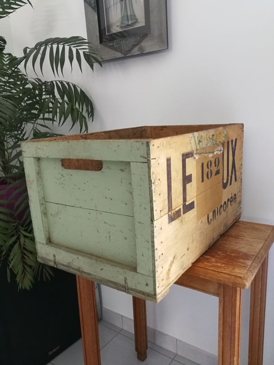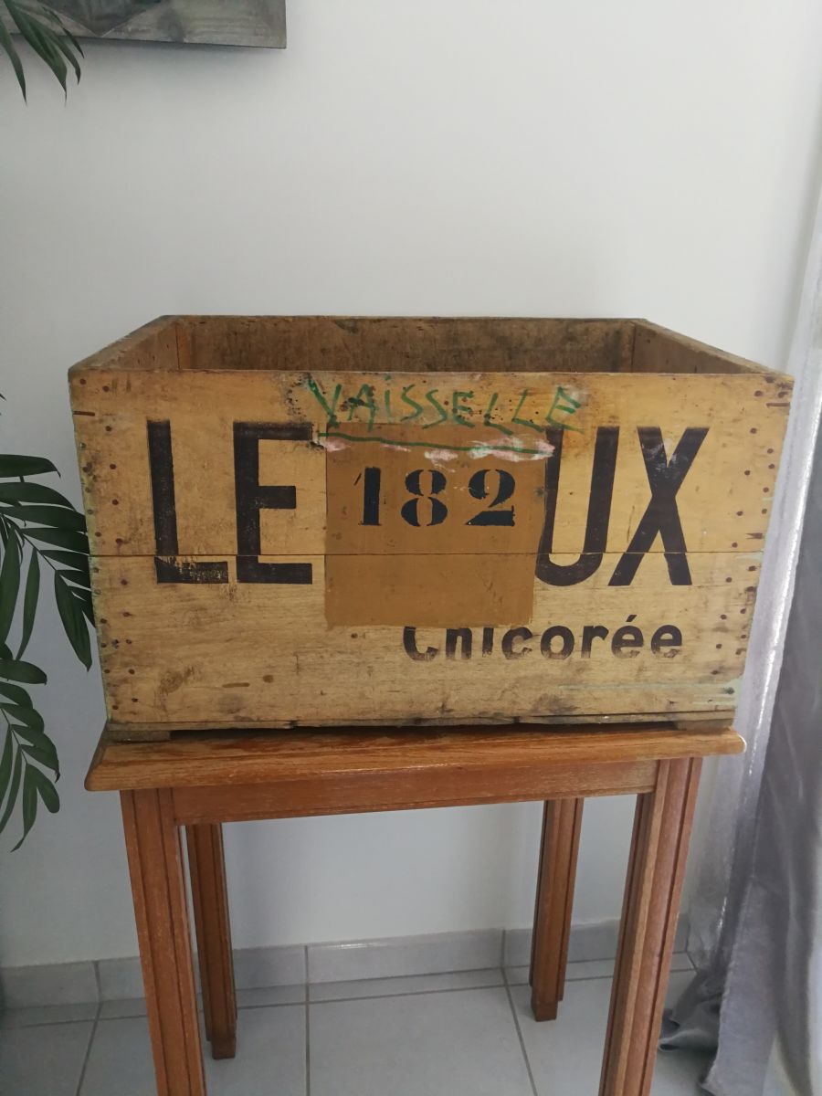 Ancienne Caisse en bois Chicorée '' LEROUX '' qui me servait de range-tout, j'en ai plus l'utilité, dans son jus, un petit coup de nettoyage pour y faire une petite commode ou une étagère.