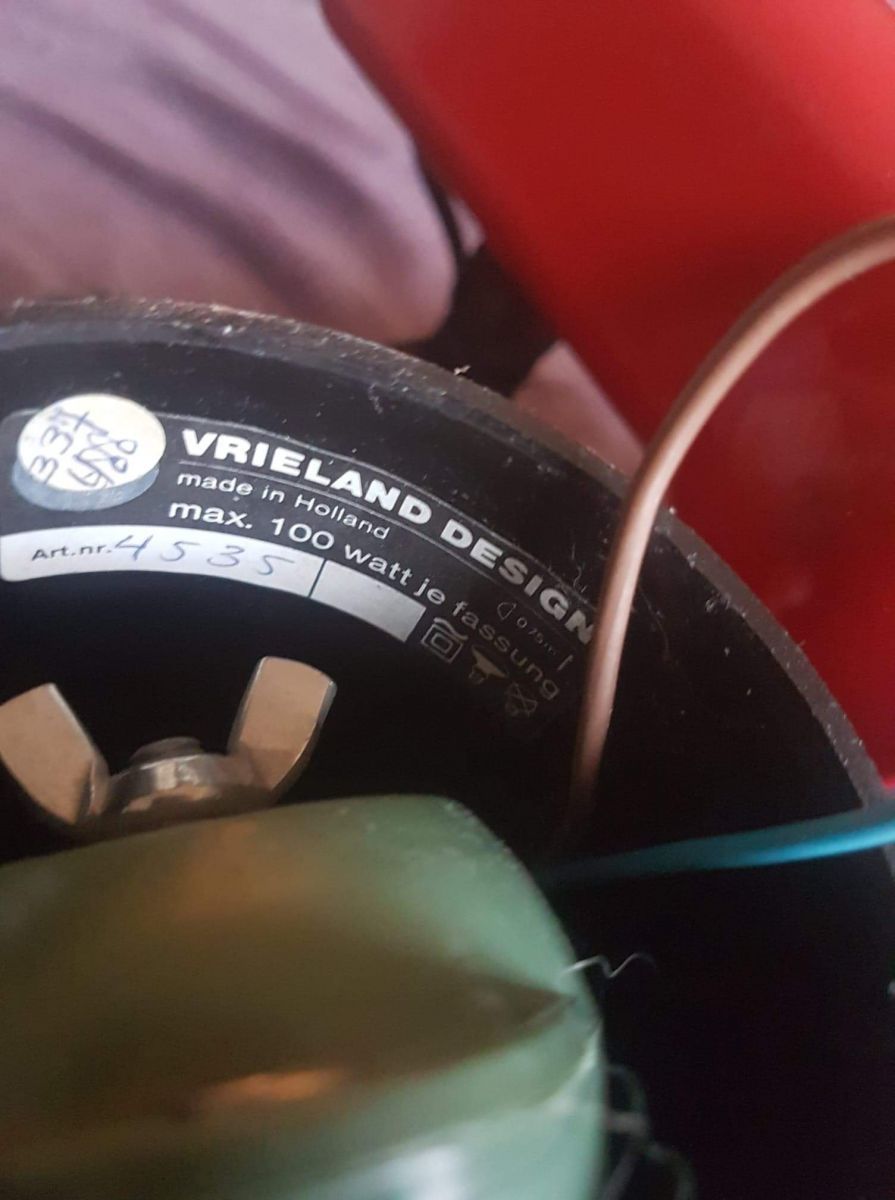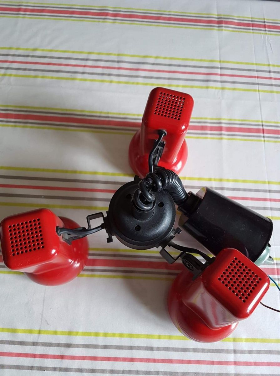 suspension vintage noire signée Vrieland design made in Holland avec 3 spots orientables en métal laqué rouge des années 70-80