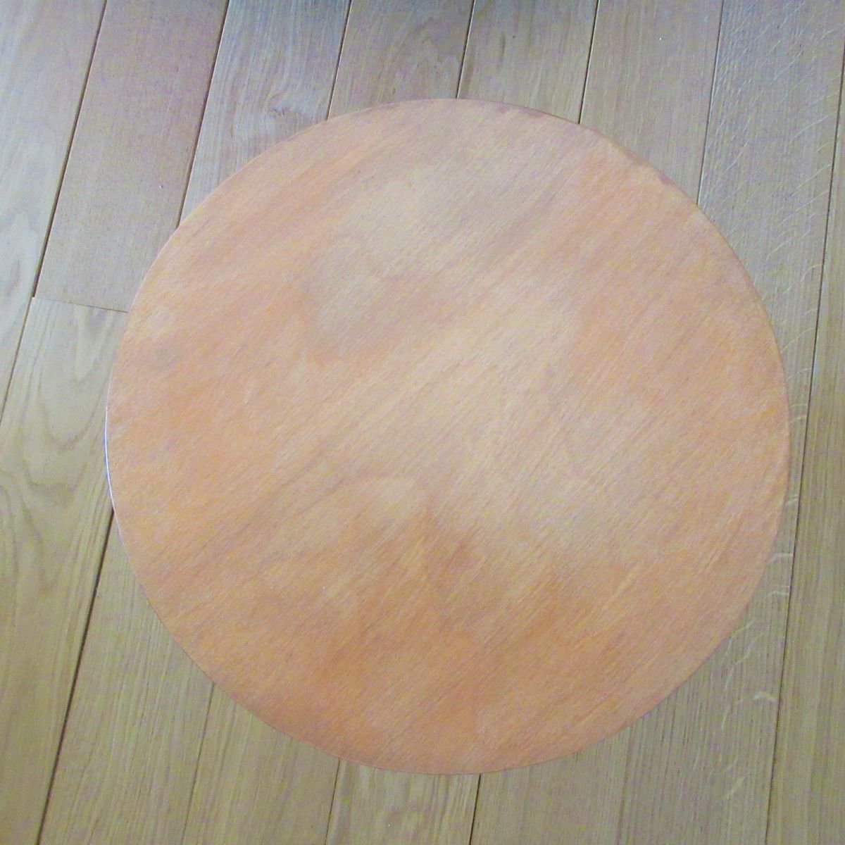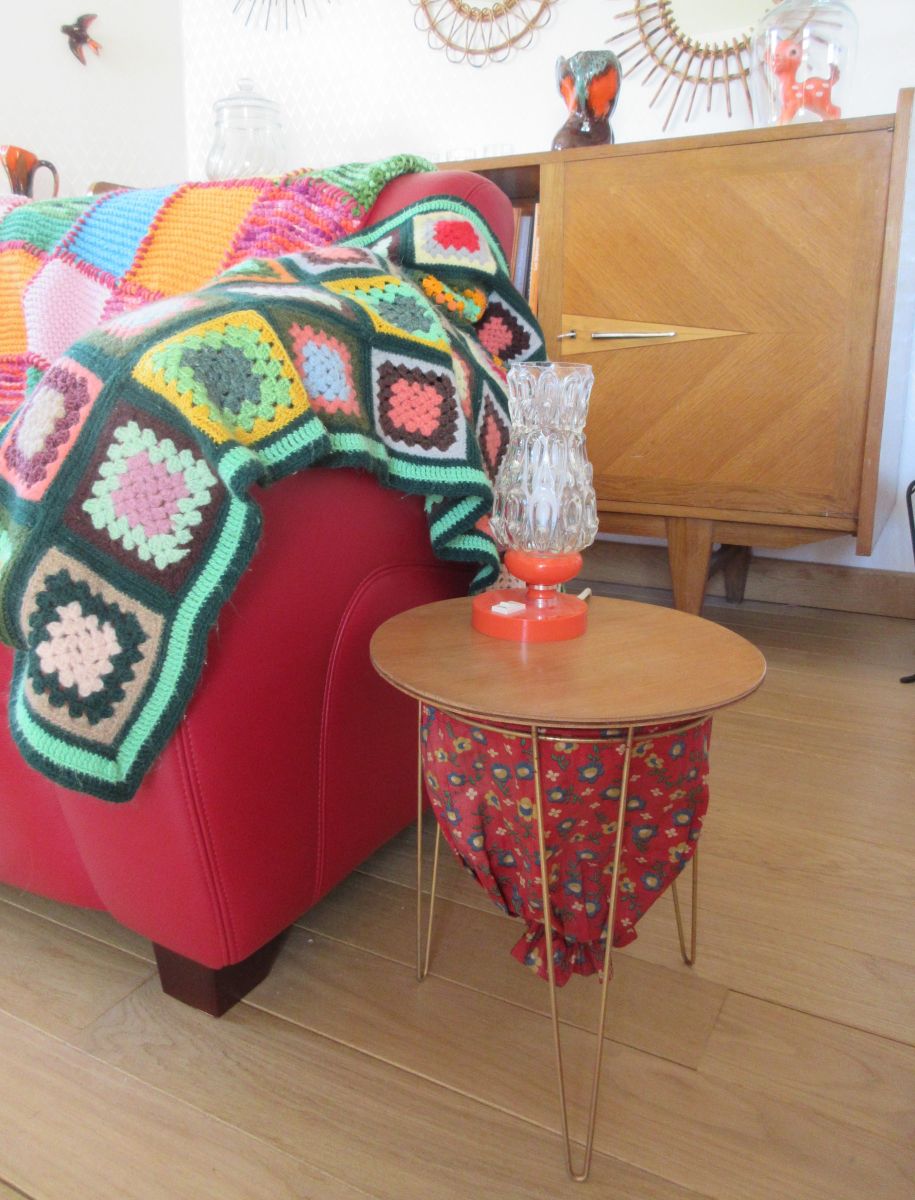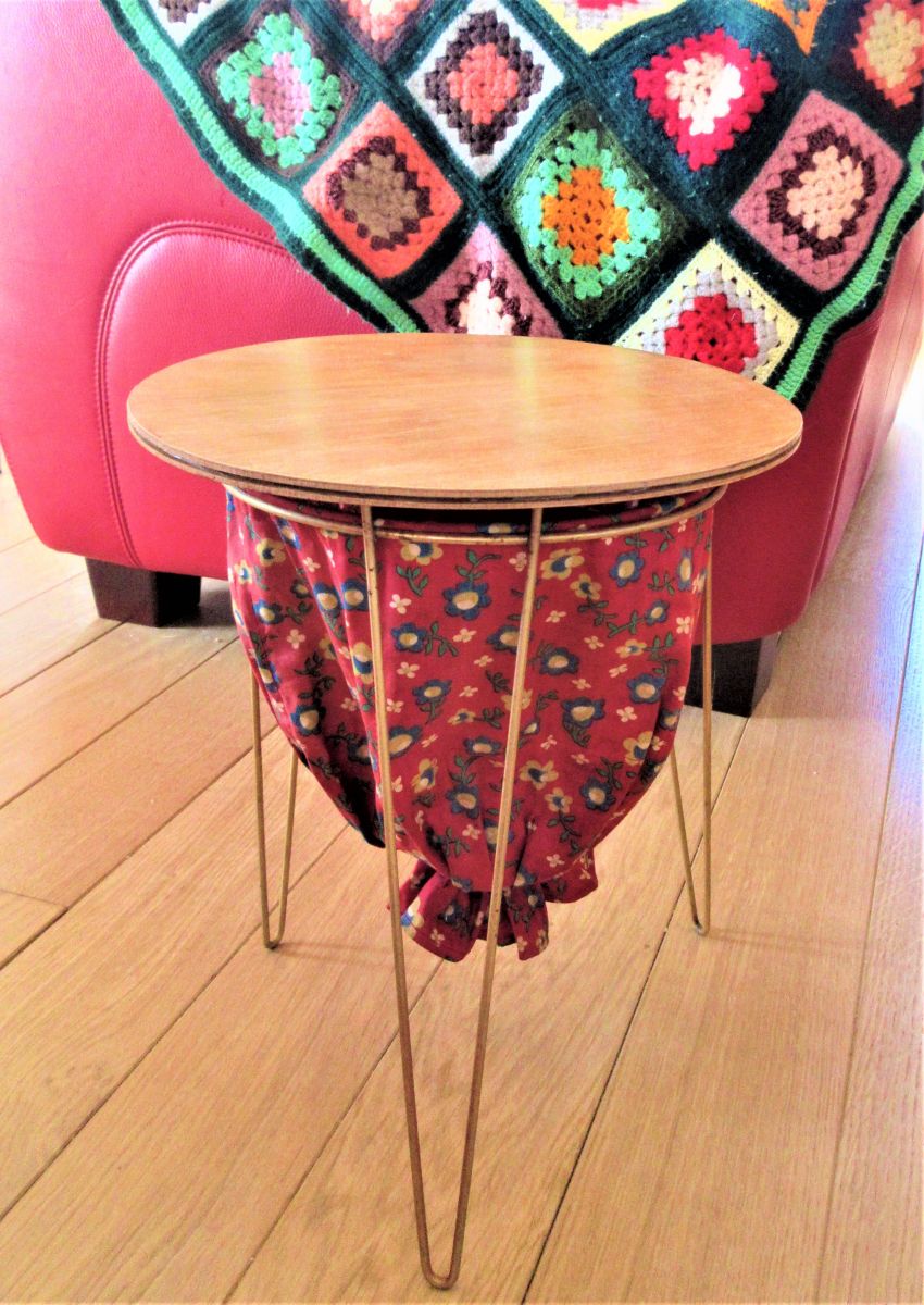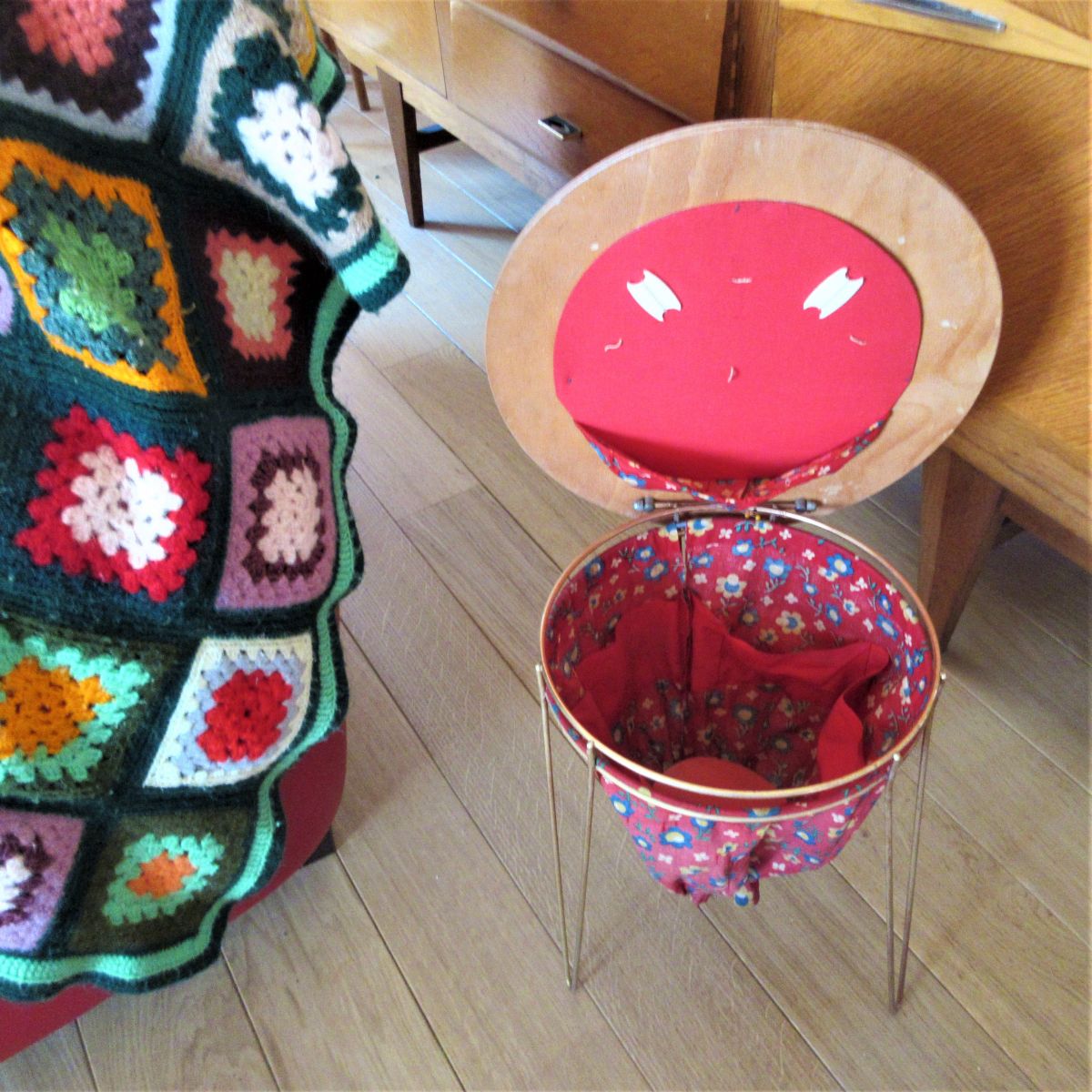 Cette adorable petite travailleuse tripode peut aussi bien être rendue à sa fonction d'origine que détournée en bout de canapé. Les pieds sont en métal, le plateau est constitué de deux disques de contreplaqué (que j'ai poncés et revernis pour faire disparaître des traces d'eau). Le tissu, éclatant à certains endroits, un peu passé à d'autres, est d'origine. Quelques accessoires de couture se trouvaient dans la corbeille : j'ai choisi de les y laisser !