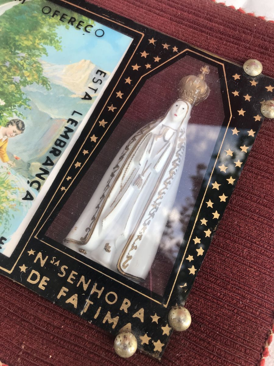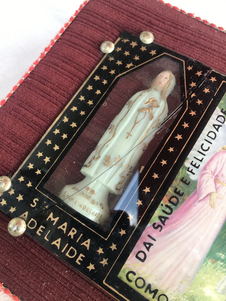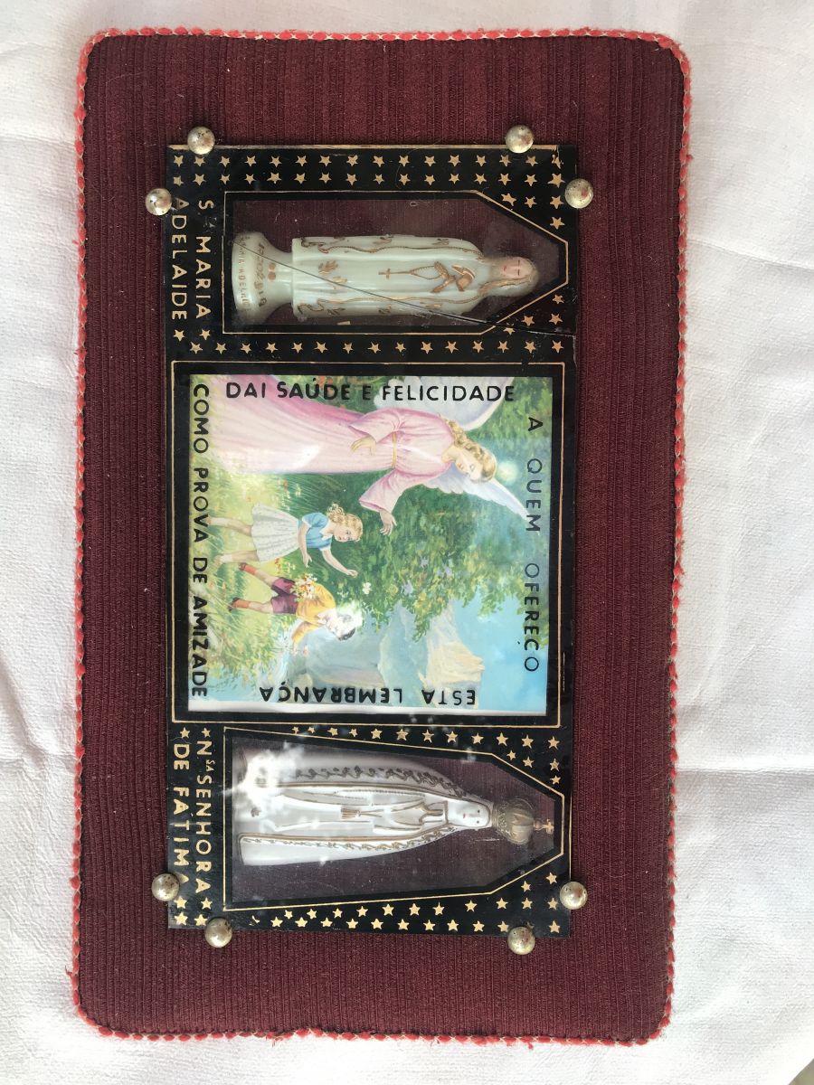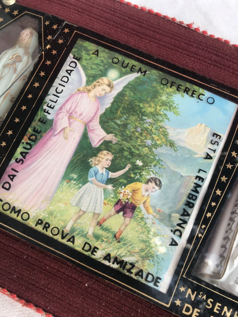 Tableau religieux décoratif, art populaire portugais se composant de deux fenêtres latérales renfermant deux statuettes de Saintes « Sainte Maria Adélaïde » et « Notre-Dame de Fatima ». Partie centrale, style année 40 illustration d’un ange et deux deux enfants.