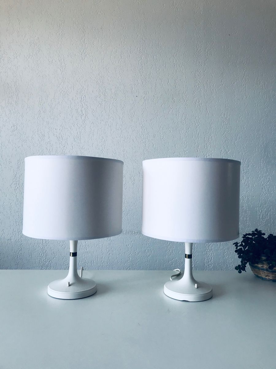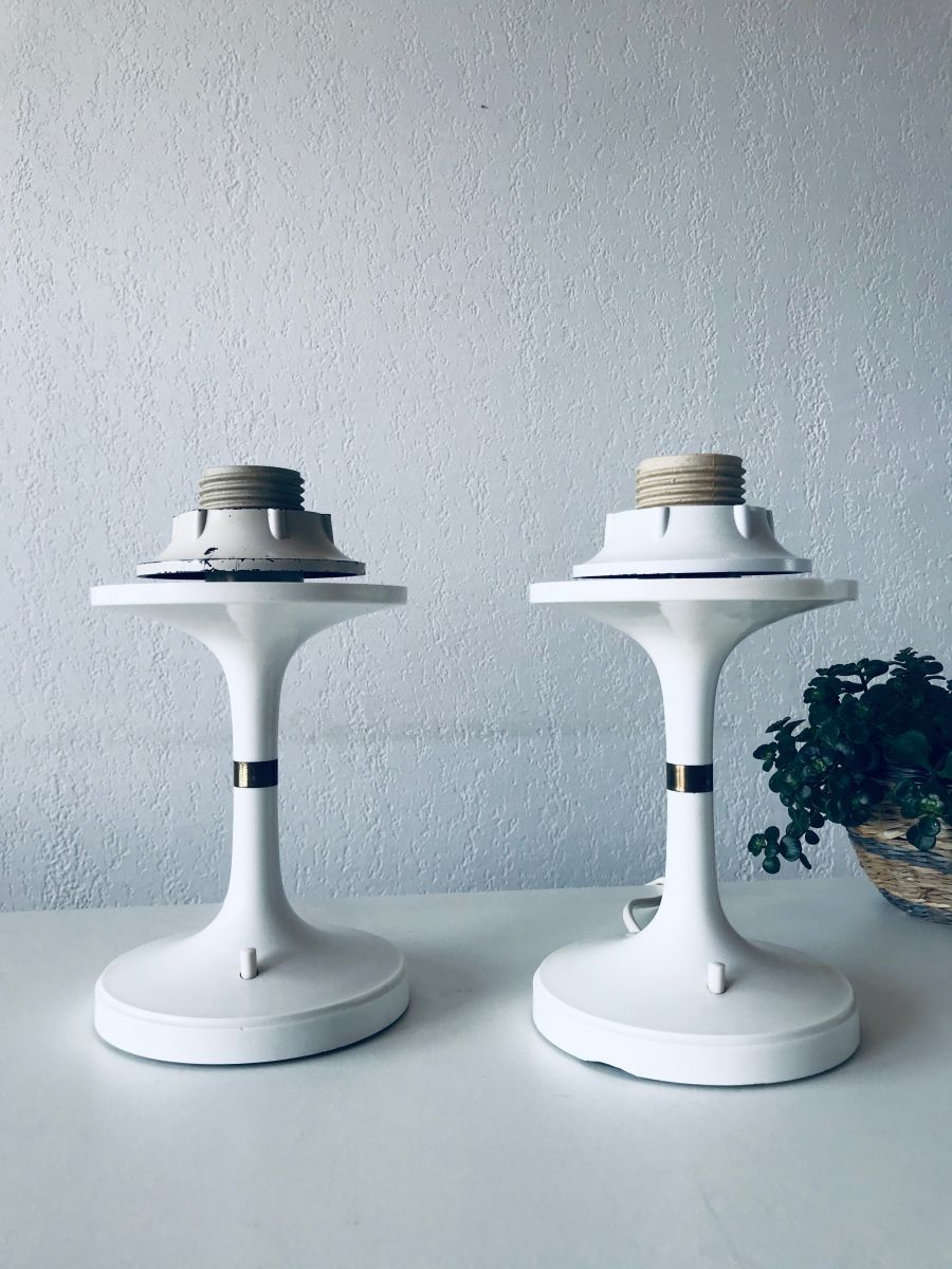 Jolie paire de lampe vintage ERCO des années 60. Le pied de ces lampes, en forme de diabolo, est très caractéristique des années 60. Il est en Bakélite blanc avec au milieu un anneau en laiton doré. Les abat-jours de forme tambour sont en papier cartonné blanc mat.
