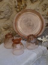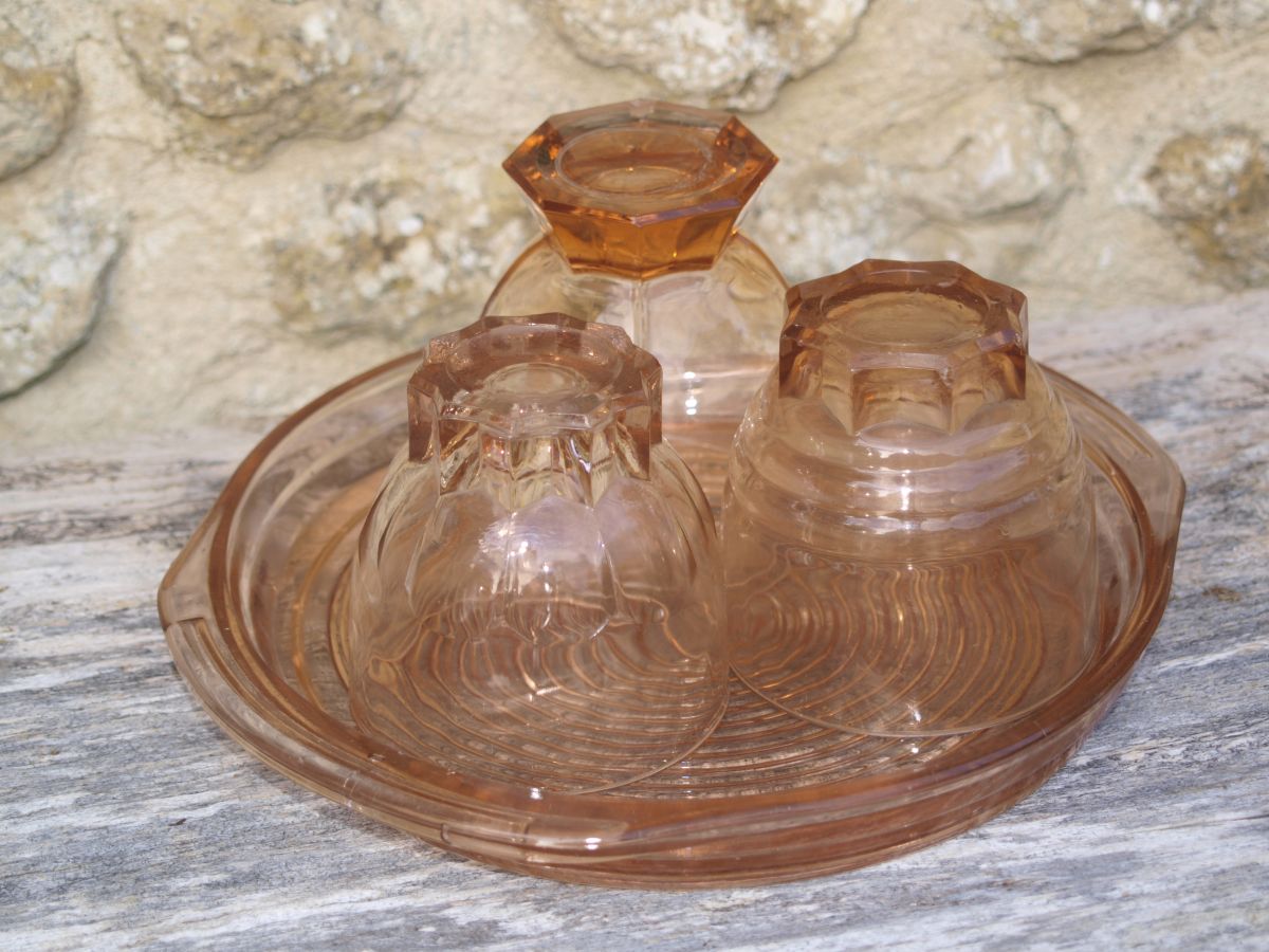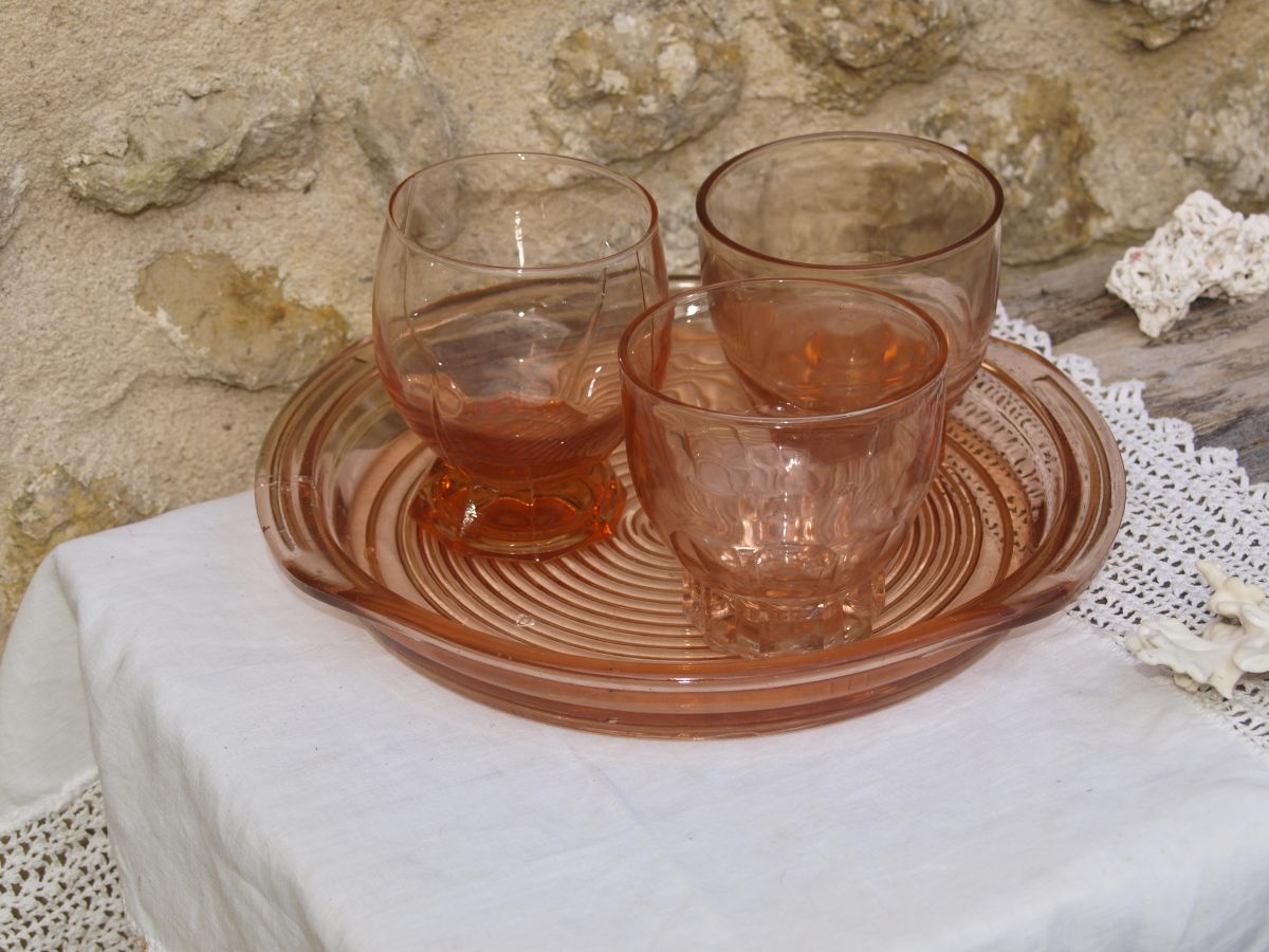 Voici un set recomposé plateau et 3 verres Art Déco rose fumé.