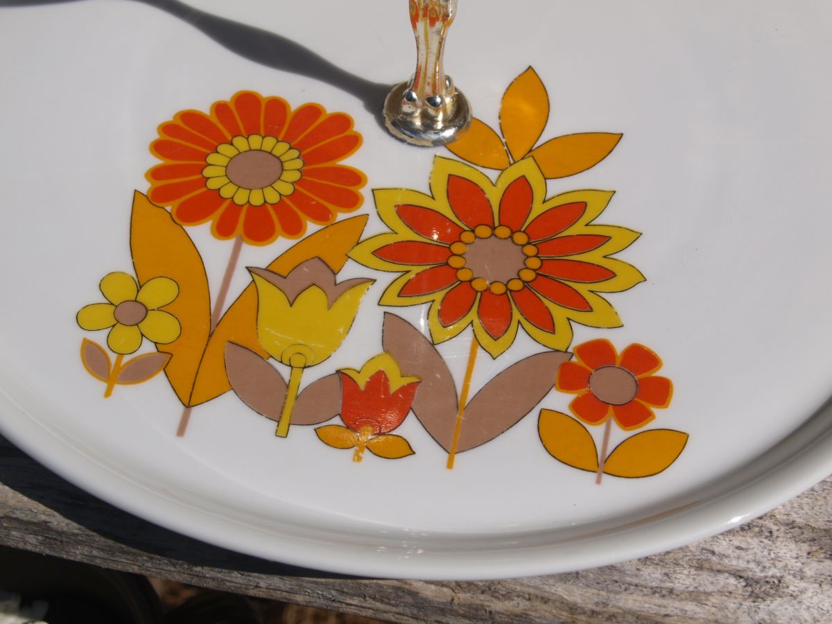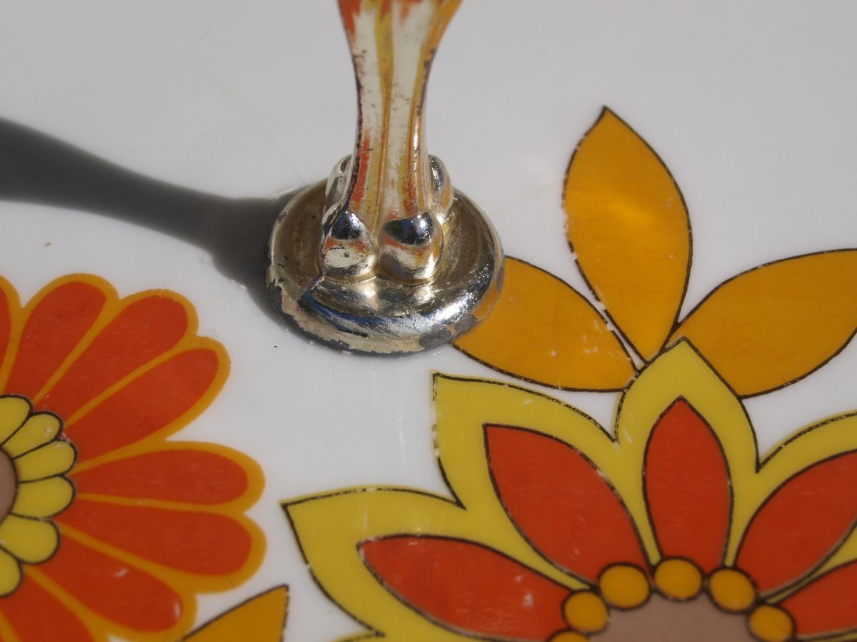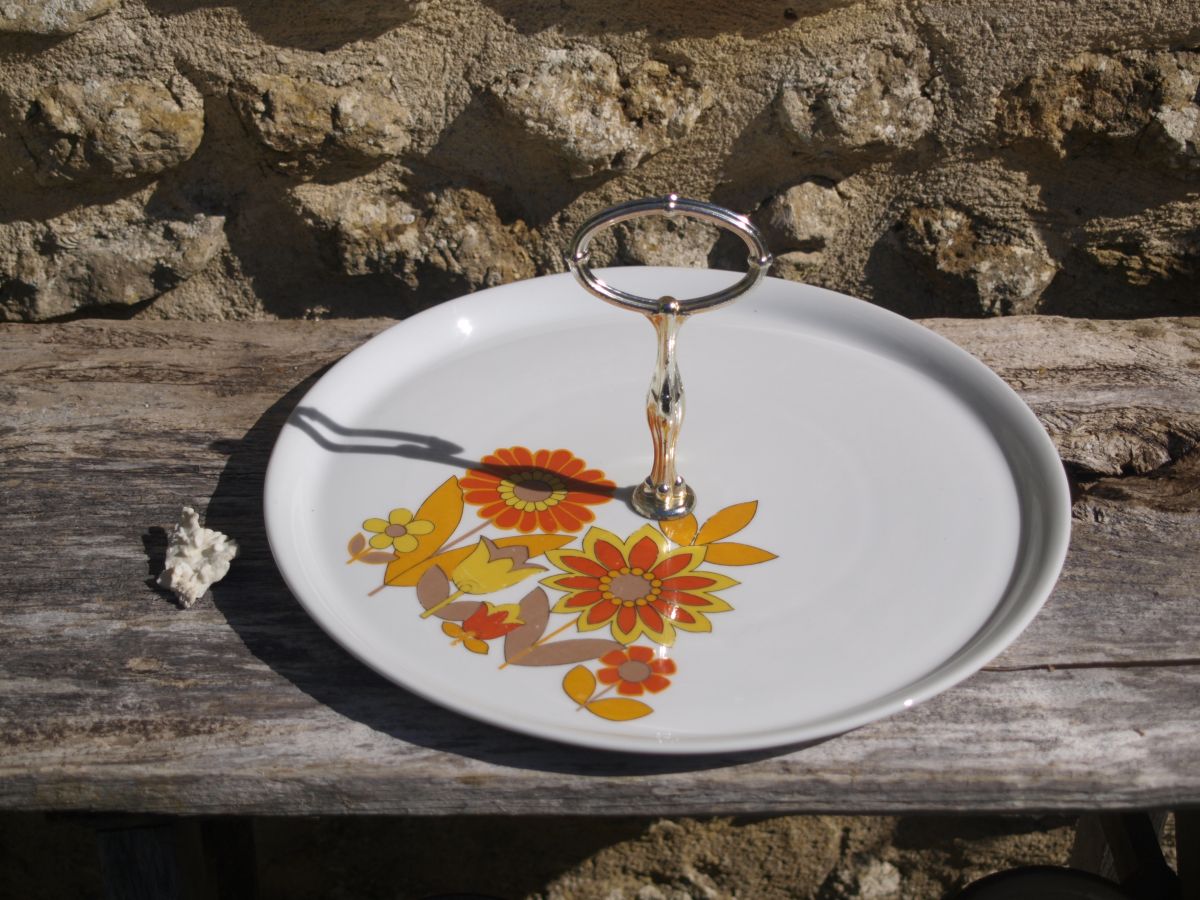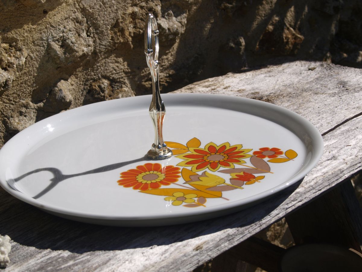 Voici un plateau à fromage vintage années 60/70 à décor fleuri orangé et poignée en métal argenté. Peut convenir également sur un buffet à la présentation d'amuse-bouches, etc.