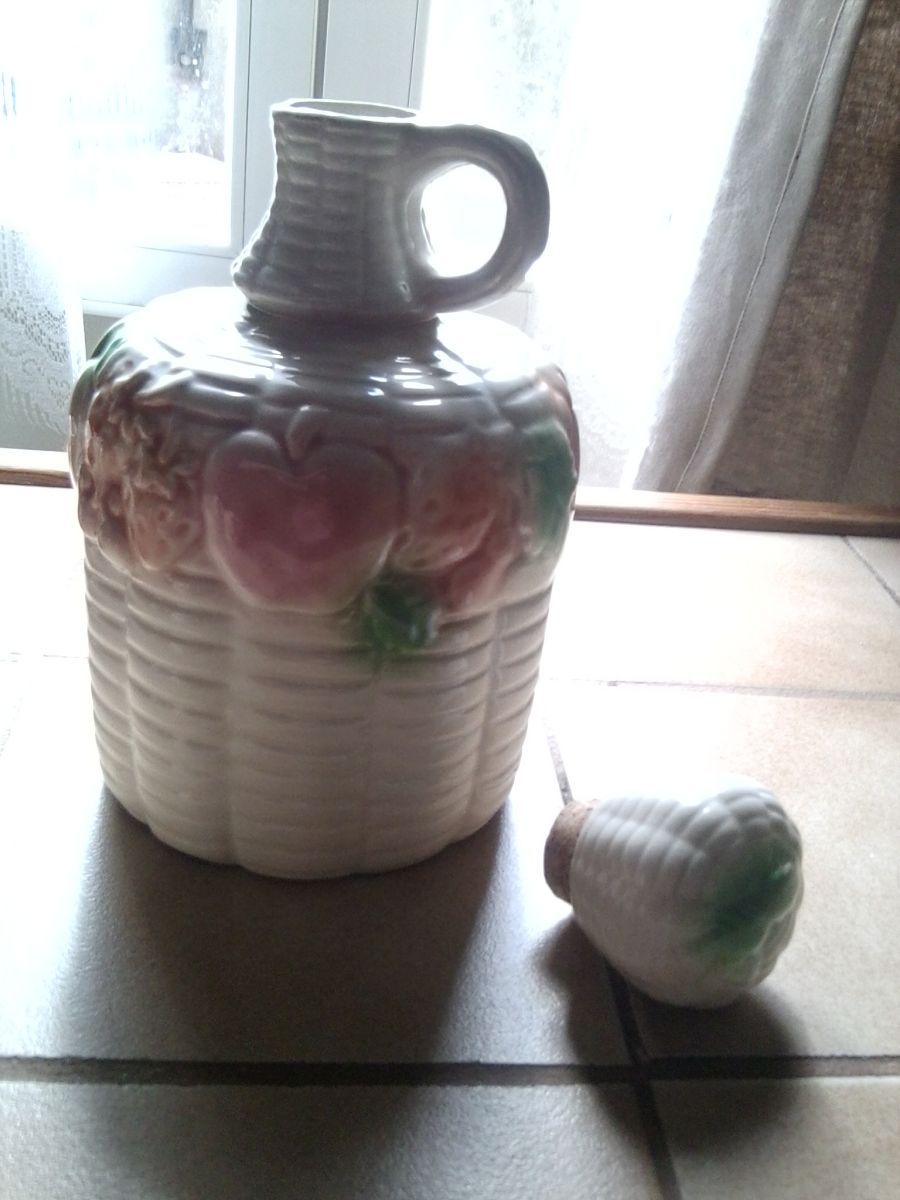 Joli service à liqueur ou rafraîchissement (comme je l'ai utilisé) ,tout doux , dans les tons pastels (rose, orange, vert et crème) aux motifs de pommes, fraises , cerises et feuilles. Il agrémente joyeusement les